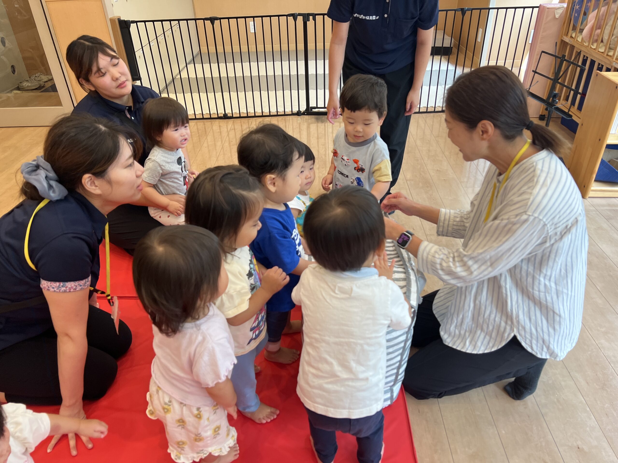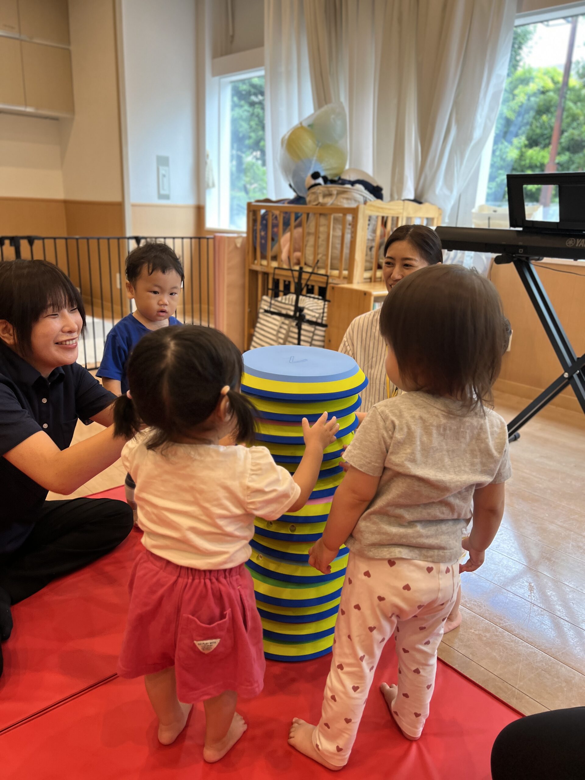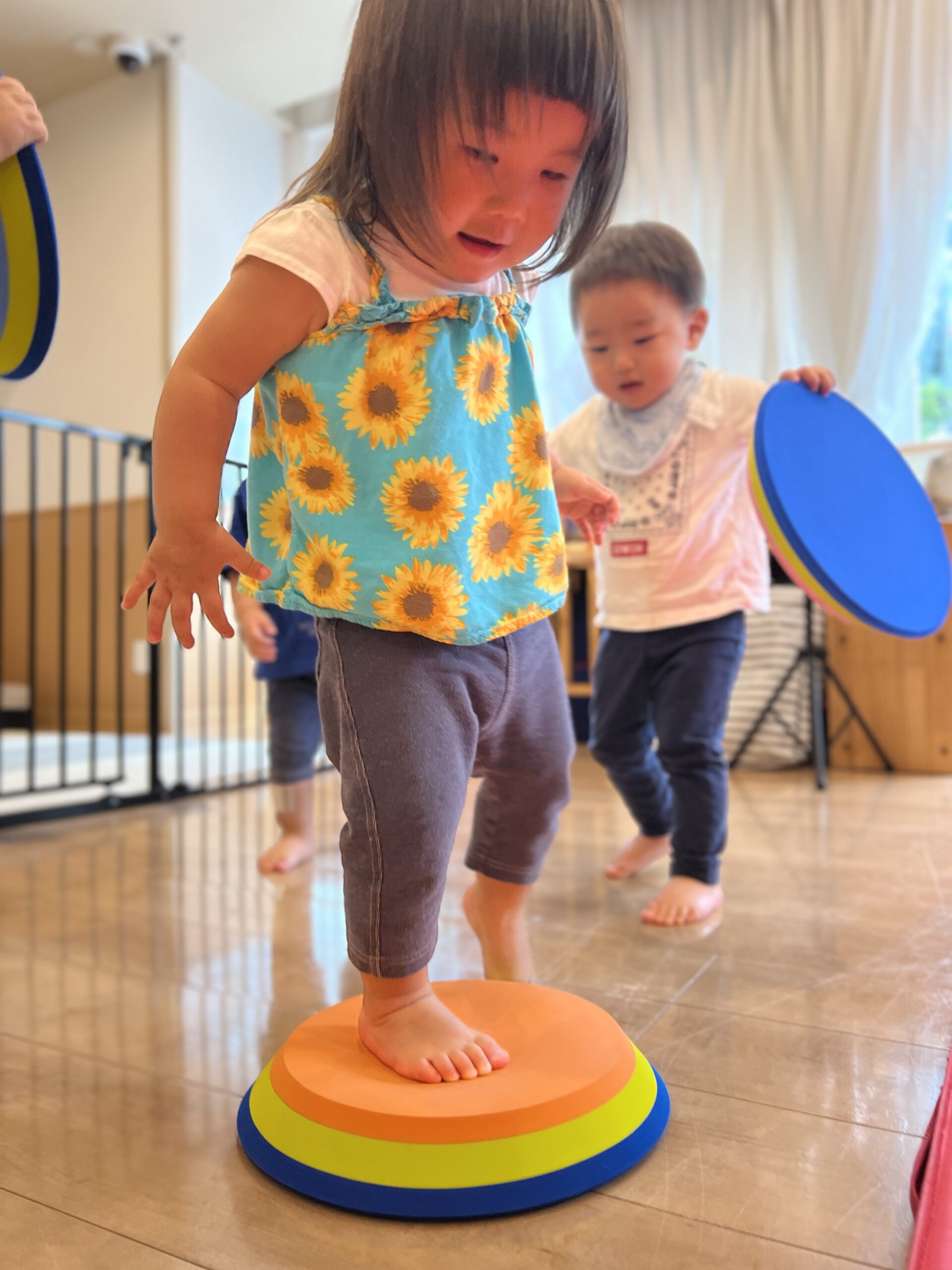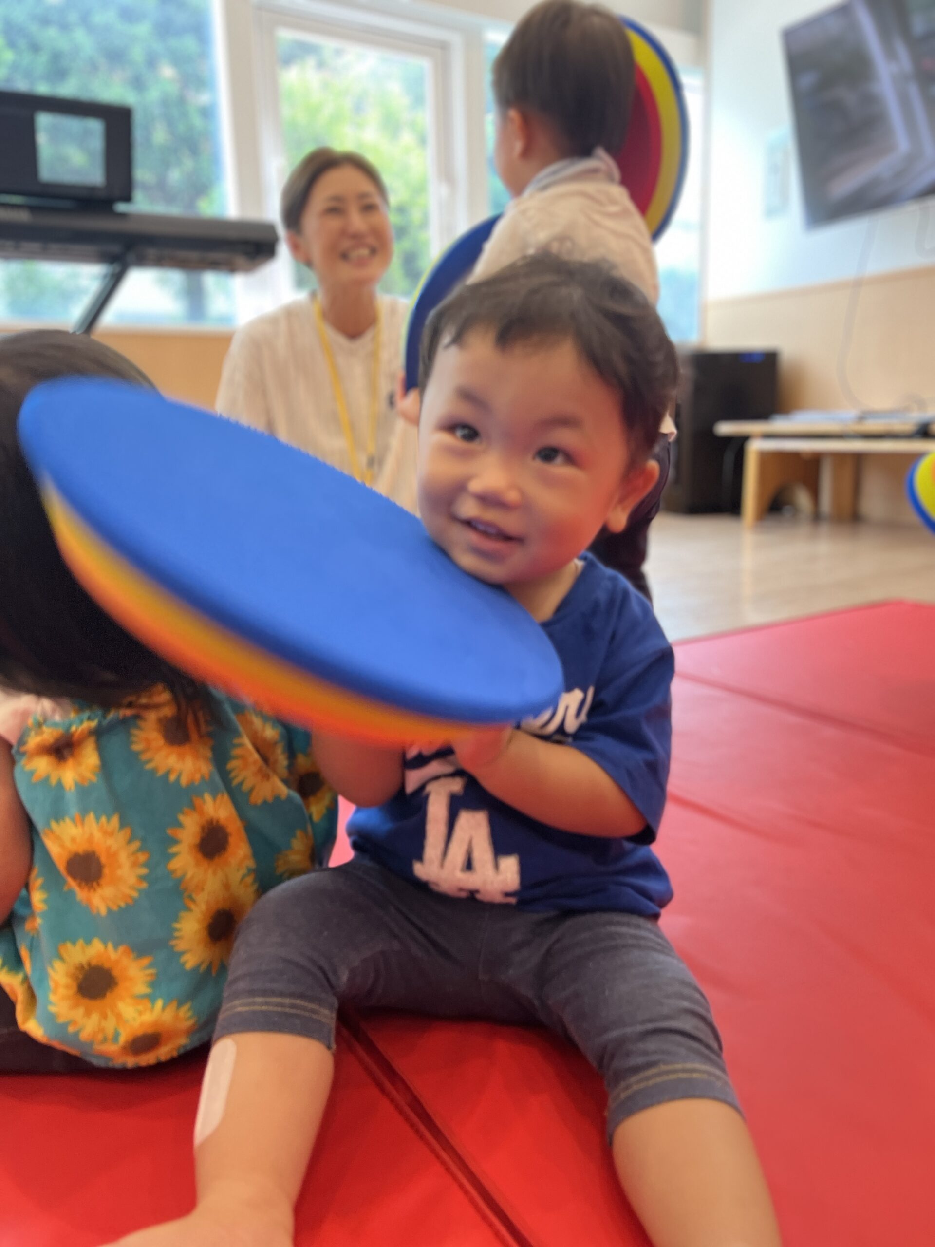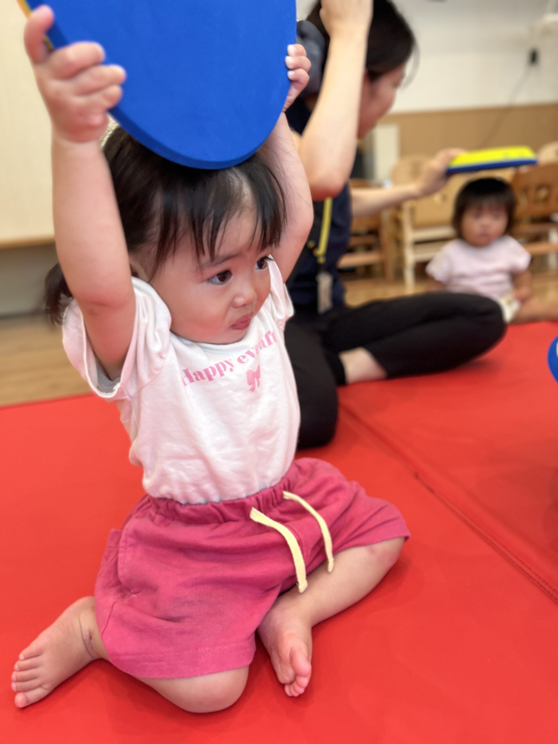 虹ぐみさんでは、1人ずつマットを踏んで歩き、タンバリンを目的地までもっていくミッションです!