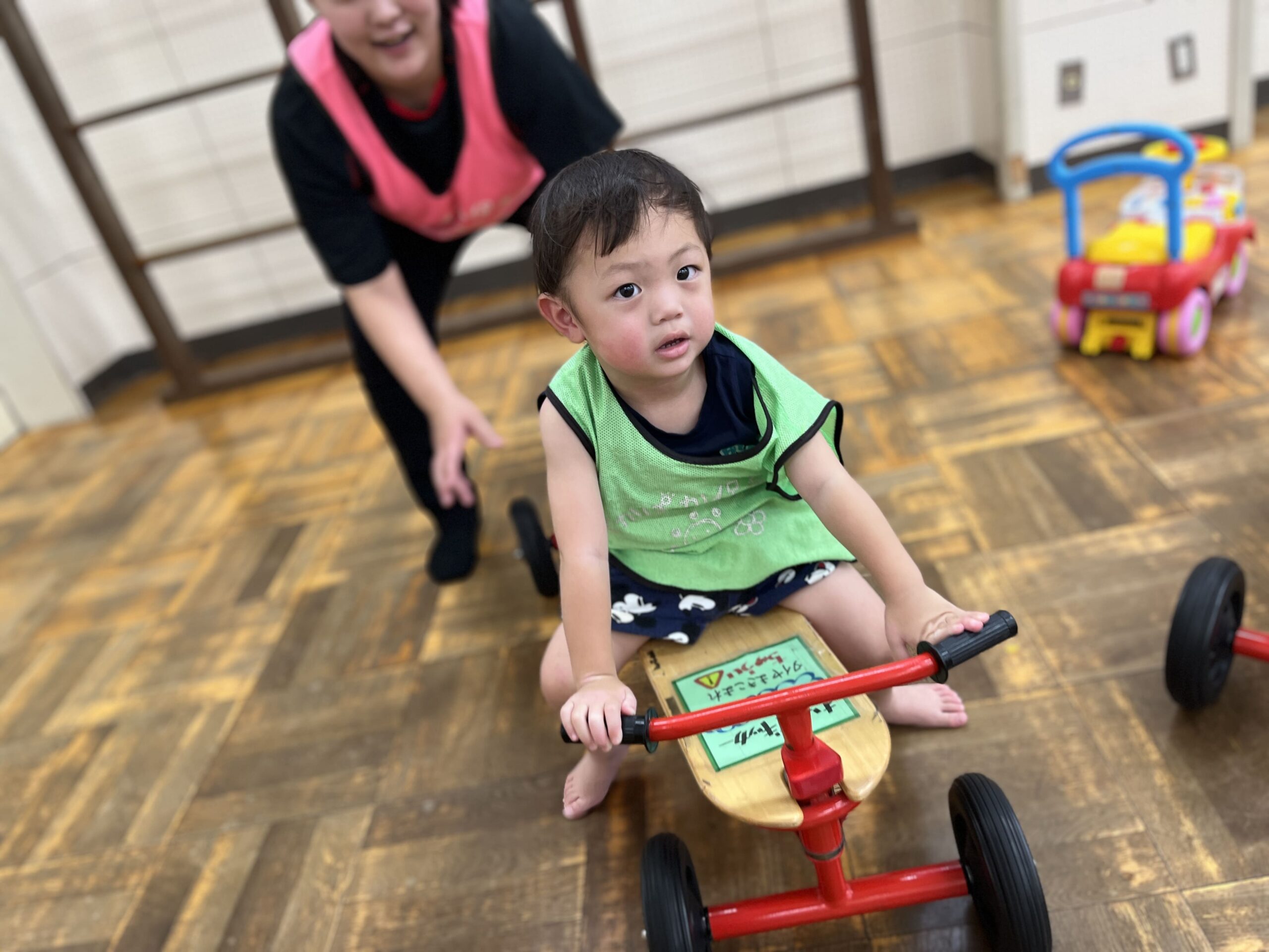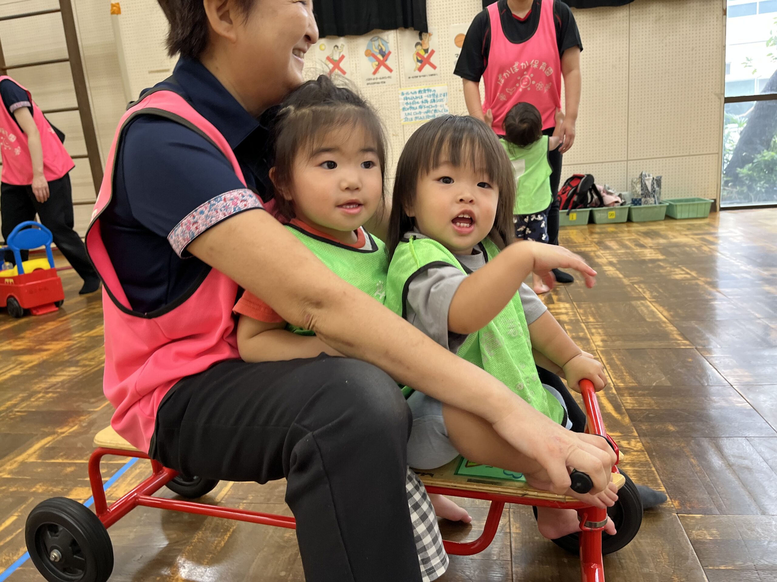 その後、1・2歳児の混合グループで近くの児童館へ行き、到着後はカラフルな乗用玩具で遊びました。足で蹴って進むタイプや、ハンドルを握ってクルクル回すタイプなど、友だちと順番を守りながら「もう1回!」と笑顔があふれ、大きなホールに元気な声が響き渡りました。
