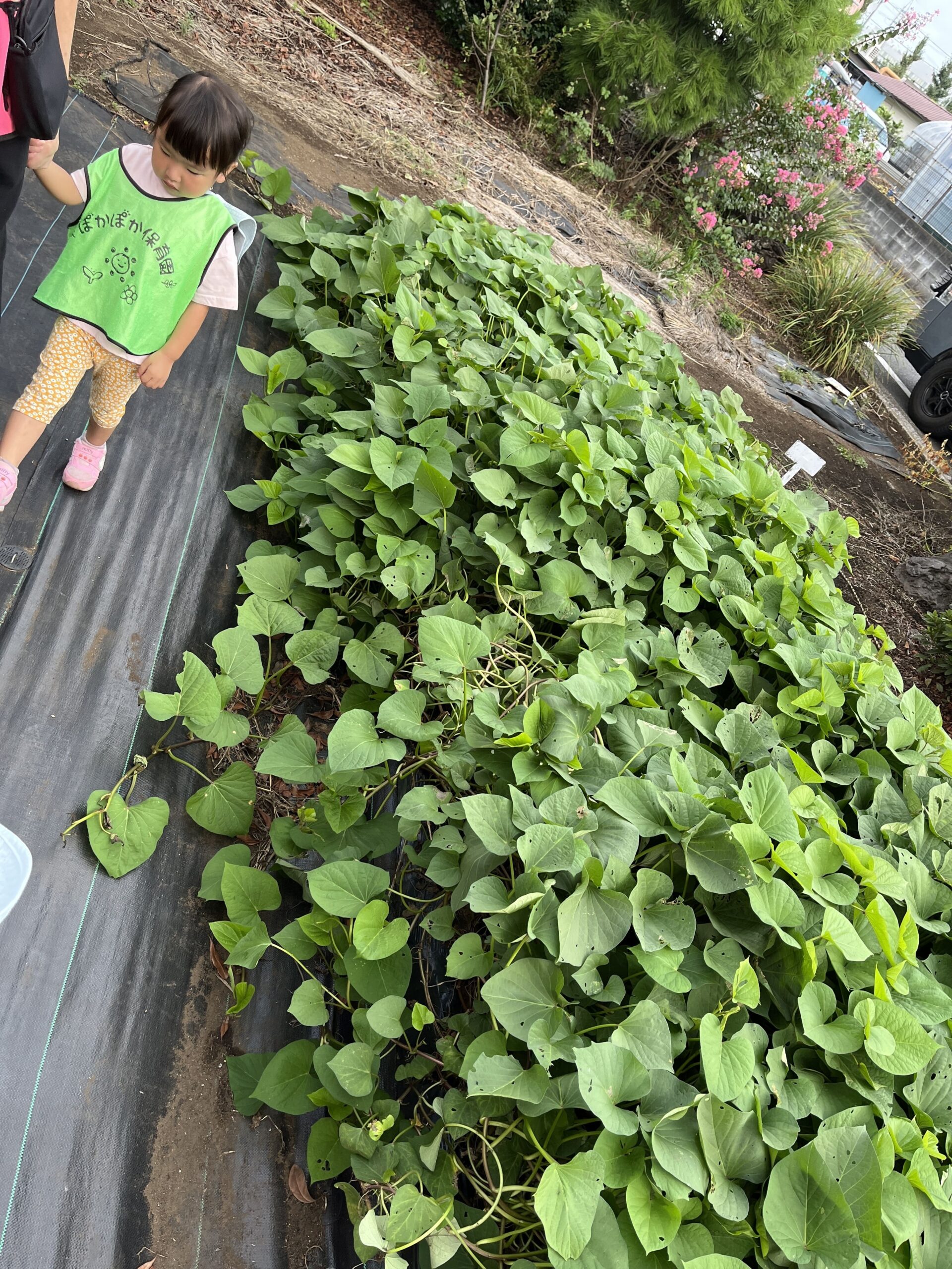 朝は畑に出向き、2歳児が植えたサツマイモの苗をじっくり観察。葉っぱやつるの伸び具合を目で確かめ、「緑がきれいだね」「大きくなってる!」と小さな声でつぶやく姿がありました。苗に触れるとひんやりした感触が手に伝わり、自然に親しむ貴重な時間になりました。