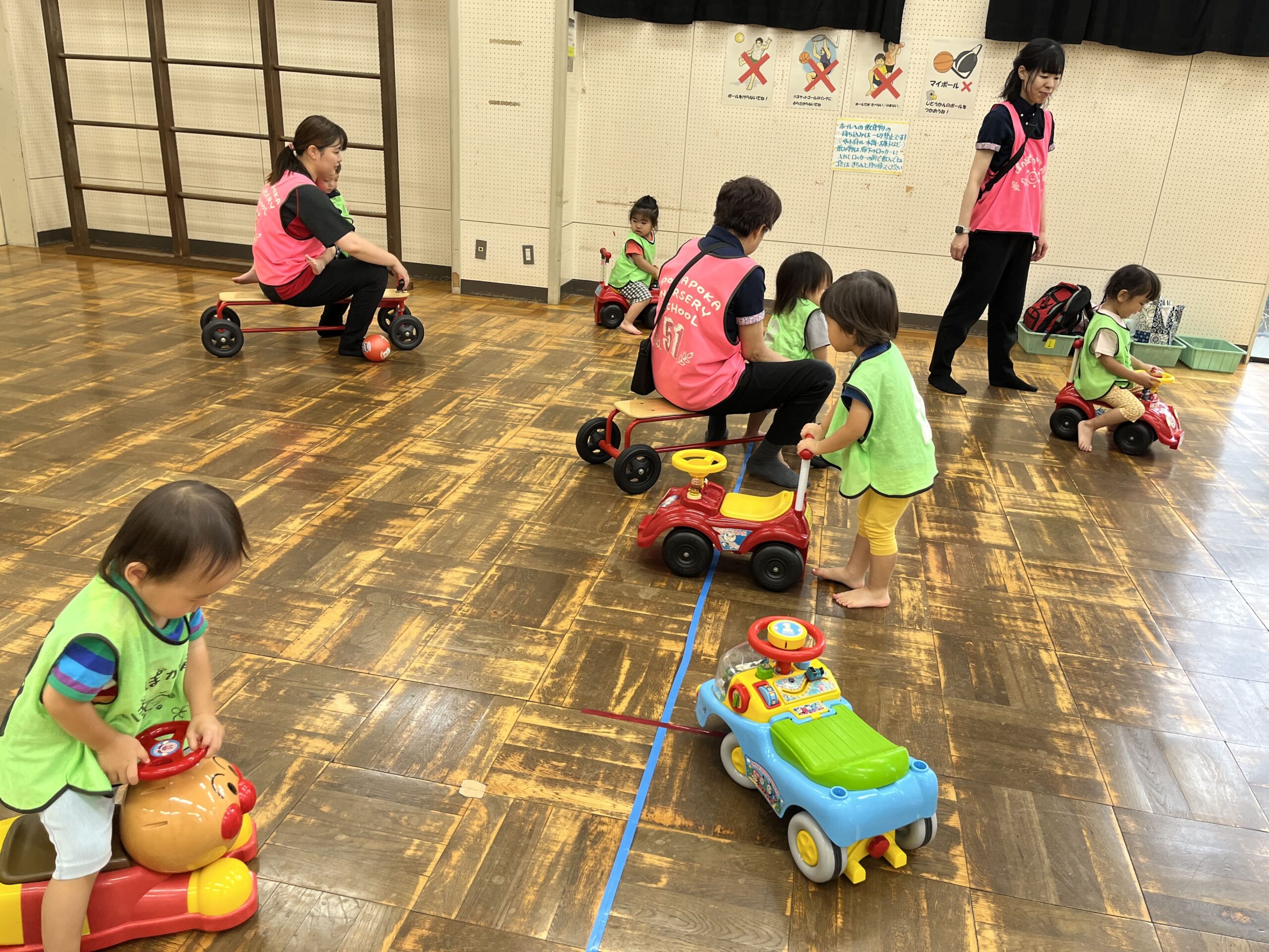 その後、1・2歳児の混合グループで近くの児童館へ行き、到着後はカラフルな乗用玩具で遊びました。足で蹴って進むタイプや、ハンドルを握ってクルクル回すタイプなど、友だちと順番を守りながら「もう1回!」と笑顔があふれ、大きなホールに元気な声が響き渡りました。