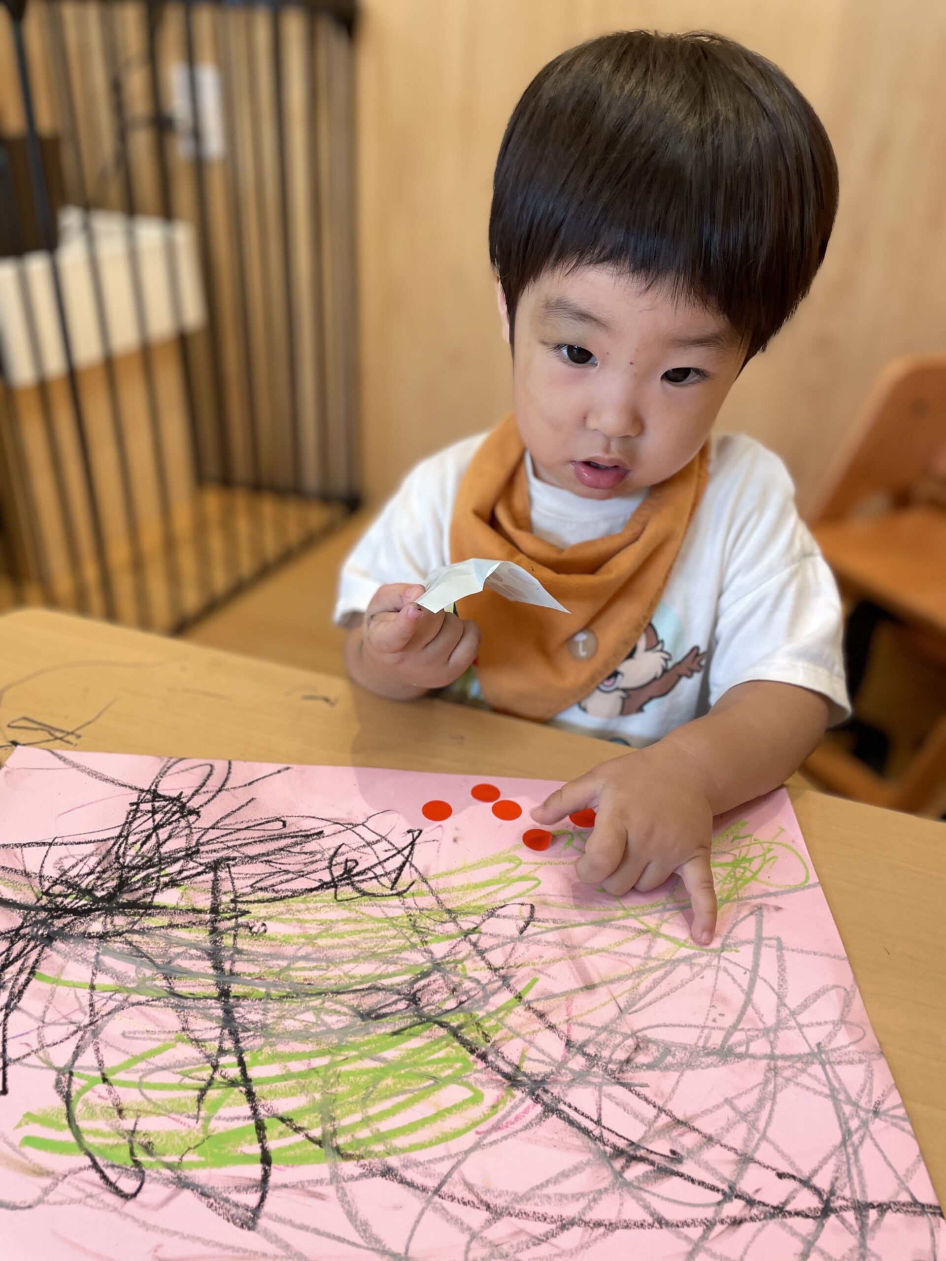 0歳児のお友だちもシールに挑戦、貼れなくてもこの感触からいろいろ考えて、、次につながっていくのです。