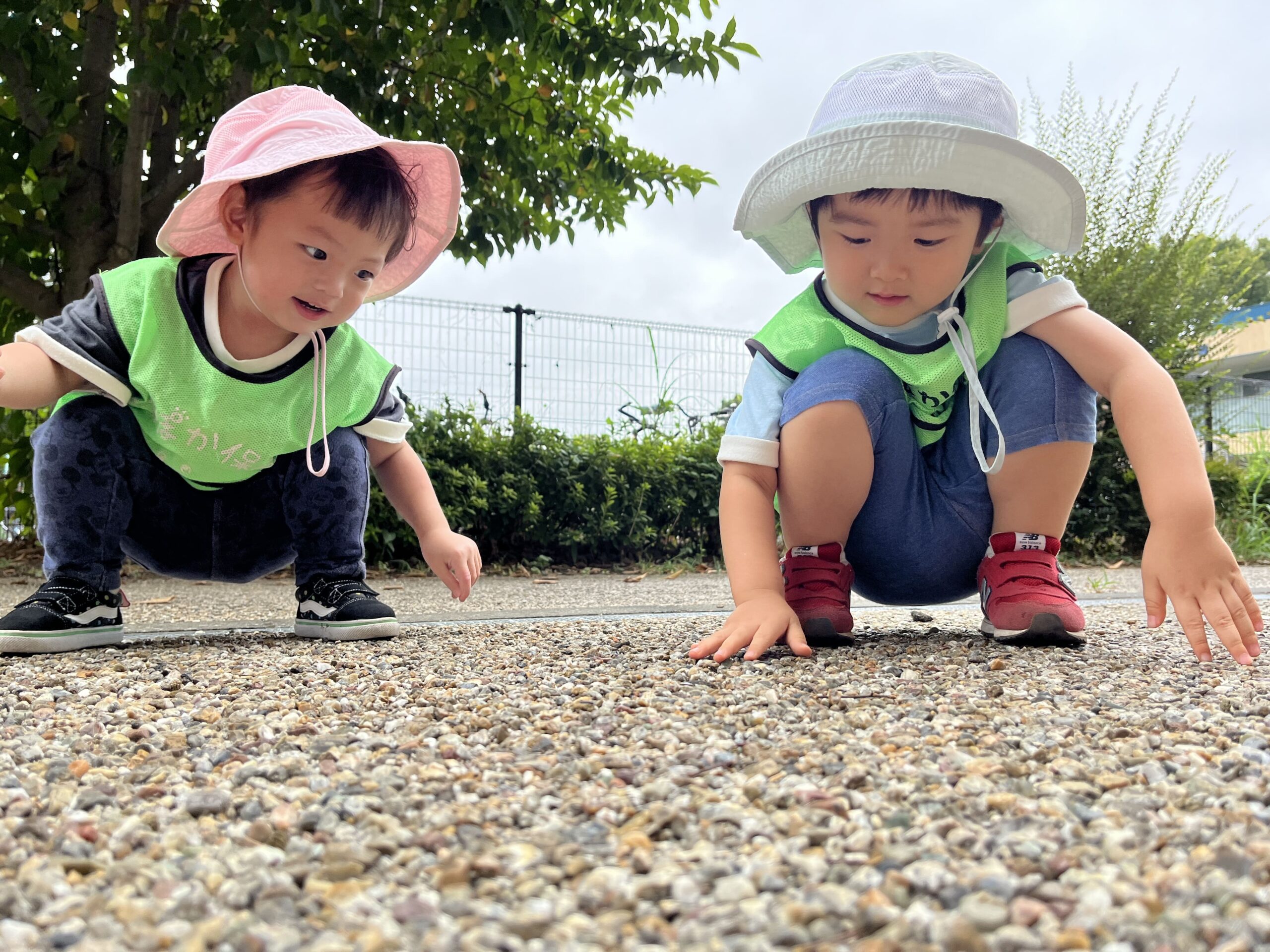 ほかにもお友だちと一緒に小石探しに夢中になり、地面をじっと見つめる子もいました。お気に入りの石は見つかったかな??