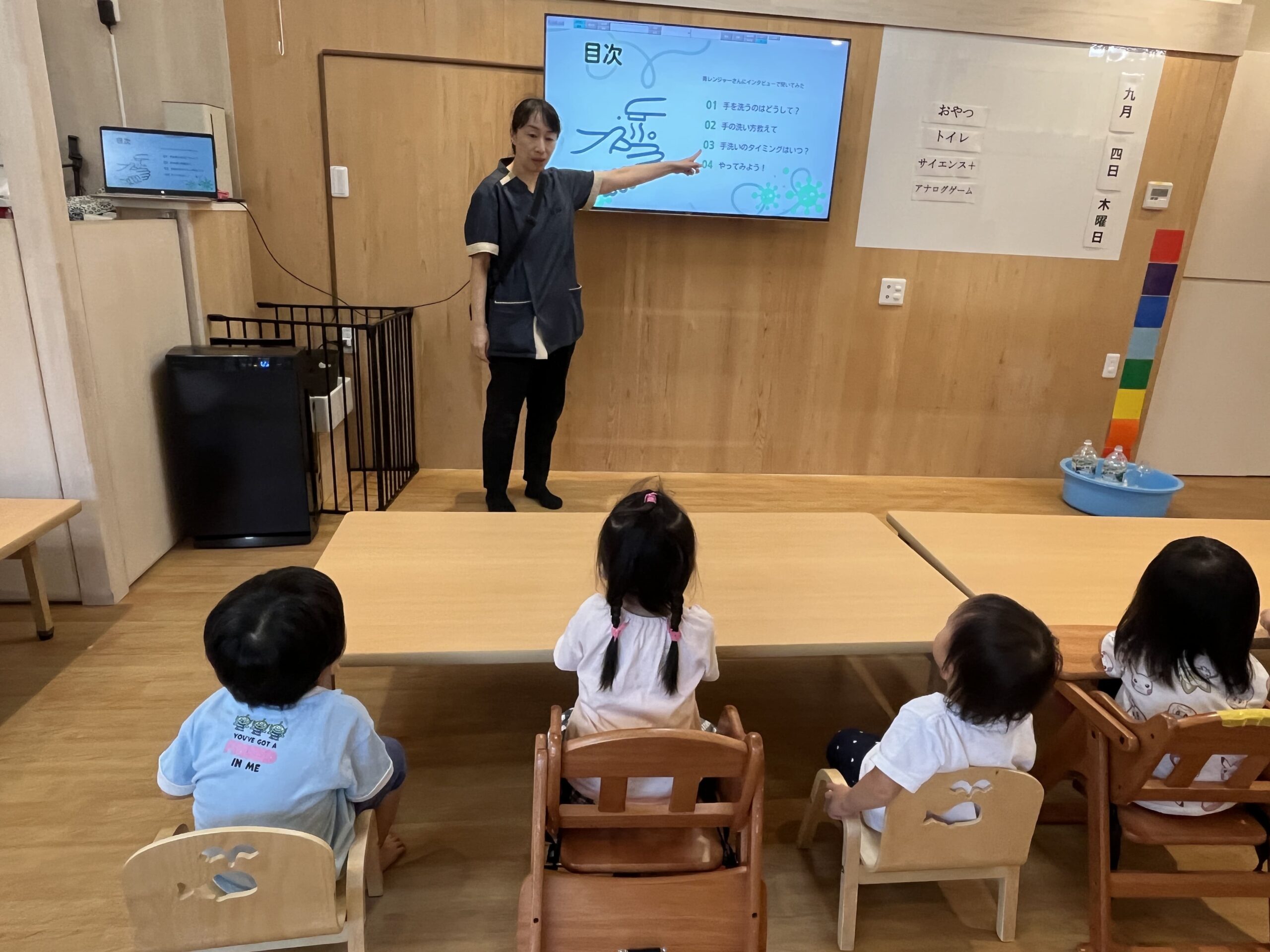 今回は看護師の先生による「手洗い」のお話をスライドを見ながら聞きました。スライドには、手についたばい菌を泡でしっかり落とす様子や正しい洗い方のポイントが映し出され、子どもたちは真剣な眼差しで画面を見つめていました。「手のひら、指の間、手首も忘れずにね」といった説明に、大きくうなずきながら聞き入っている姿が印象的でした☆