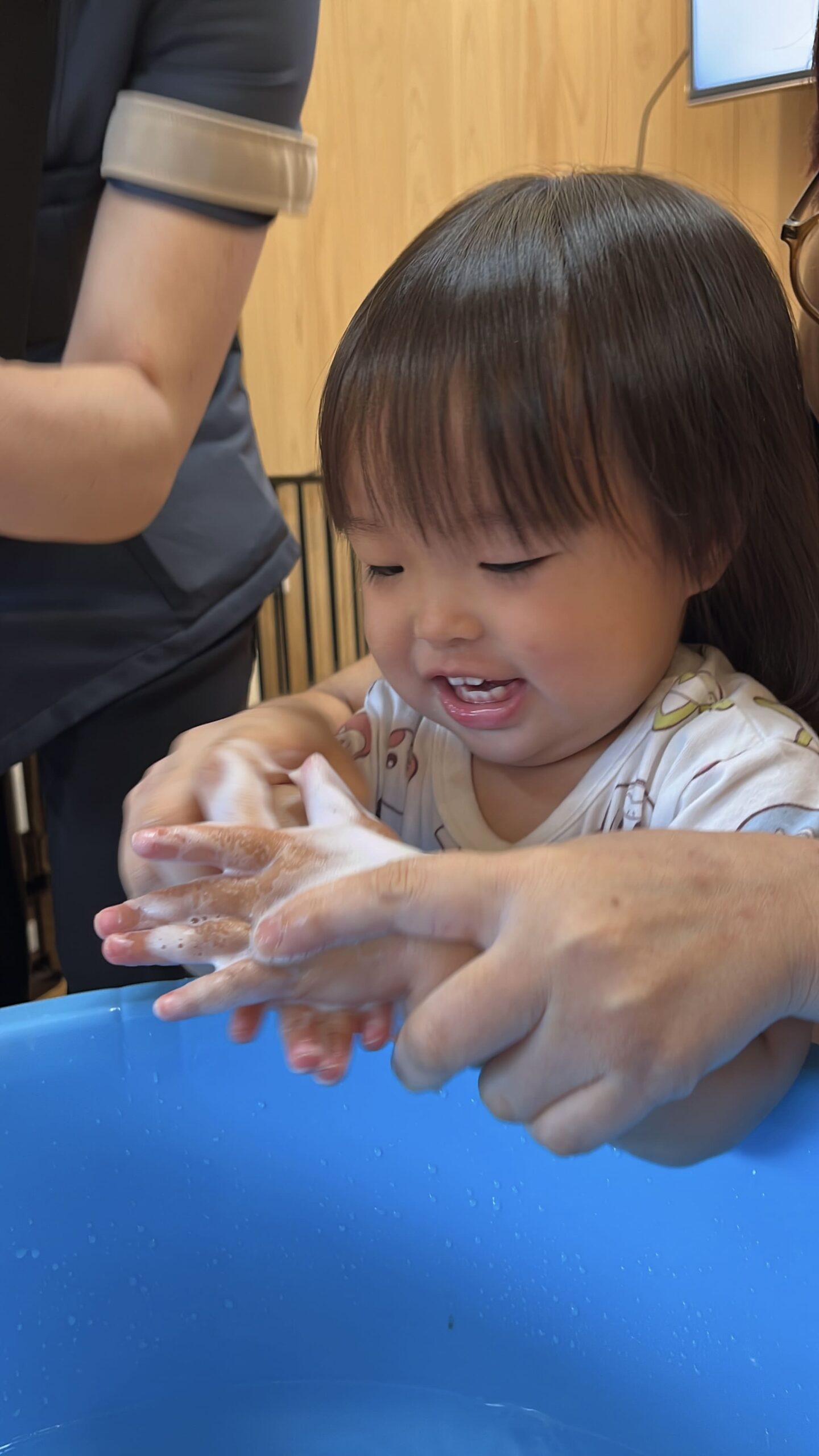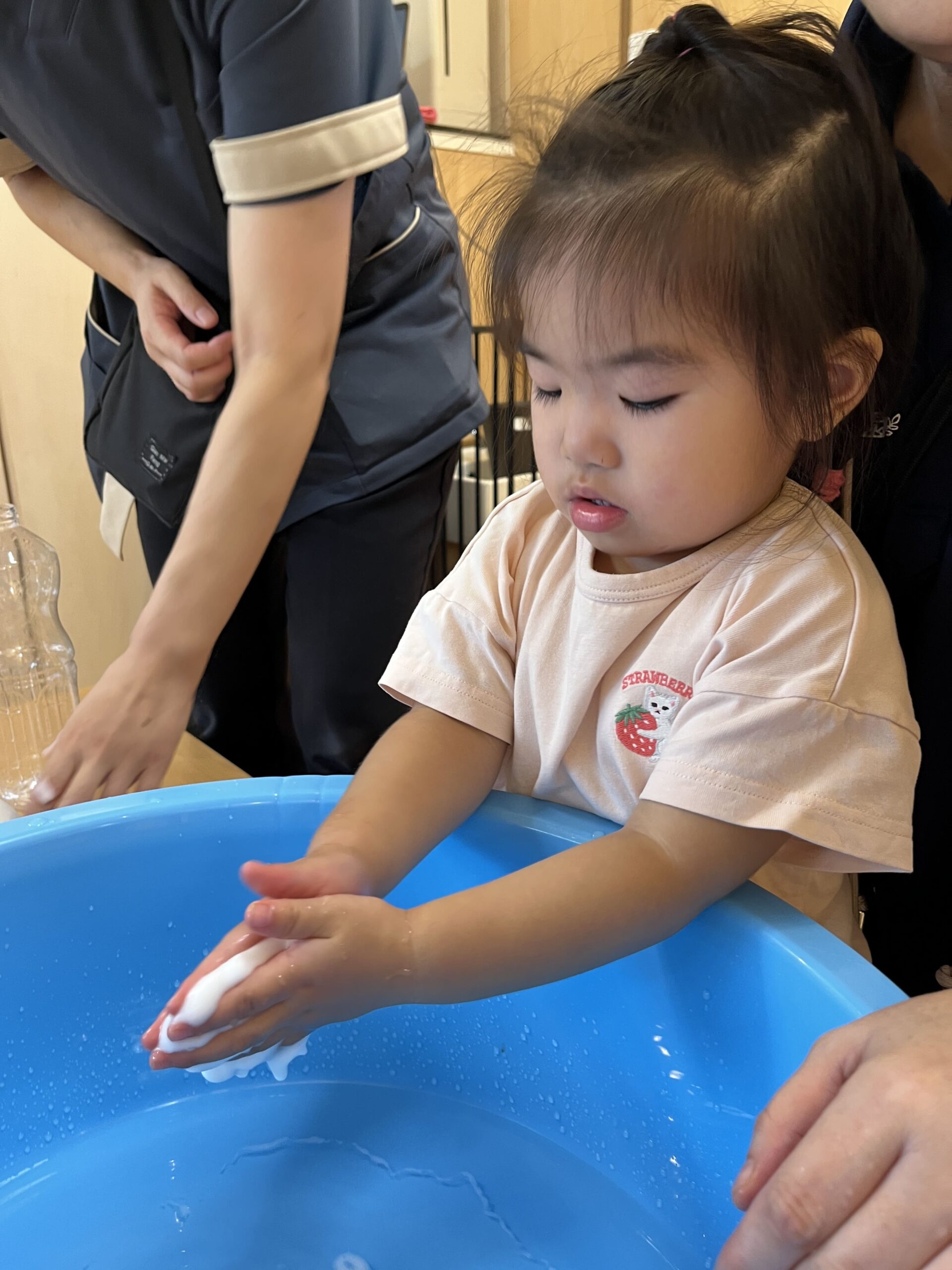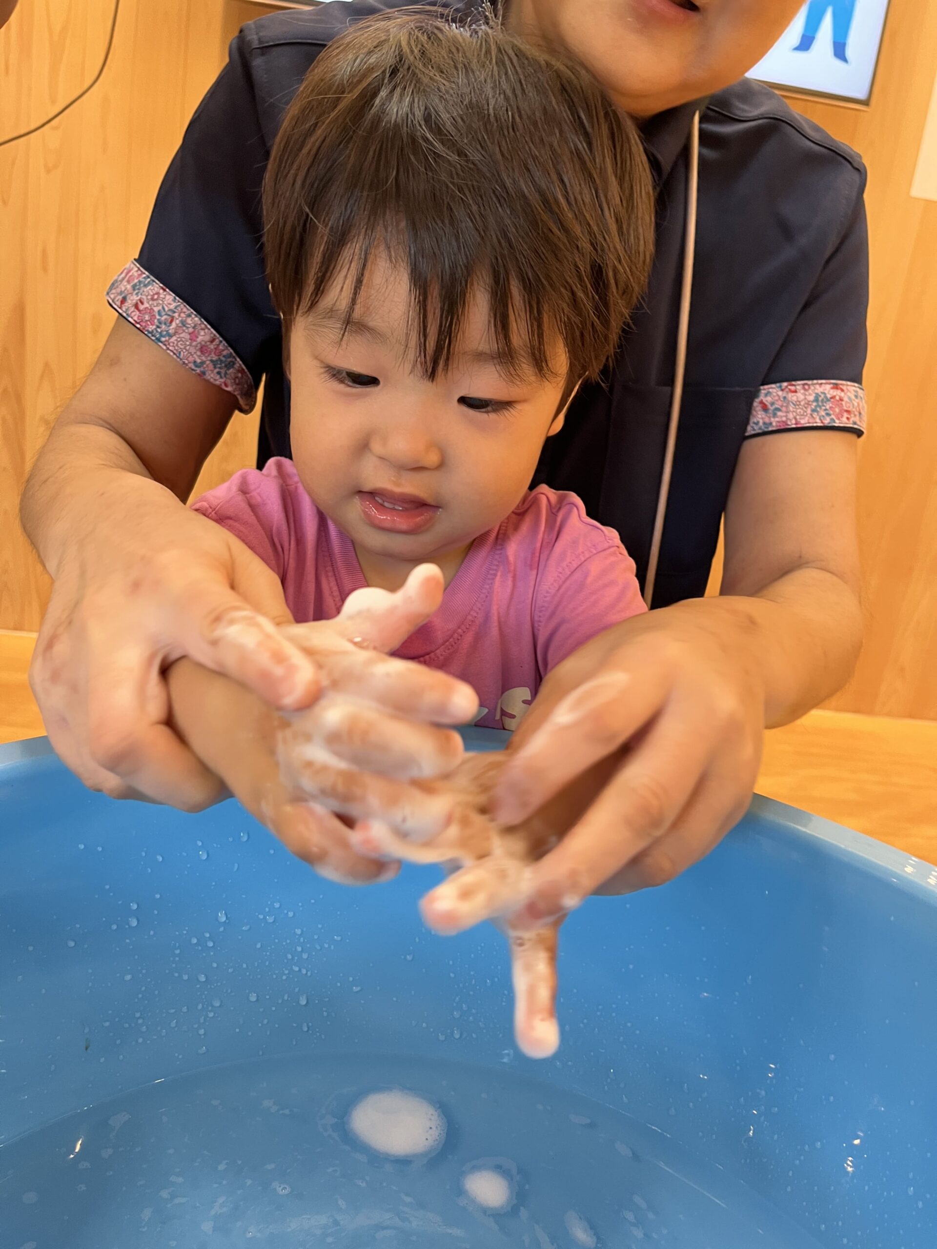 テーブルにタライを置いて泡のついた手をゴシゴシと丁寧にこすり合わせます。「こことここをゴシゴシ」「いい泡立ちだね」と声を掛け合いながら、自分でしっかり洗えていました。ペーパータオルで拭く一連の動作もスムーズです。見守っていた先生が「とっても上手!」と感心するほどでした!