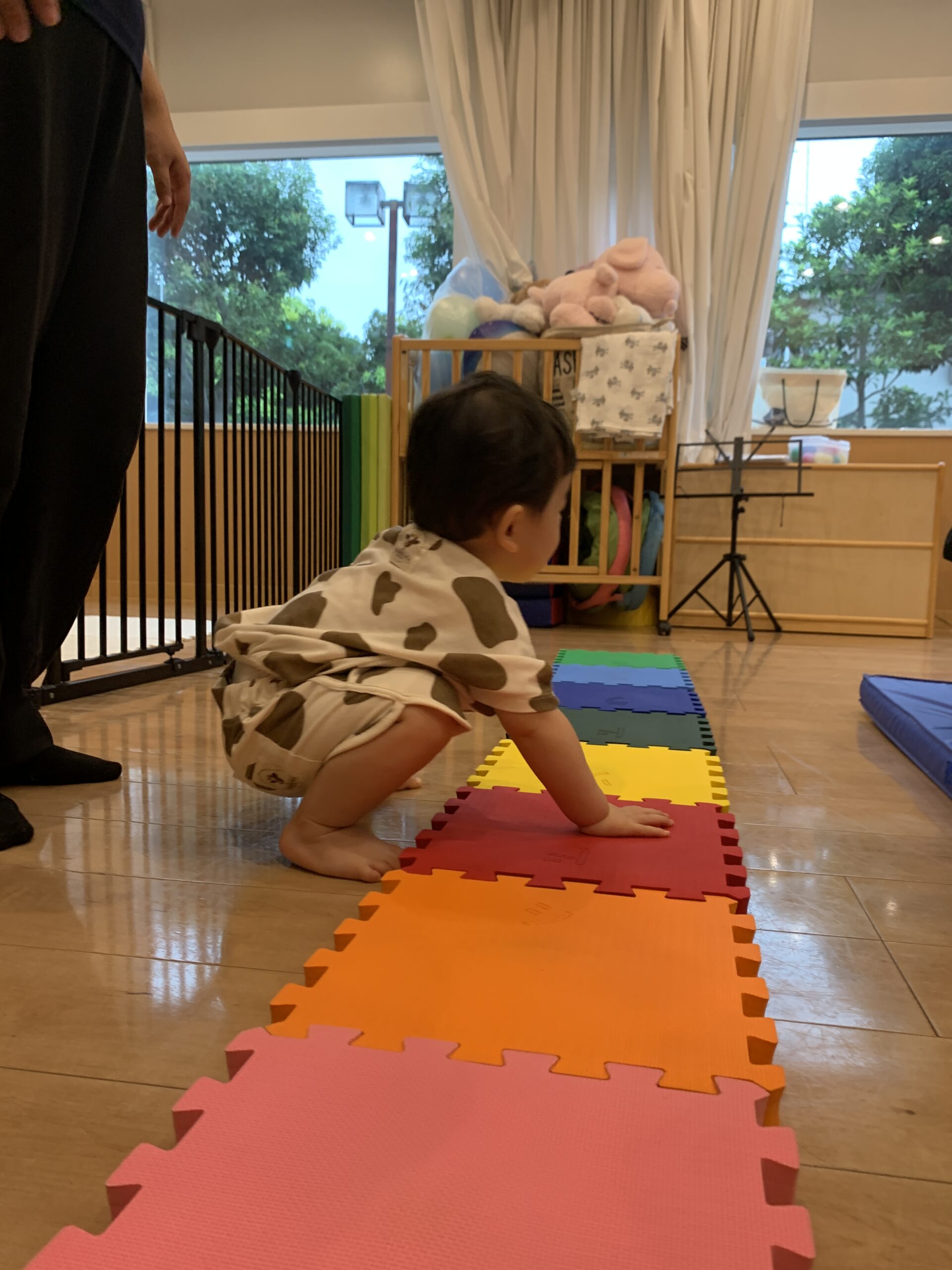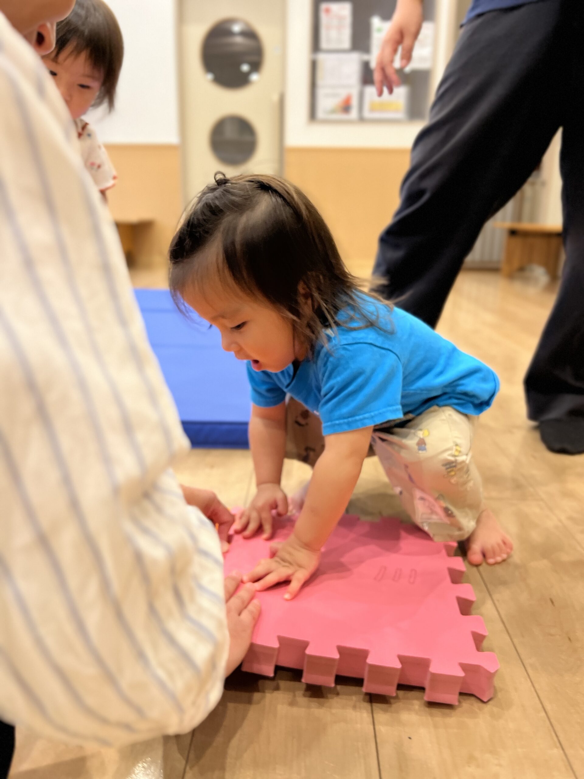 青空ぐみさんでは、よく見て、手で触れて押してみたり・・・マットの観察。