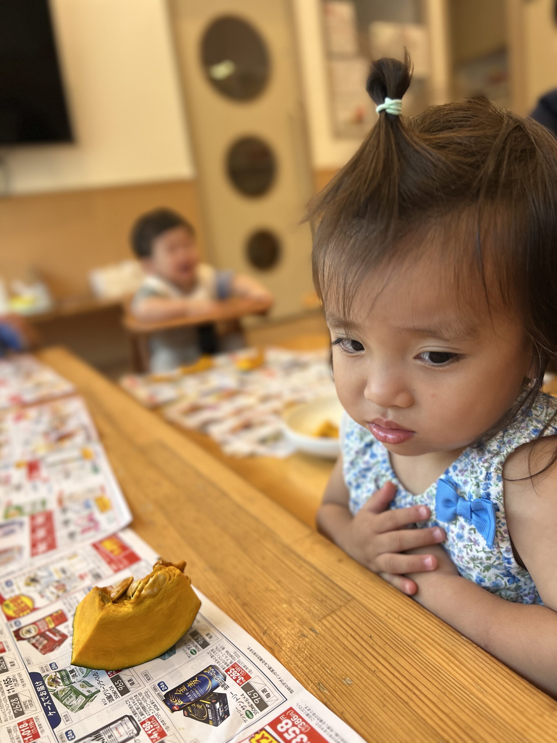 器用に種を掻き出す子もいれば、感触にびっくりして「変なのー!」と、