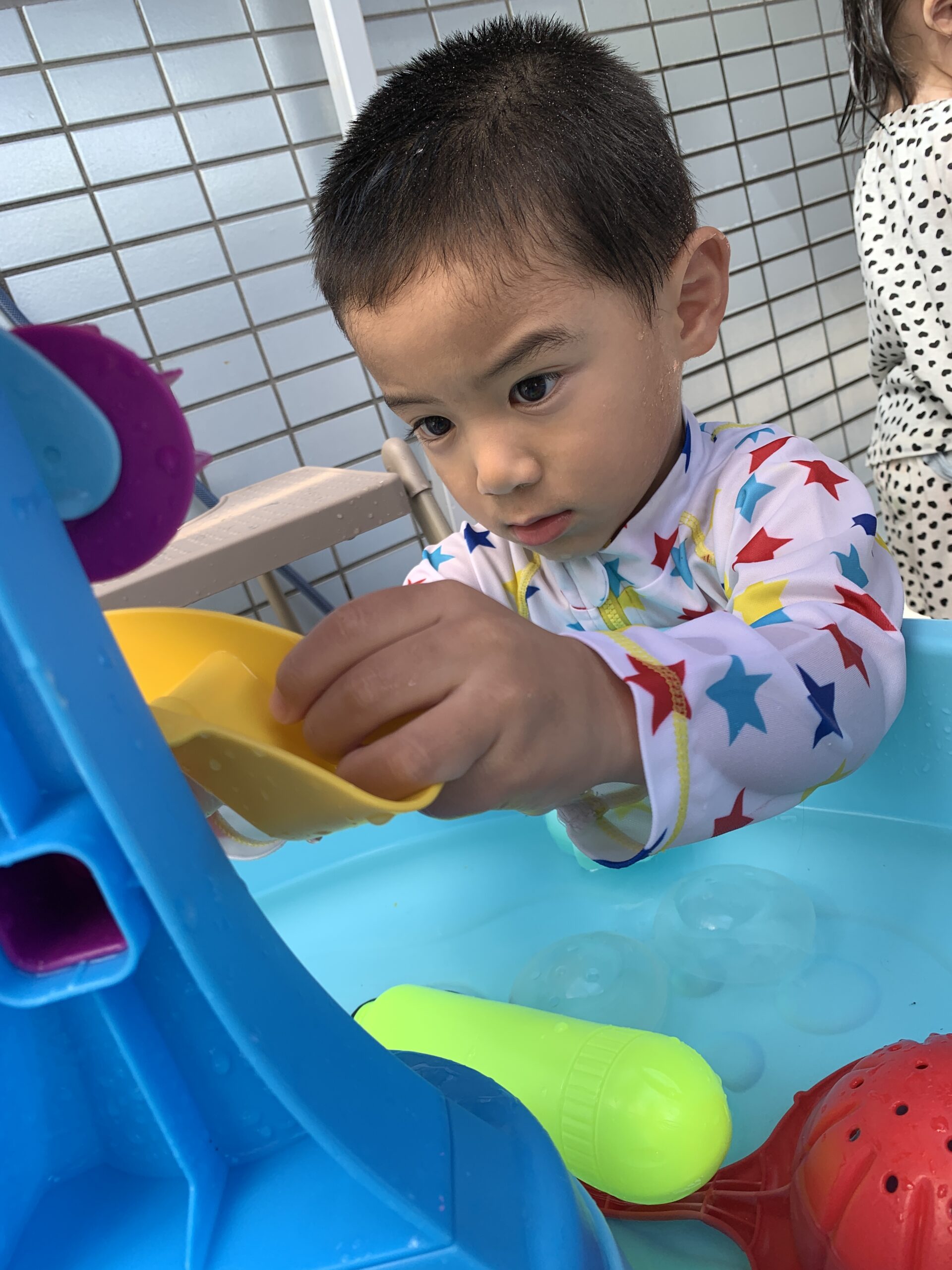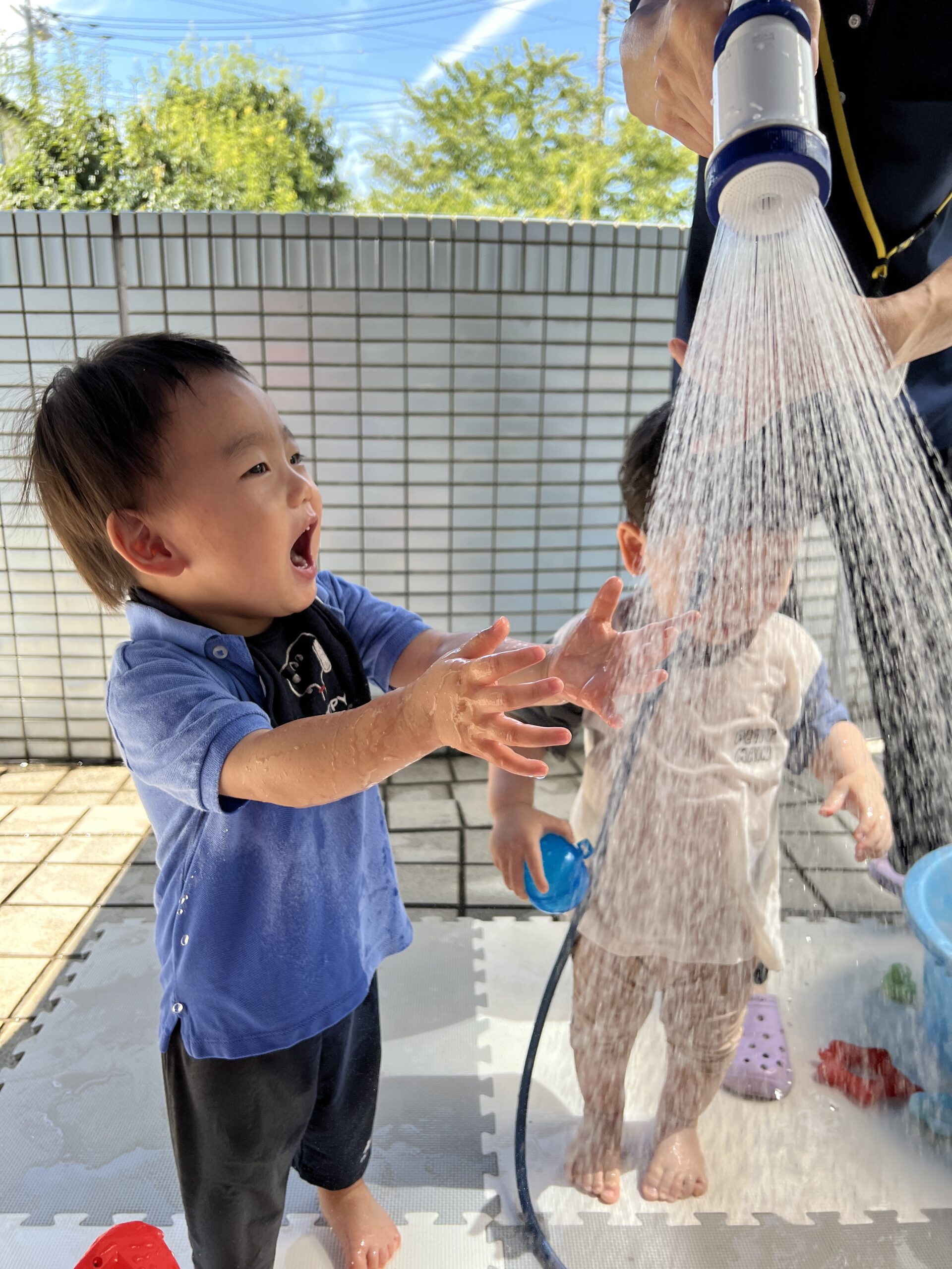 テラスに出て、ひんやり気持ちの良い「水遊び」の時間です!