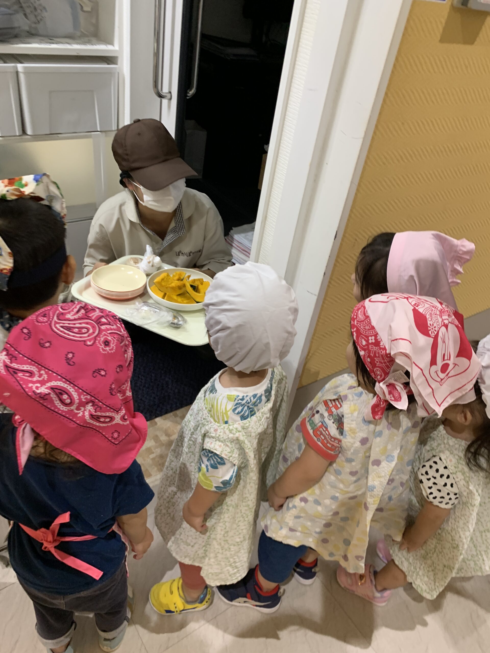 午前中、みんなが目を輝かせたのは、給食室からやってきた大きなかぼちゃ!