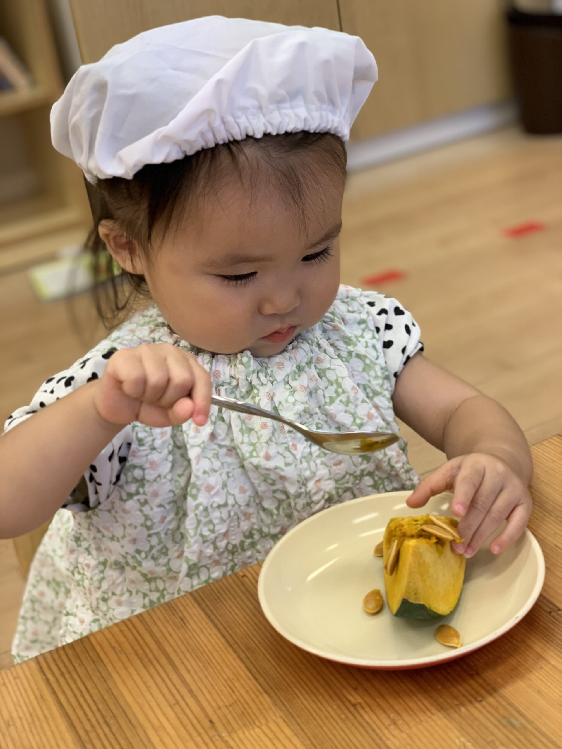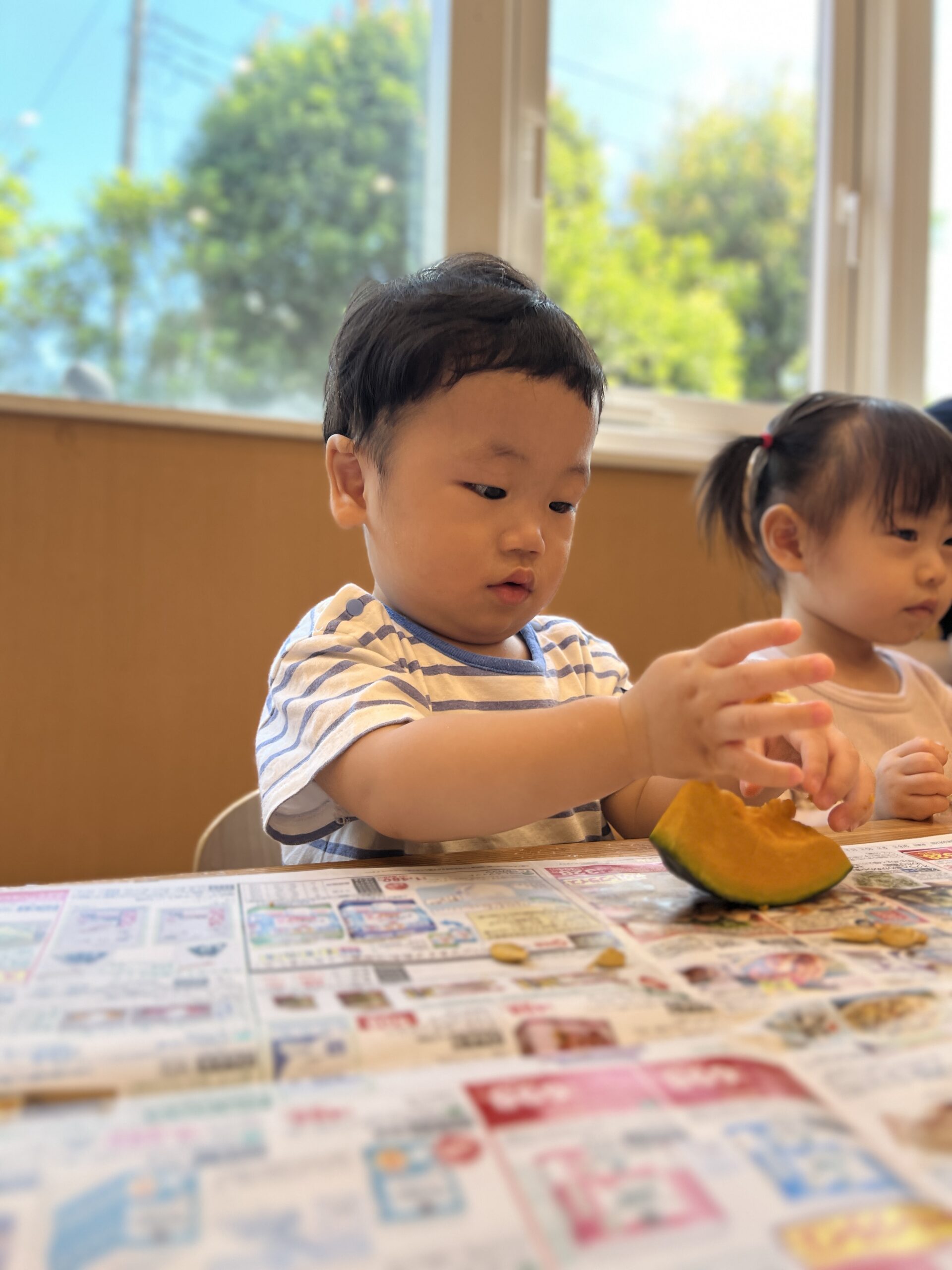 器用に種を掻き出す子もいれば、感触にびっくりして「変なのー!」と、