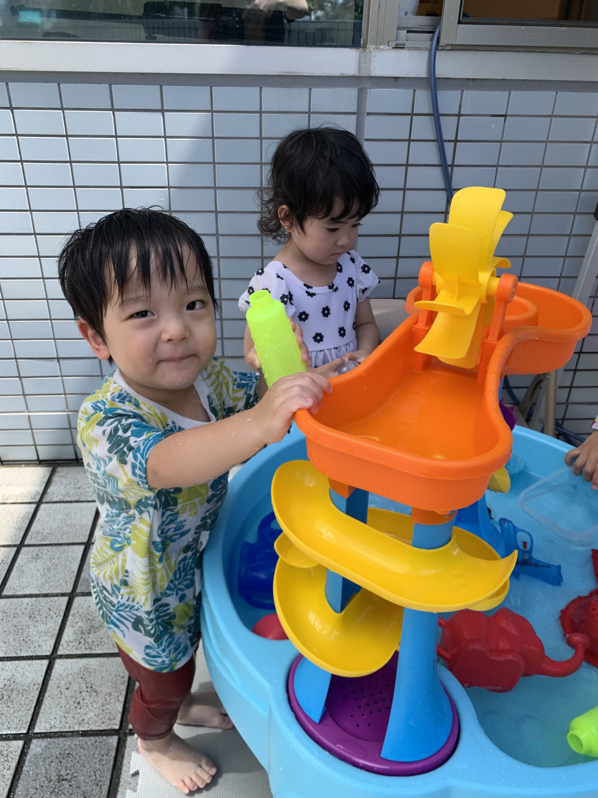 テラスに出て、ひんやり気持ちの良い「水遊び」の時間です!