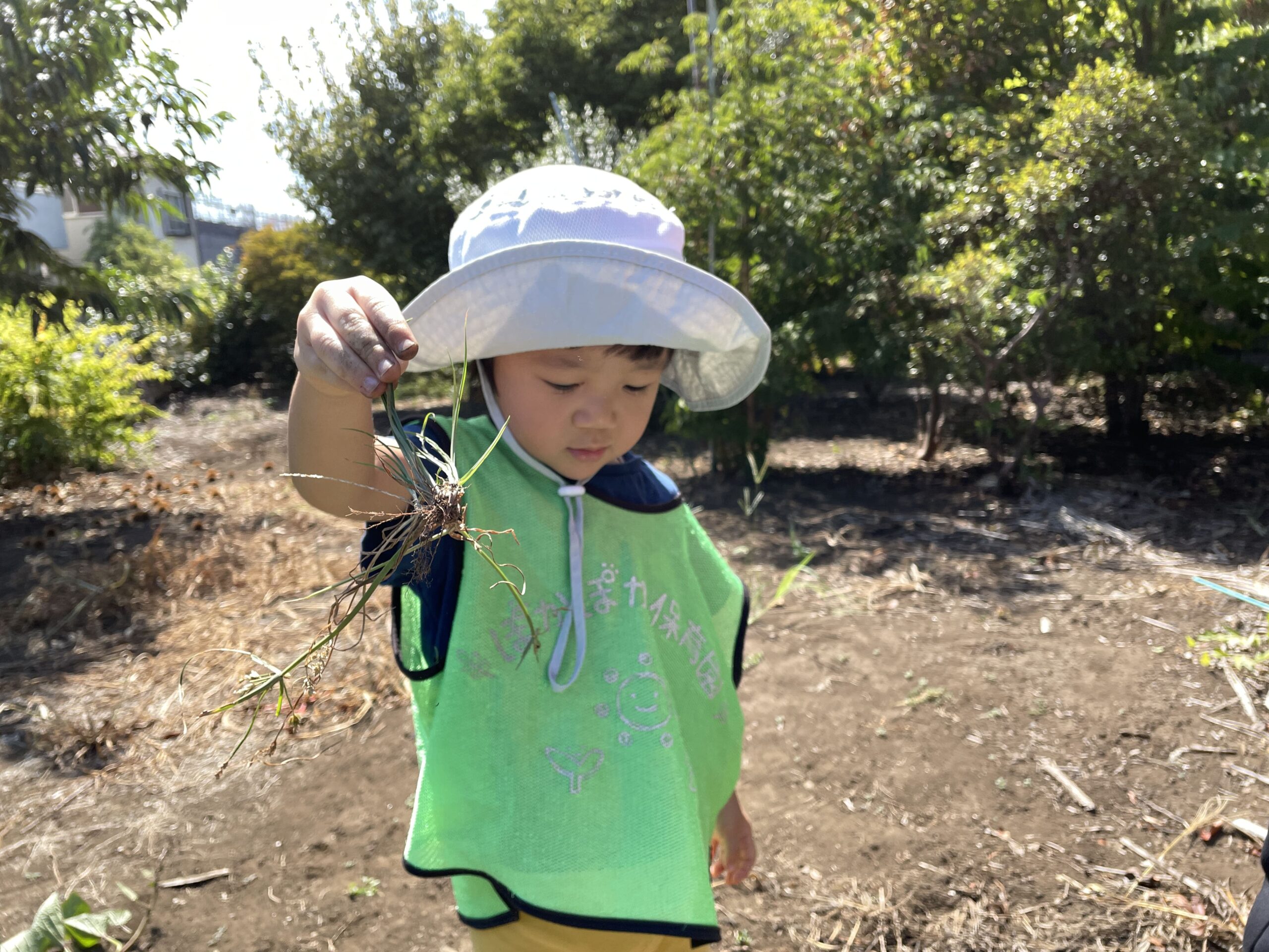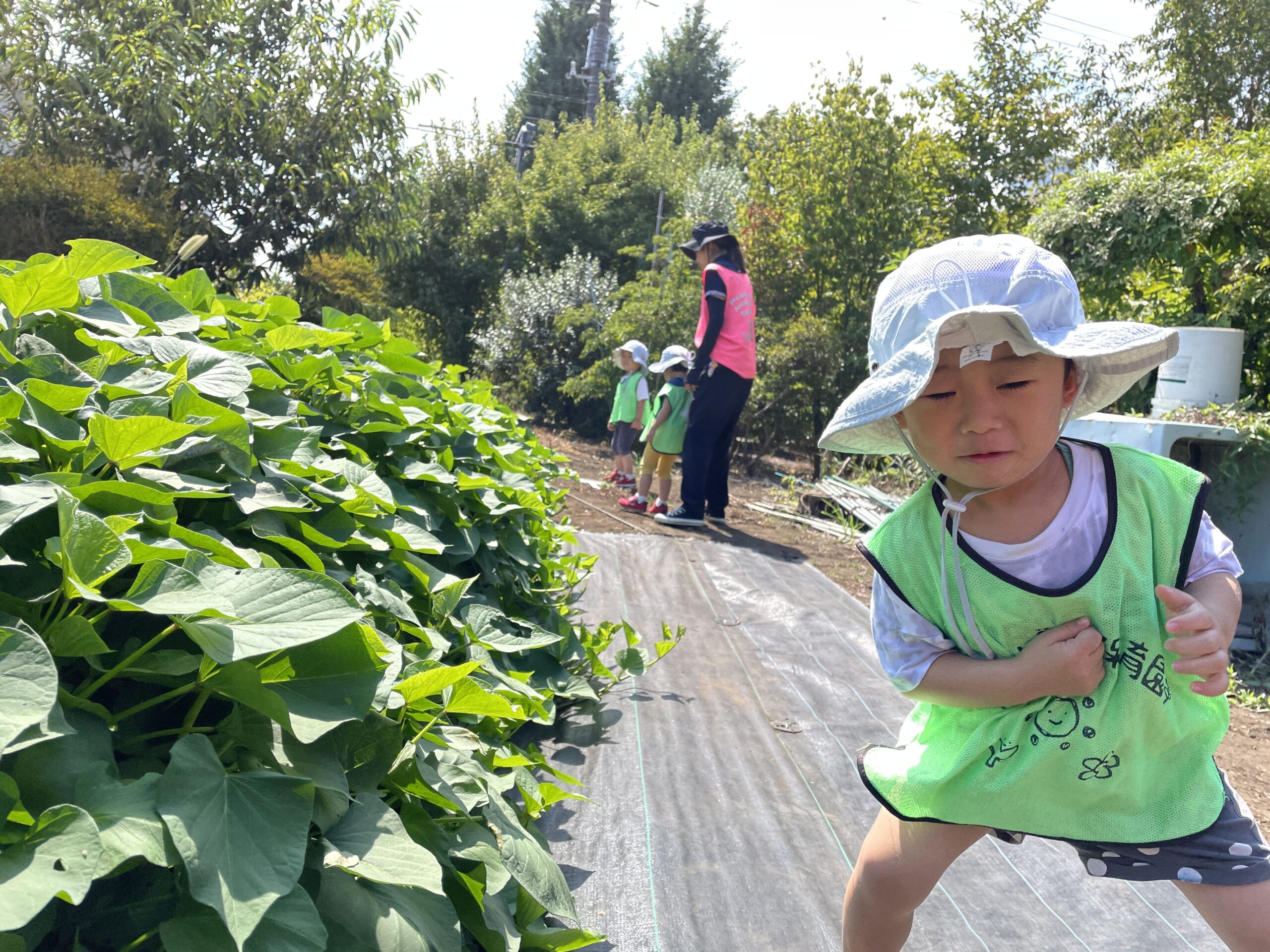 2歳児さんは畑の前に集まり、見上げるような真剣な眼差しでサツマイモの苗を観察していました。まず、土の色や葉っぱの形の違いに気づき、「この葉っぱはふわっとしているね」「つるがくるくるしてるよ」と友だちと声を交わしながら、そっと指先で触ってみる姿が印象的でした。
