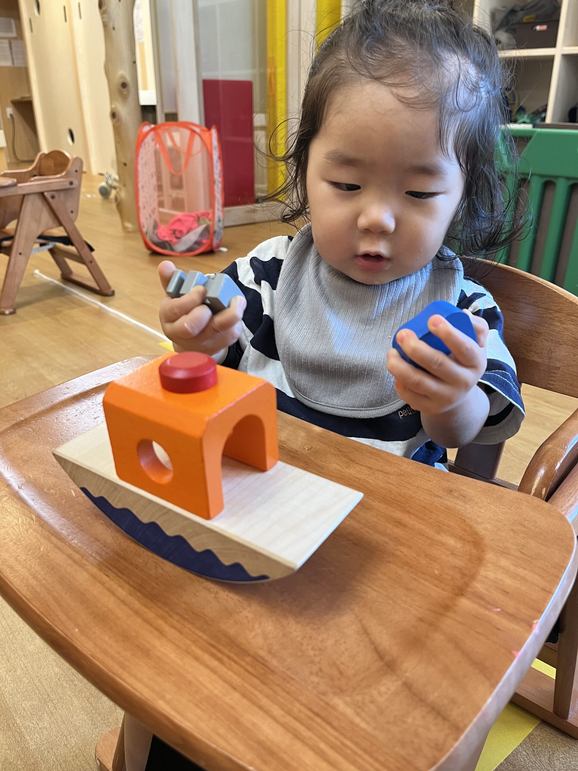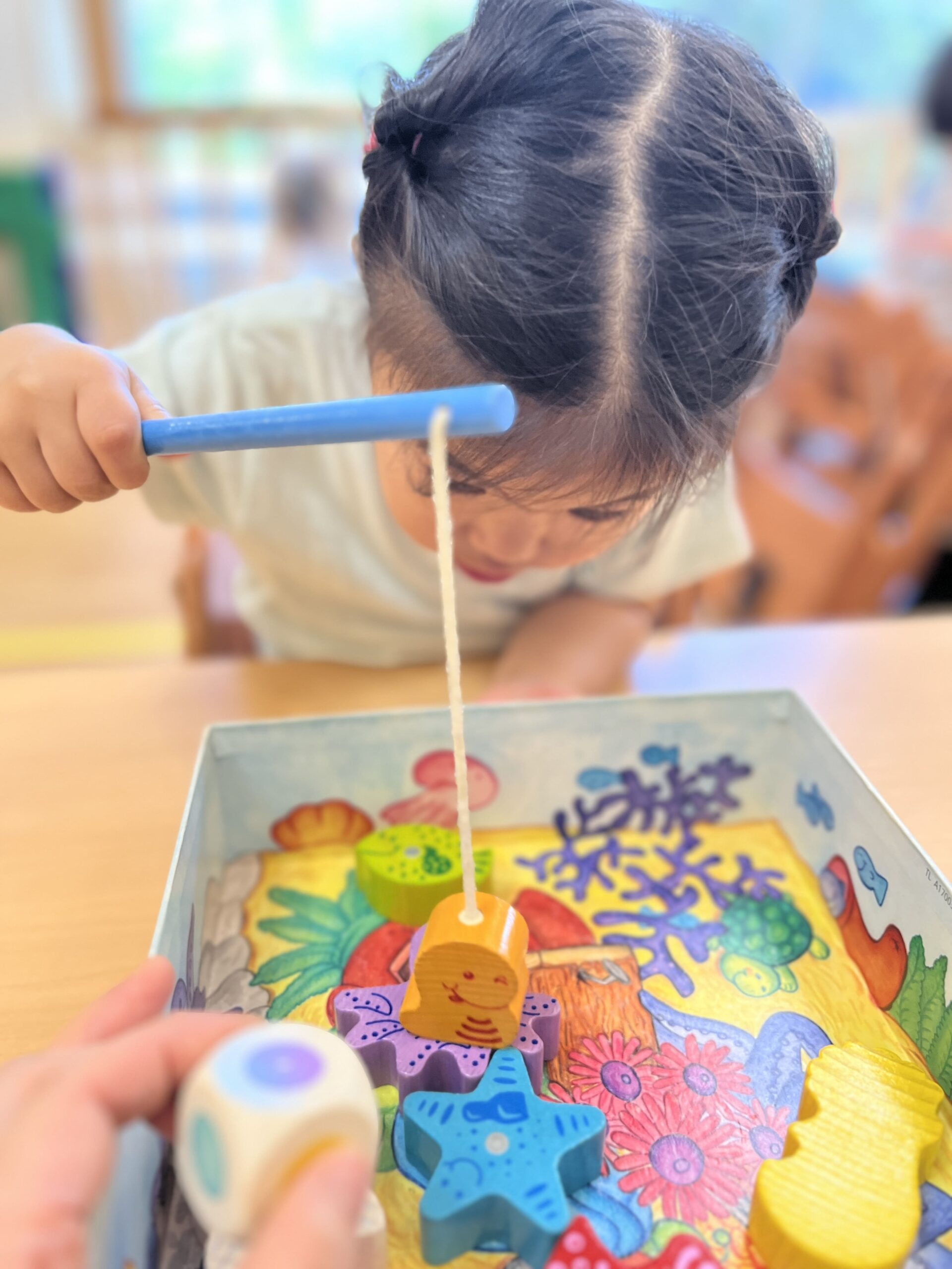 一方、0・1歳児さんは室内でアナログゲームに挑戦。フィッシングでは、すっかり同じ色の魚を釣れるようになりました。
