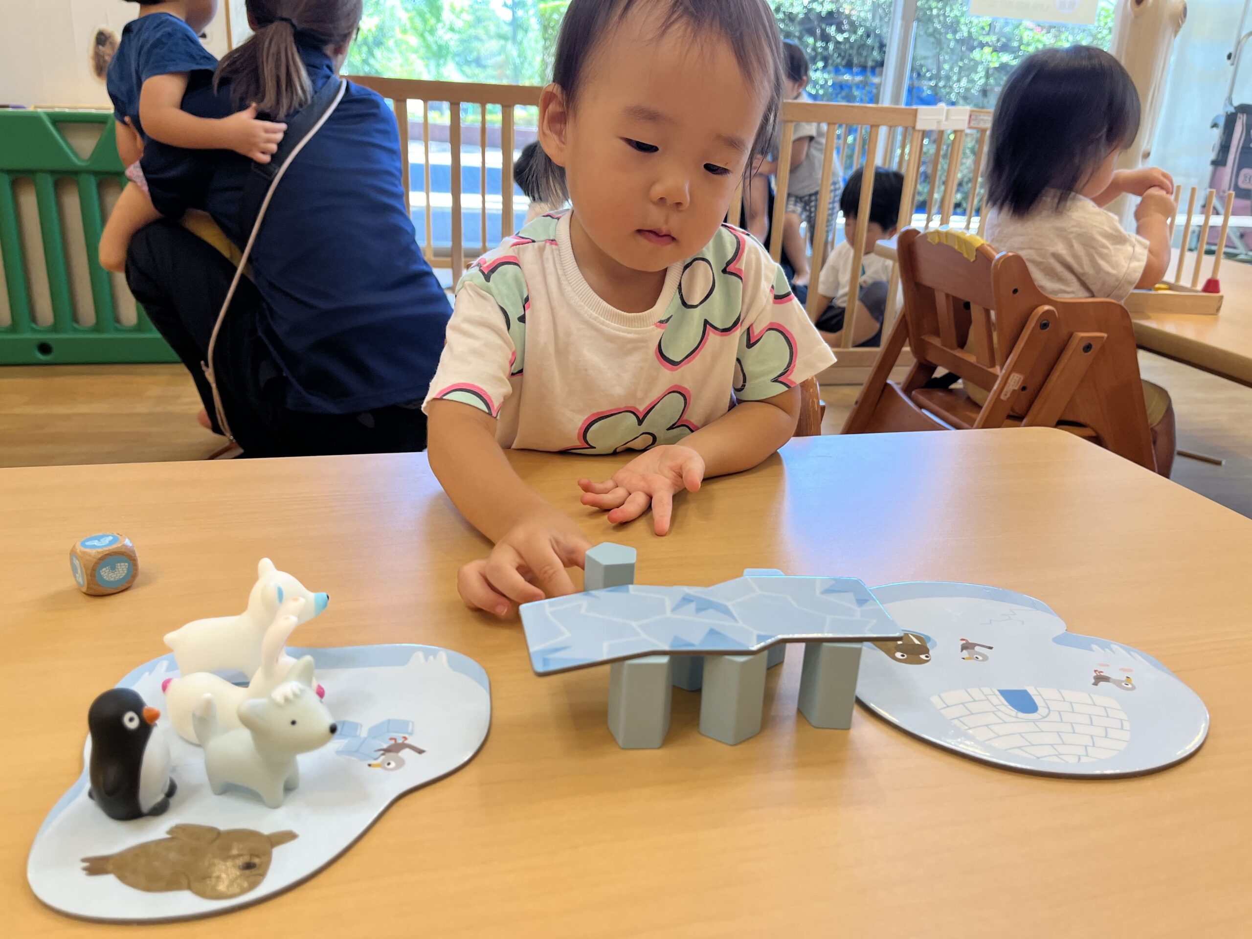 最近、こども達に人気なのが、新しいこのおもちゃです。氷の柱でできた橋を動物たちが渡り、お家に帰らせよう、という遊びです。サイコロで柱を取ったり、動物を橋の上に乗せたり、お家に帰らせます。今では子どもだけでできるようになりました。