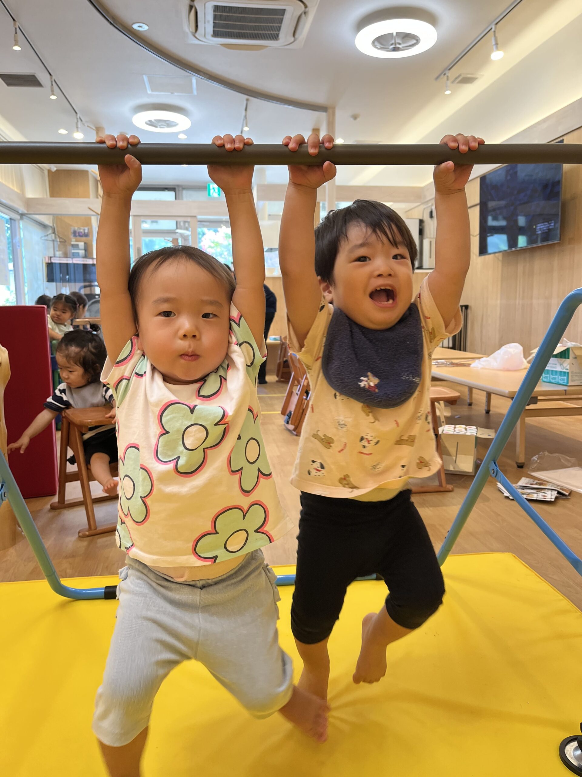 遊びの最後には鉄棒にもチャレンジ。マットをしっかり敷き、先生と一緒に「ぶらんぶらん」と手を伸ばして、ゆっくり足が床から離れる感触を味わっていました。