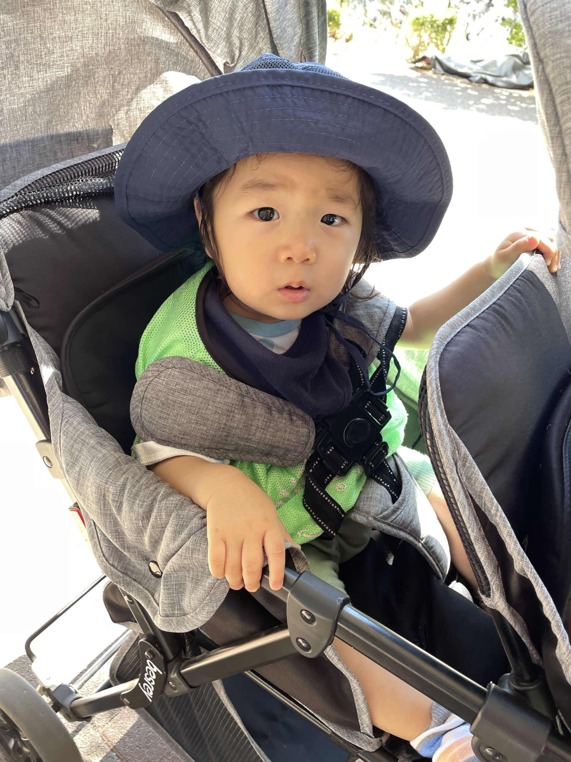 道すがら近くの畑をじっくり観察したり、蝶々を見つけて目で追いかけたり、上空を通る飛行機に「あっ!」と指をさしたりする姿がとてもかわいらしかったです。水分補給をしながら、やさしいそよ風を感じ取っていました。