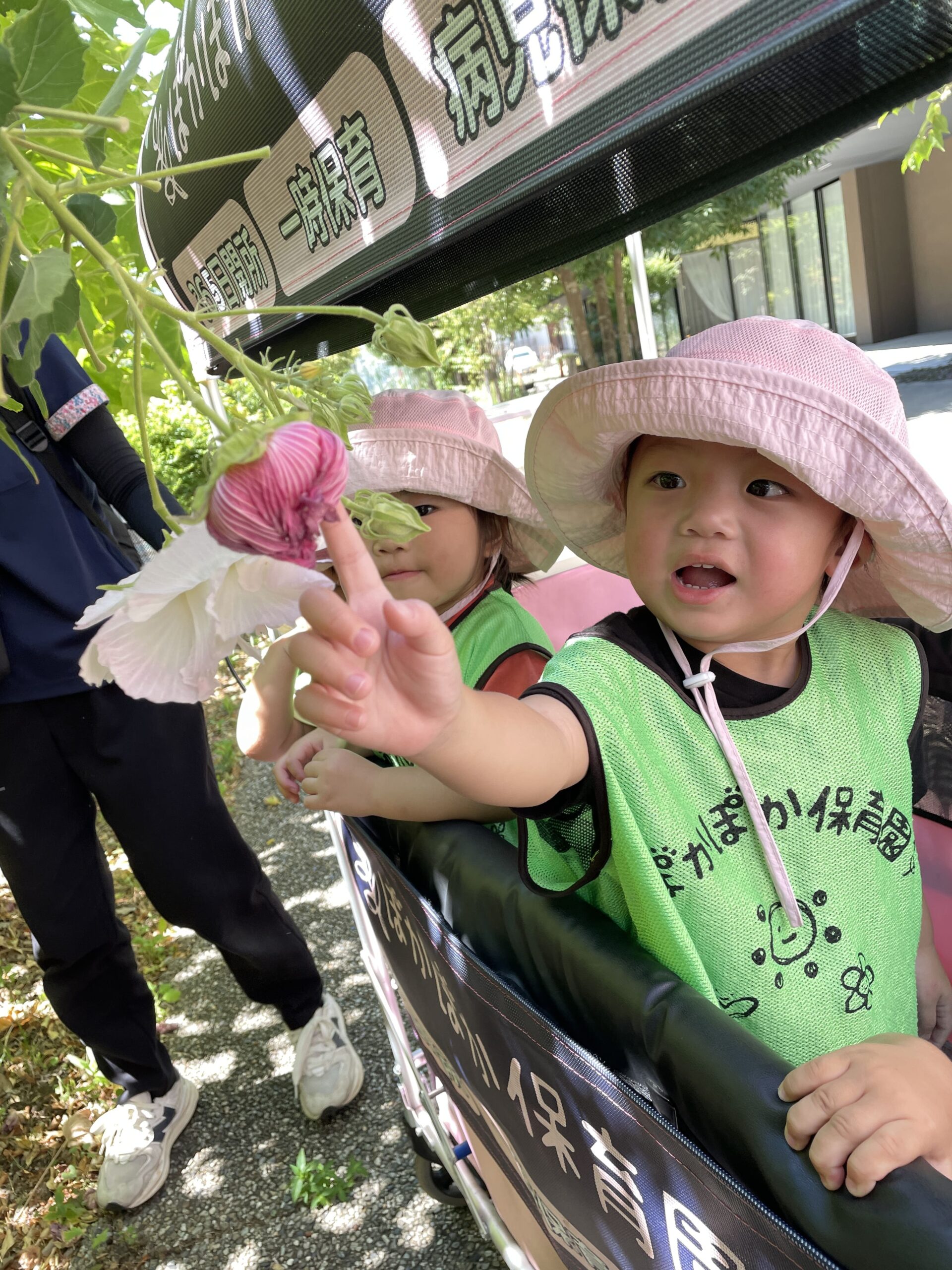 今日は0・1歳児のおともだちがカートやベビーカーに乗って、涼しい木陰ルートでお散歩を楽しみました。