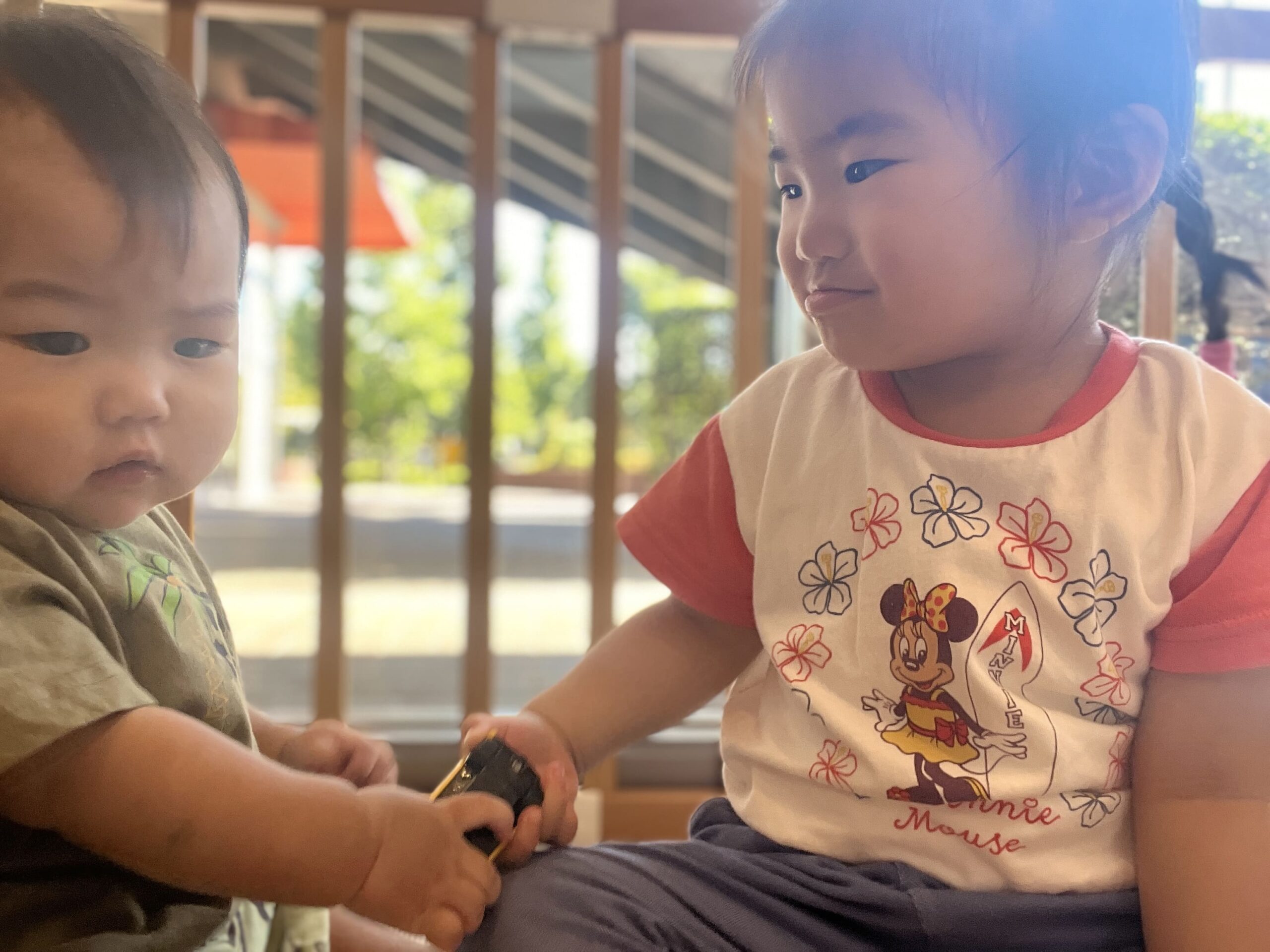 今日のほっこりエピソード:0歳児にどうぞする1歳児のお姉さん。優しさの心の育ちを感じました。