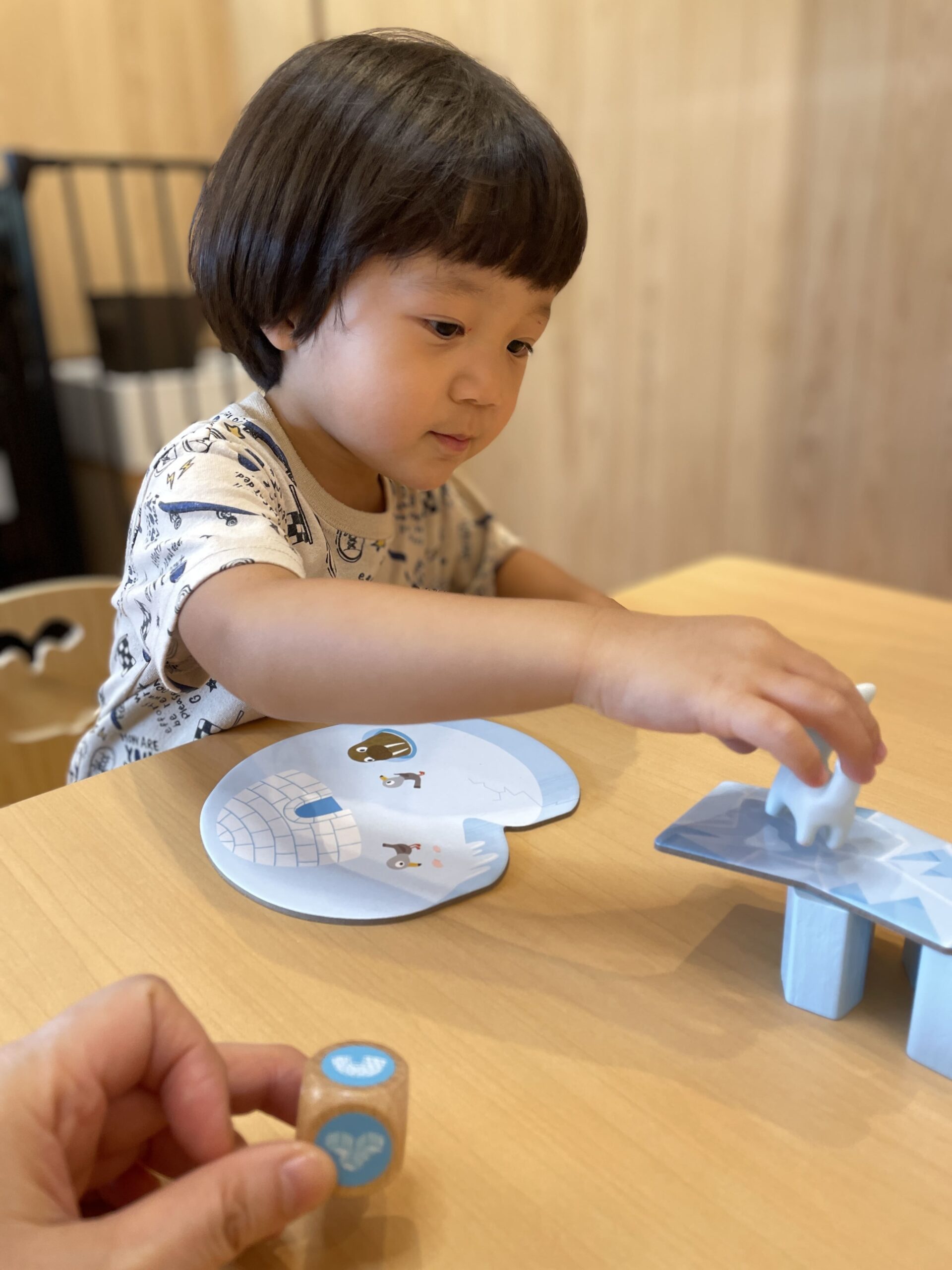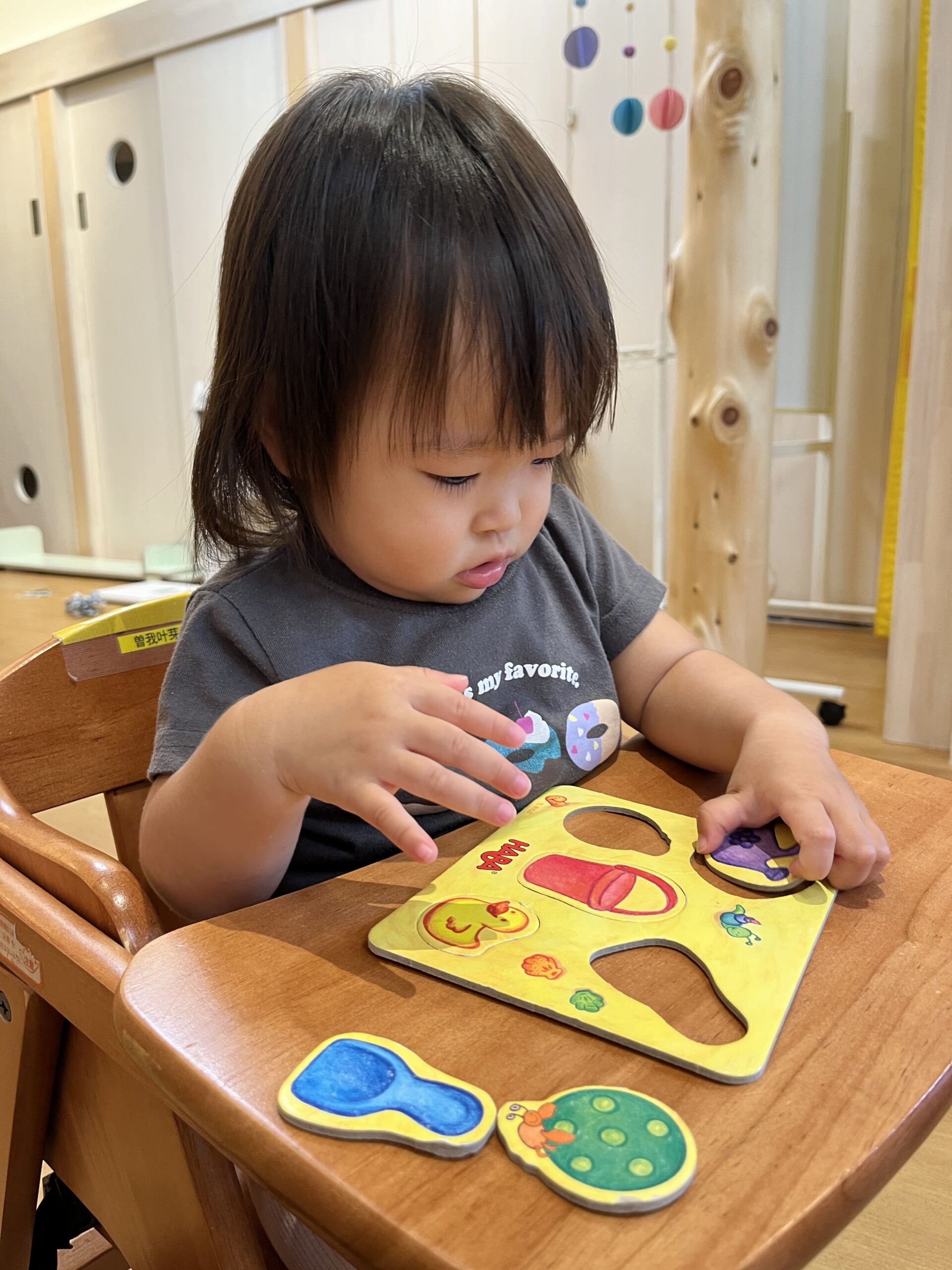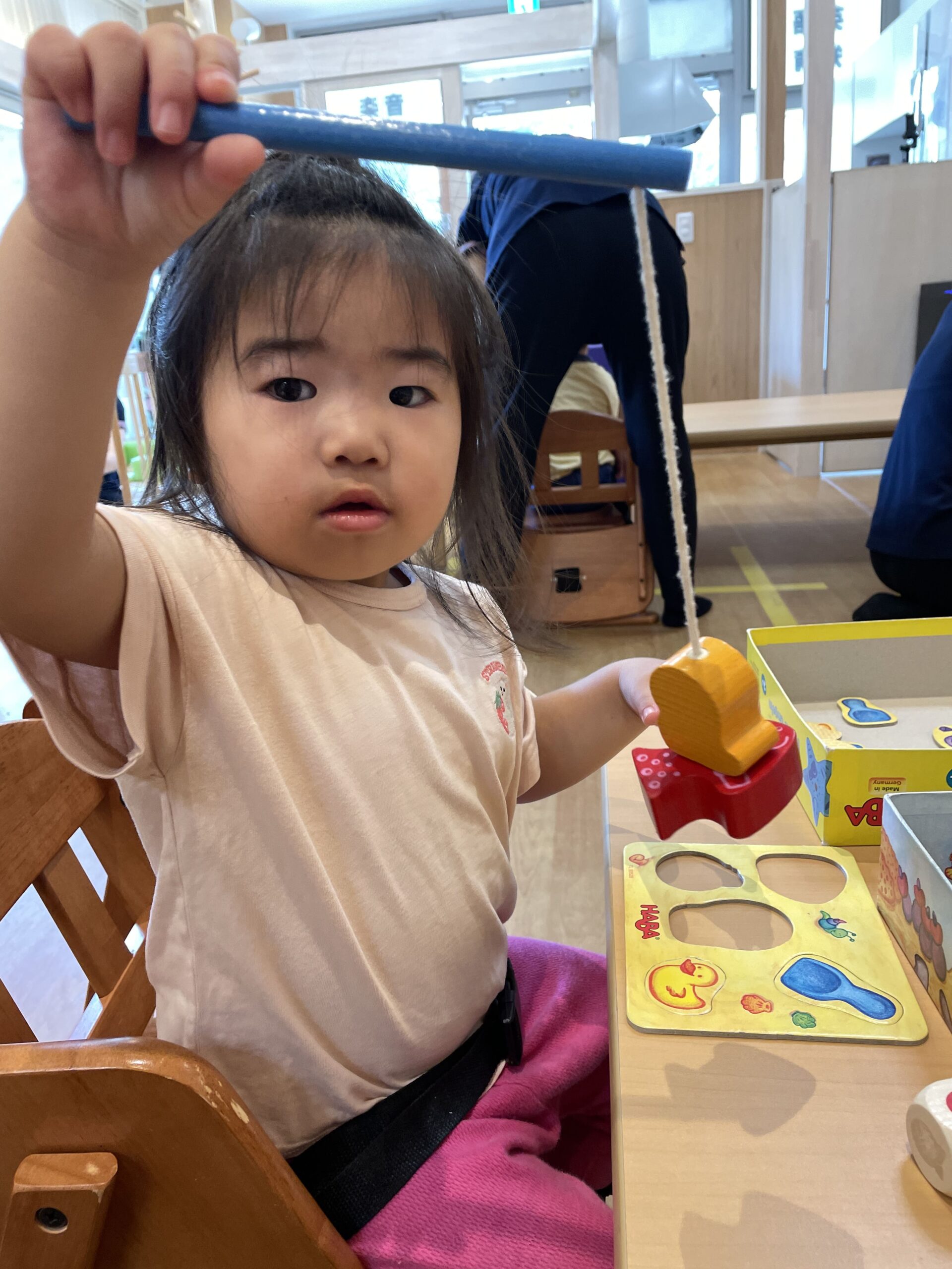 フィッシングゲームでは色の認識力がぐんと向上し、「赤!黄色!」と声に出して魚を釣り上げ、さらにパズルにも挑戦。「どこ~?」とよく考えながらピースをはめ込み、できるたびに達成感を味わっていました。