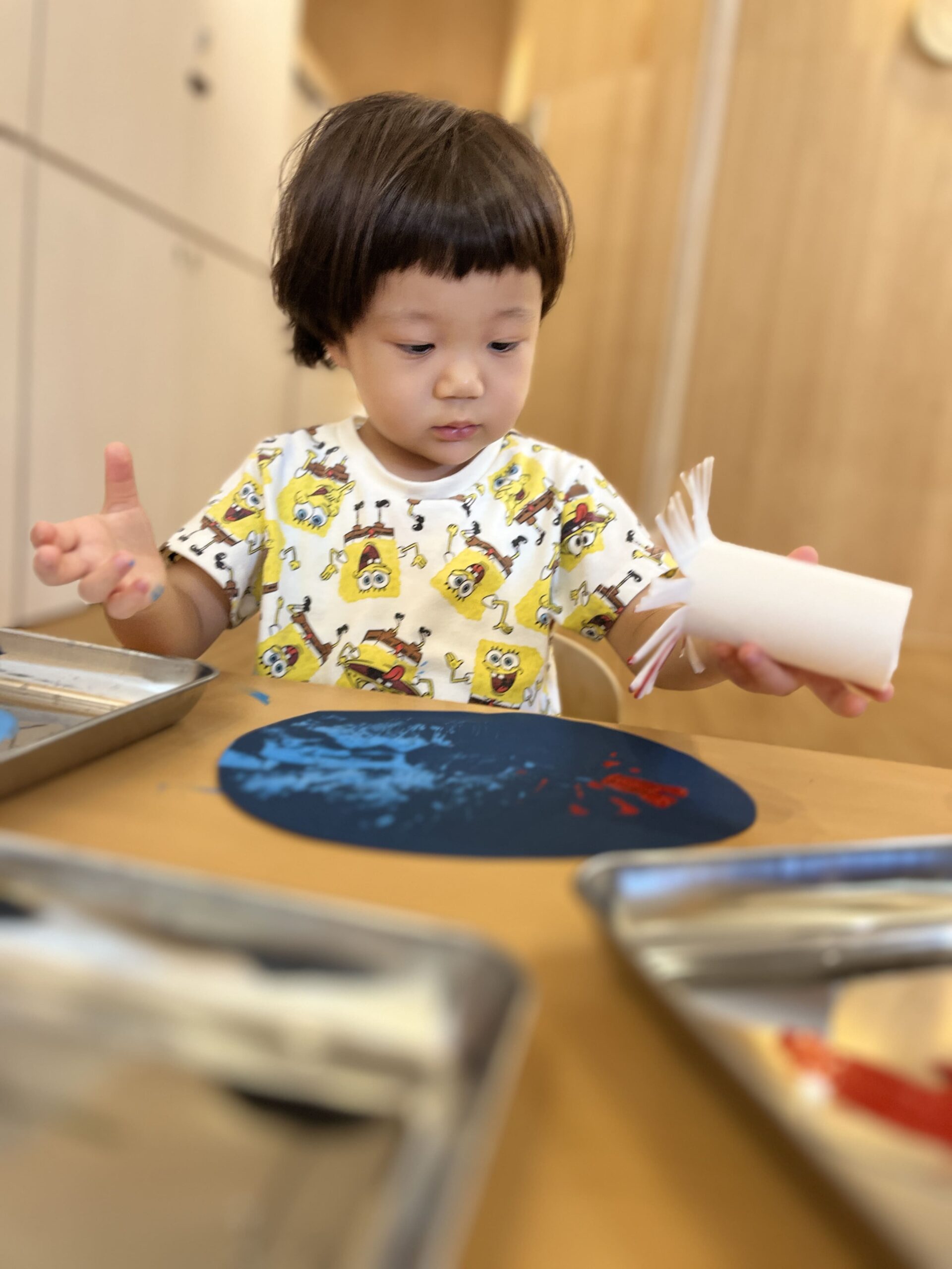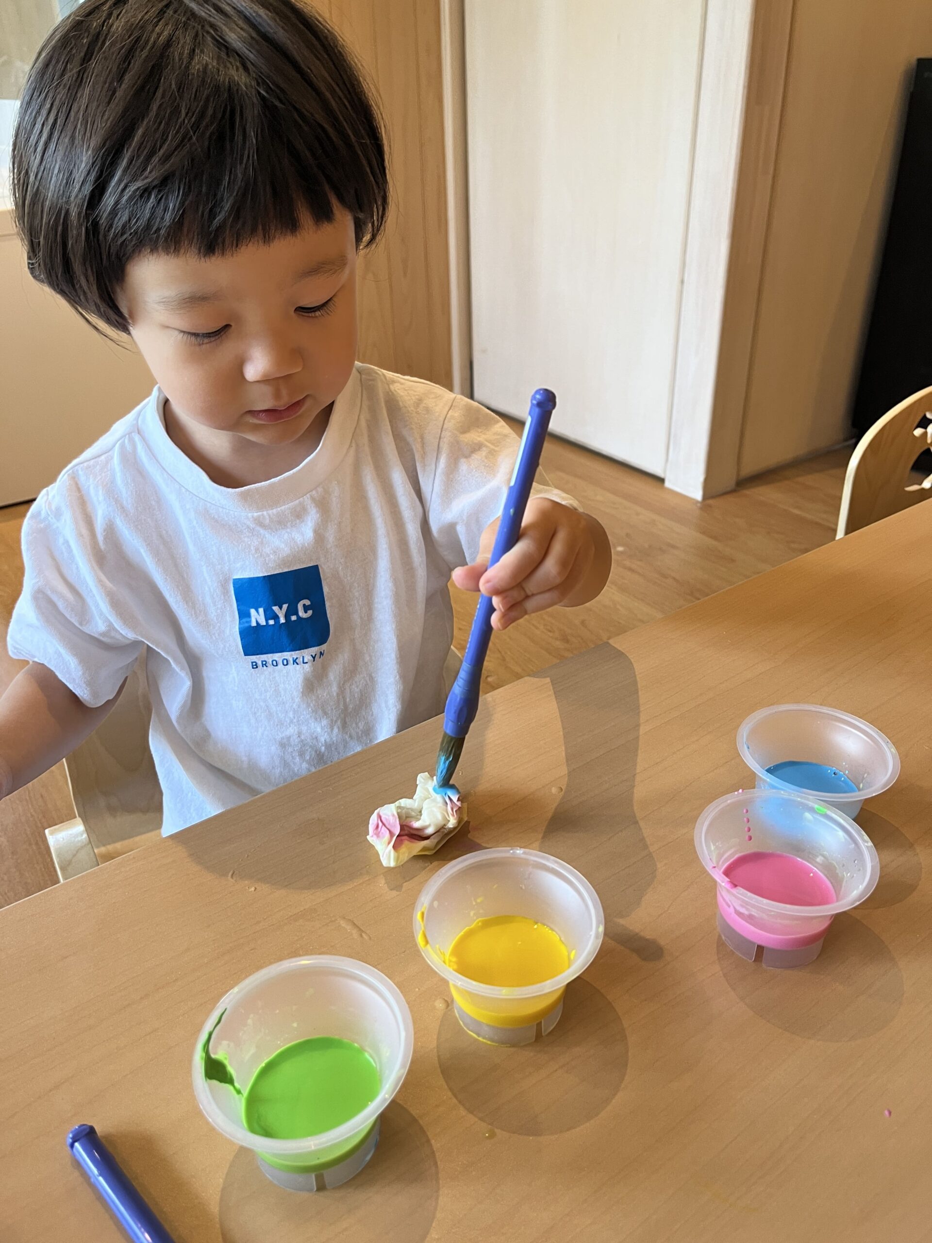 絵の具の感触に驚く子もいれば平気な子、様々な表情を見せてくれました。