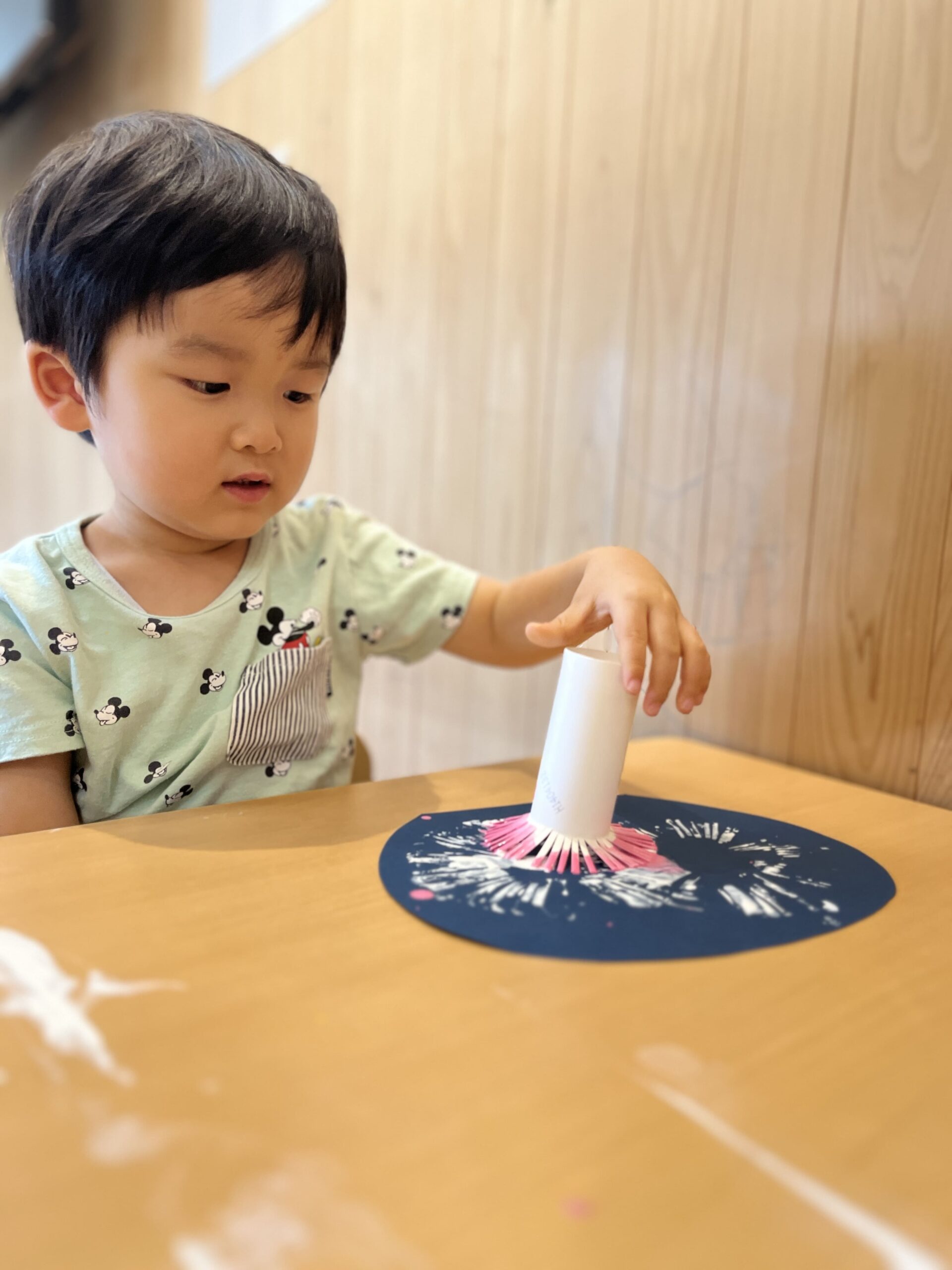 トイレットペーパーの芯に切り込みを入れ、絵の具をつけて花火を表現しました。