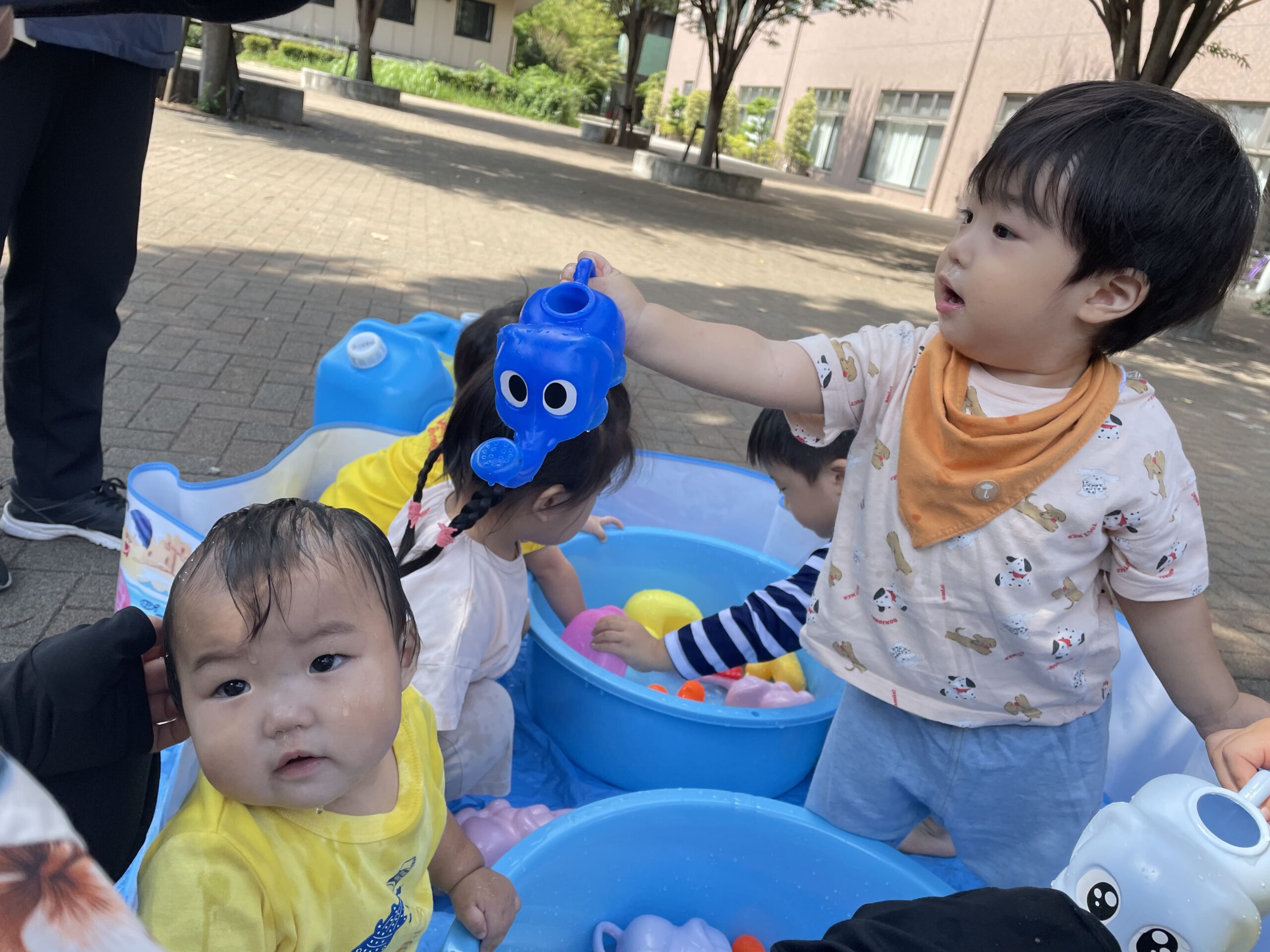 お皿やじょうろに水を汲み、お友だち同士で「じゃーっ!」と掛け合いっこ!顔にかかった水滴を手でパシャパシャ払うたびに、キャッキャと大歓声が上がり、一気に涼しさを感じている様子でした!