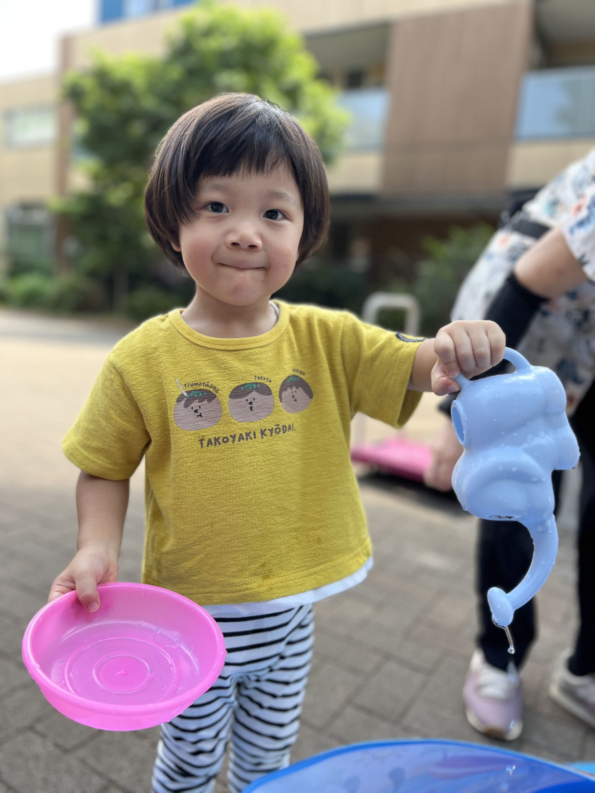 お皿やじょうろに水を汲み、お友だち同士で「じゃーっ!」と掛け合いっこ!顔にかかった水滴を手でパシャパシャ払うたびに、キャッキャと大歓声が上がり、一気に涼しさを感じている様子でした!