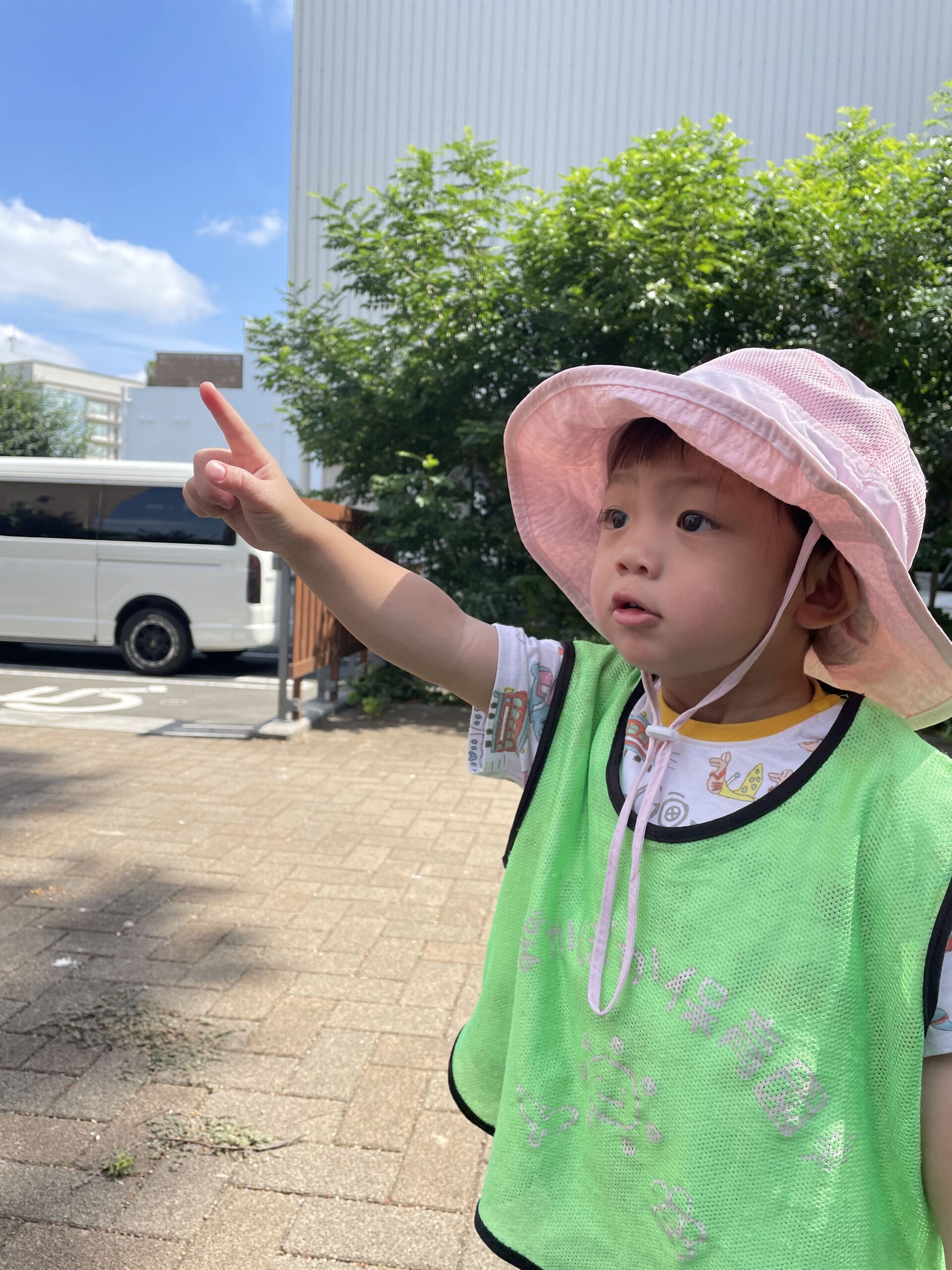 一方で、この日は水遊びをお休みした子はテラスを散策して遊びました!そこで見つけたのが飛行機雲を残して飛ぶ飛行機です。「ひこ~き!おっき~!」と指を空に向け、立ち止まってじっくり観察!広い空を見上げるその表情は、とても穏やかで得意げでした☆