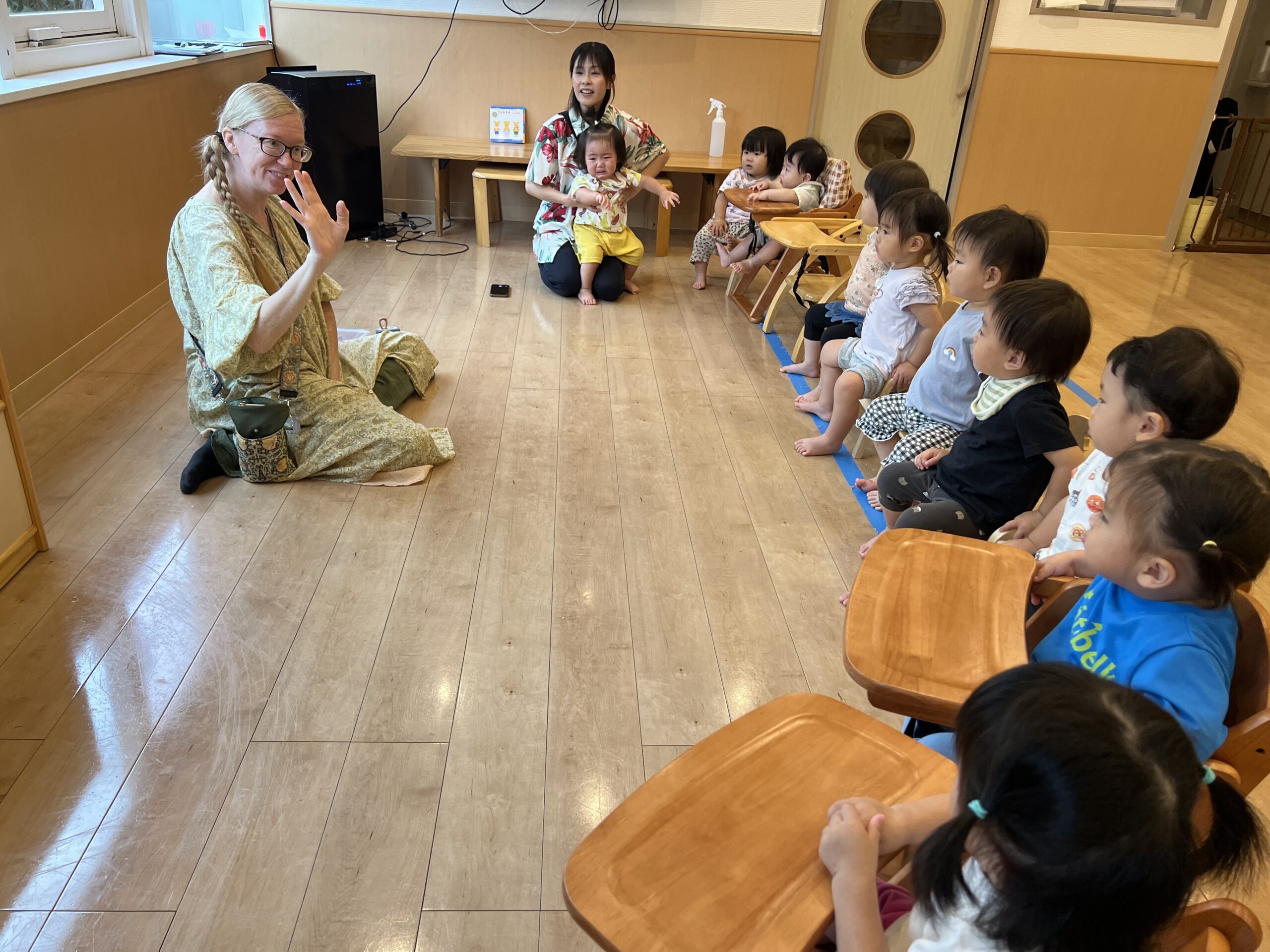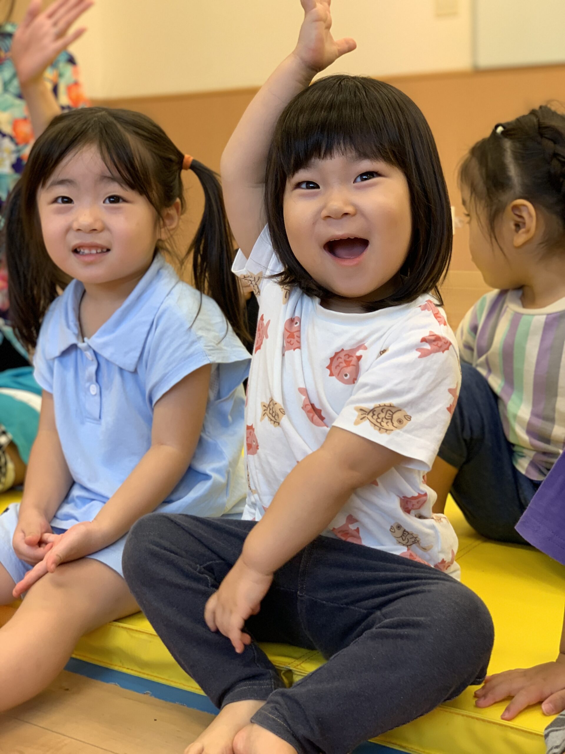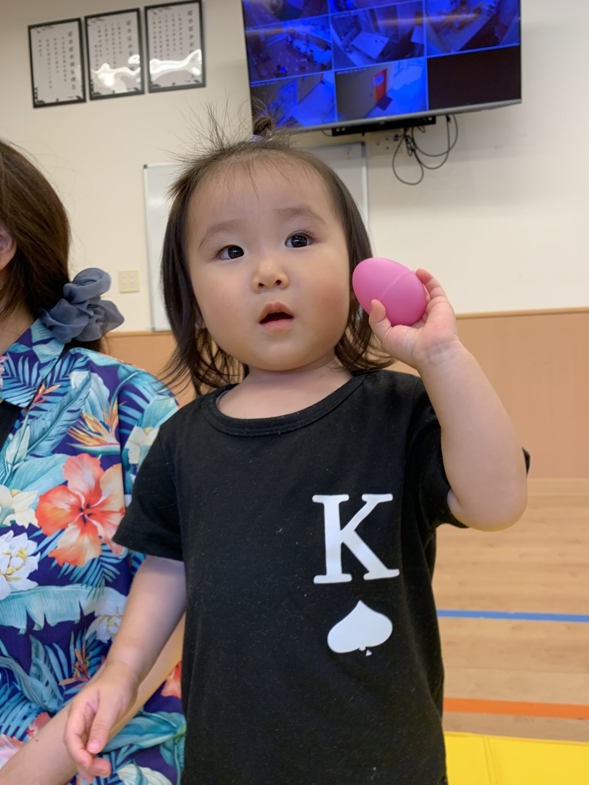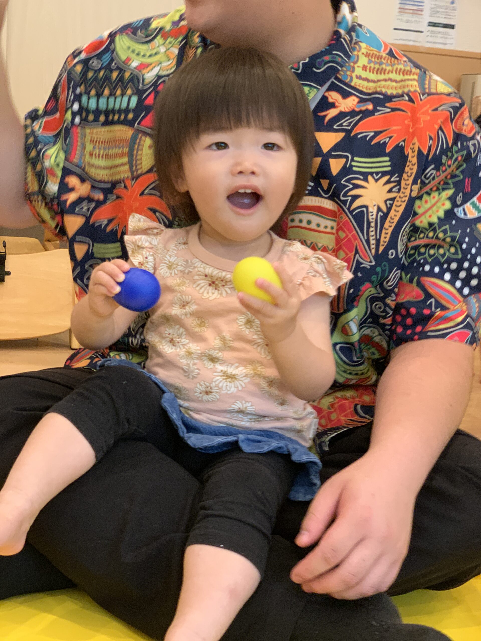 室内で音楽遊びと英語遊びを楽しみ、たくさんの「笑顔」と「元気」を分かち合いましたよ。