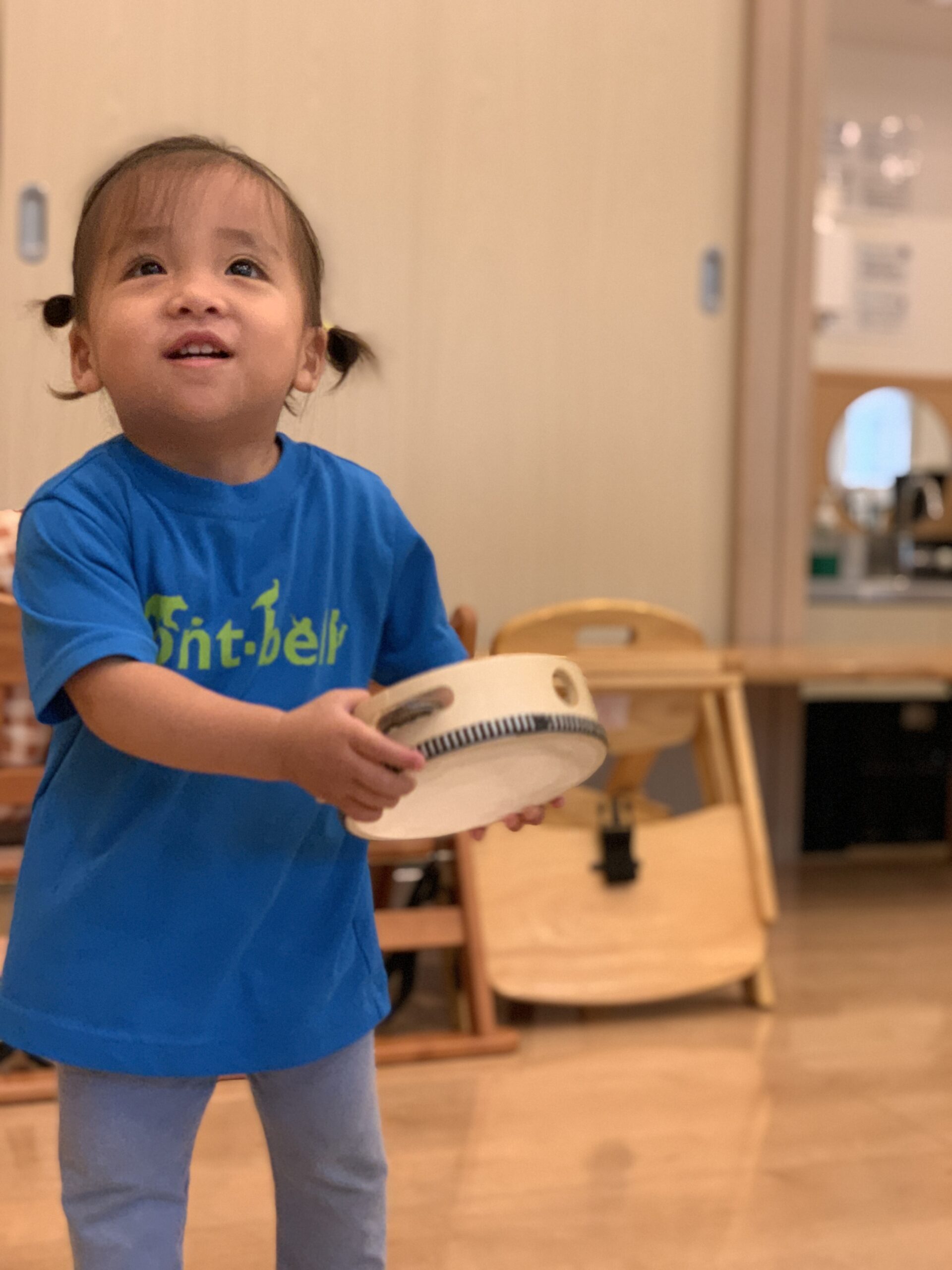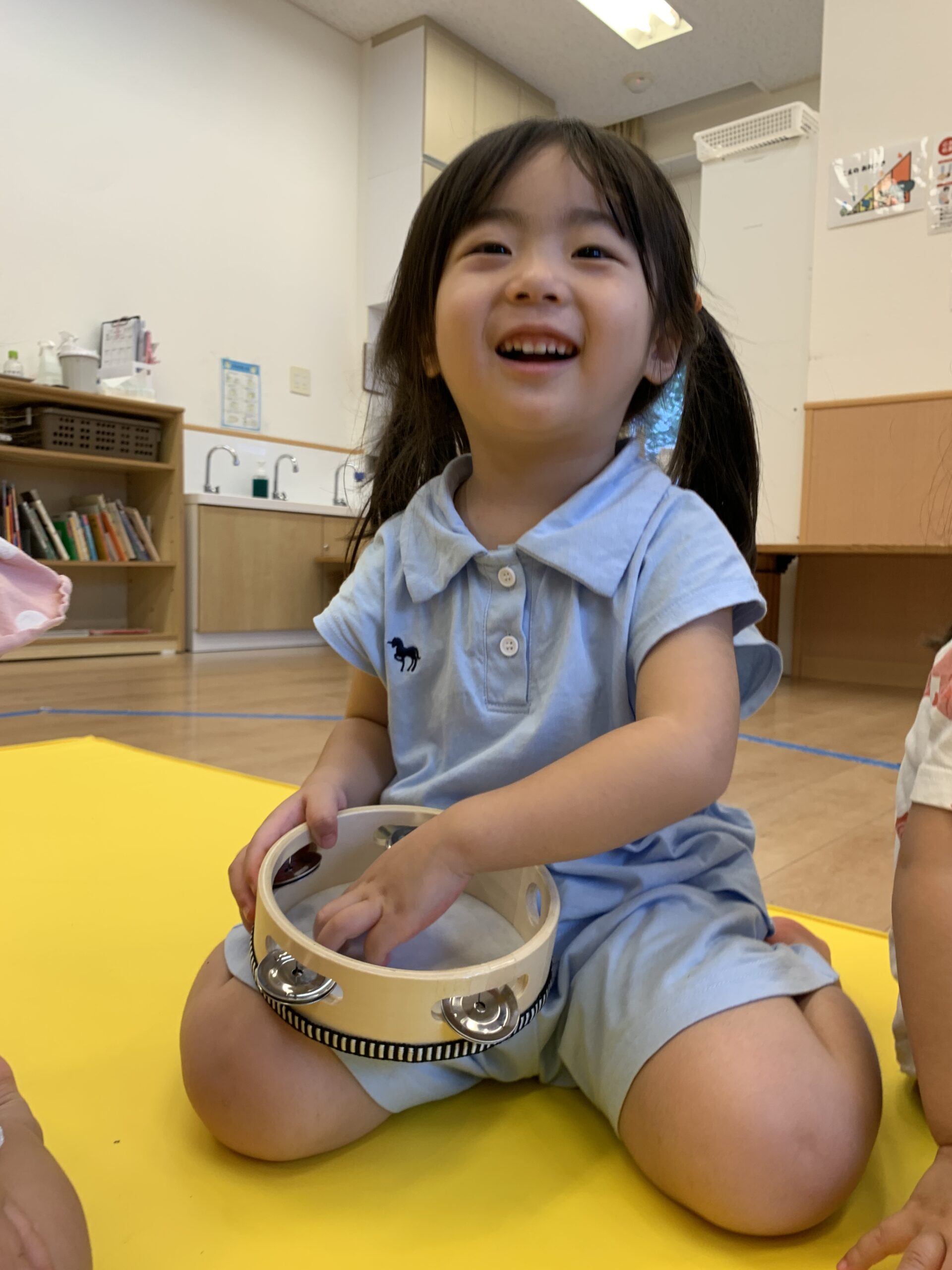 子どもたちはタンバリンを両手に持ち、音楽のリズムに合わせて体を揺らしながら、