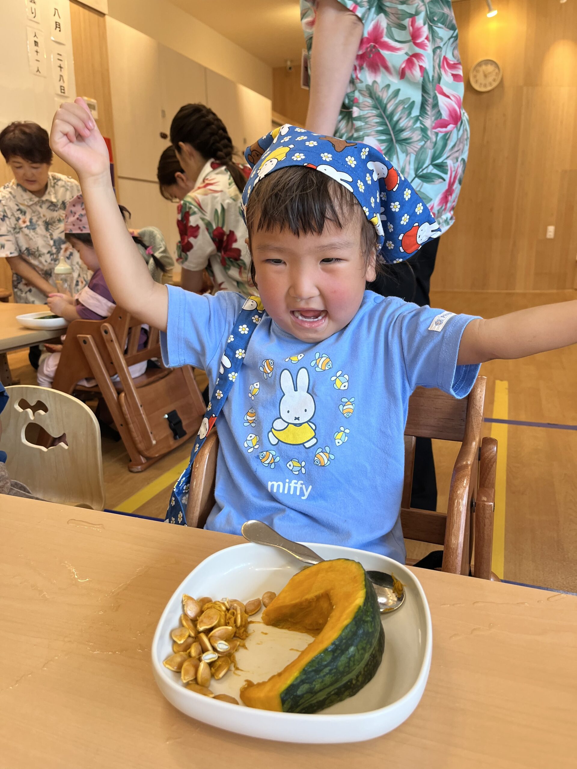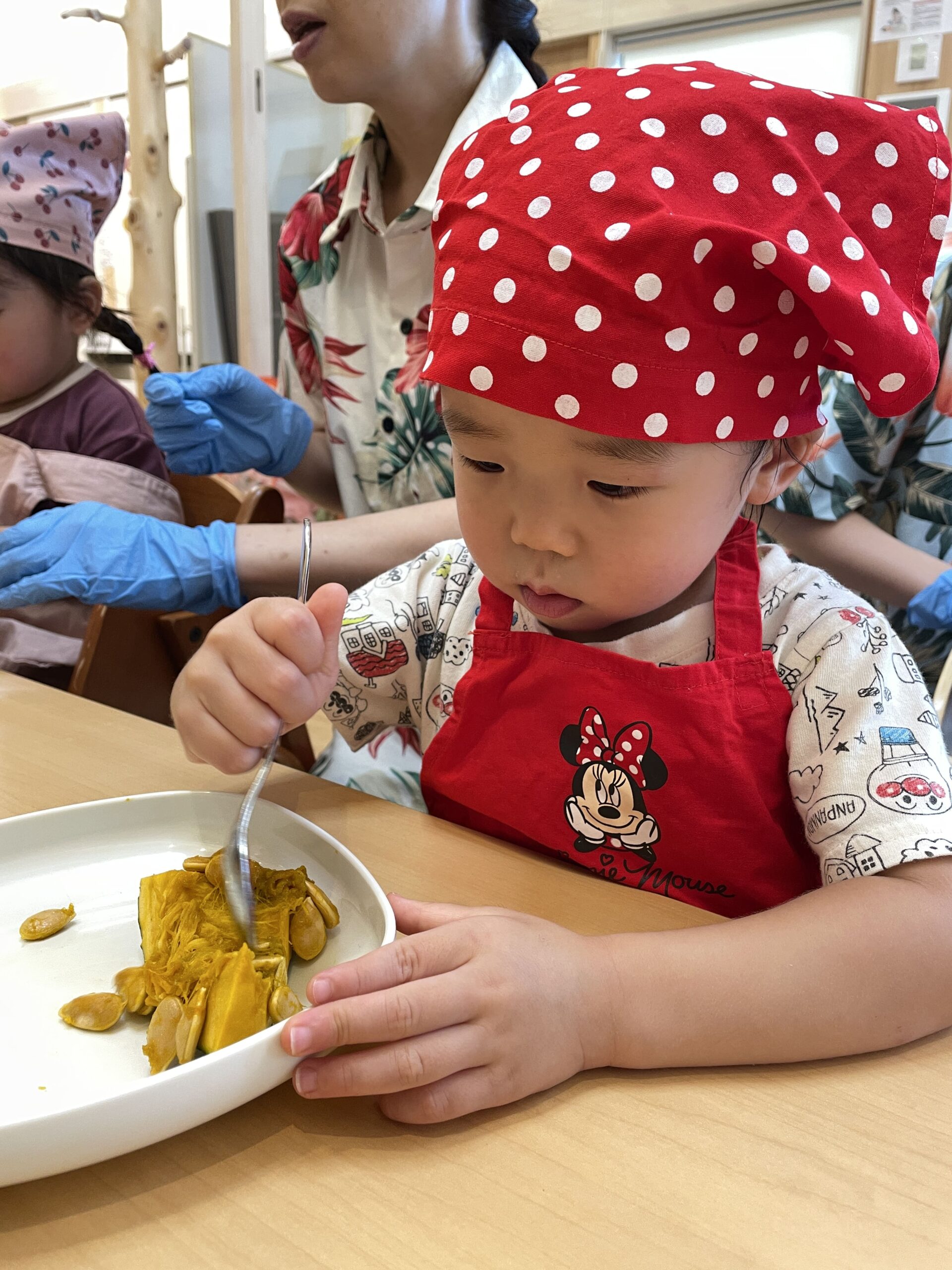 活動では、お気に入りのエプロンを着けた子どもたちがスプーンを手に、「わあっ」と歓声をあげながら種をコツコツ取り出し、中身の色やにおいを確認。中には「これ、食べられる?」とおいしそうに覗き込む姿も見られ、和やかな食育のひとときになりました。