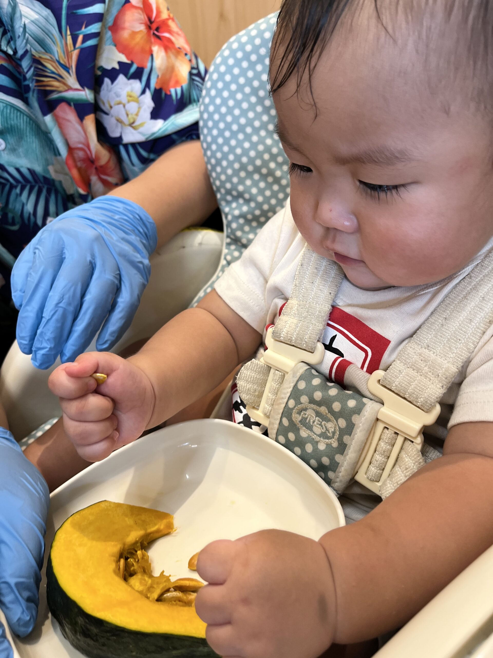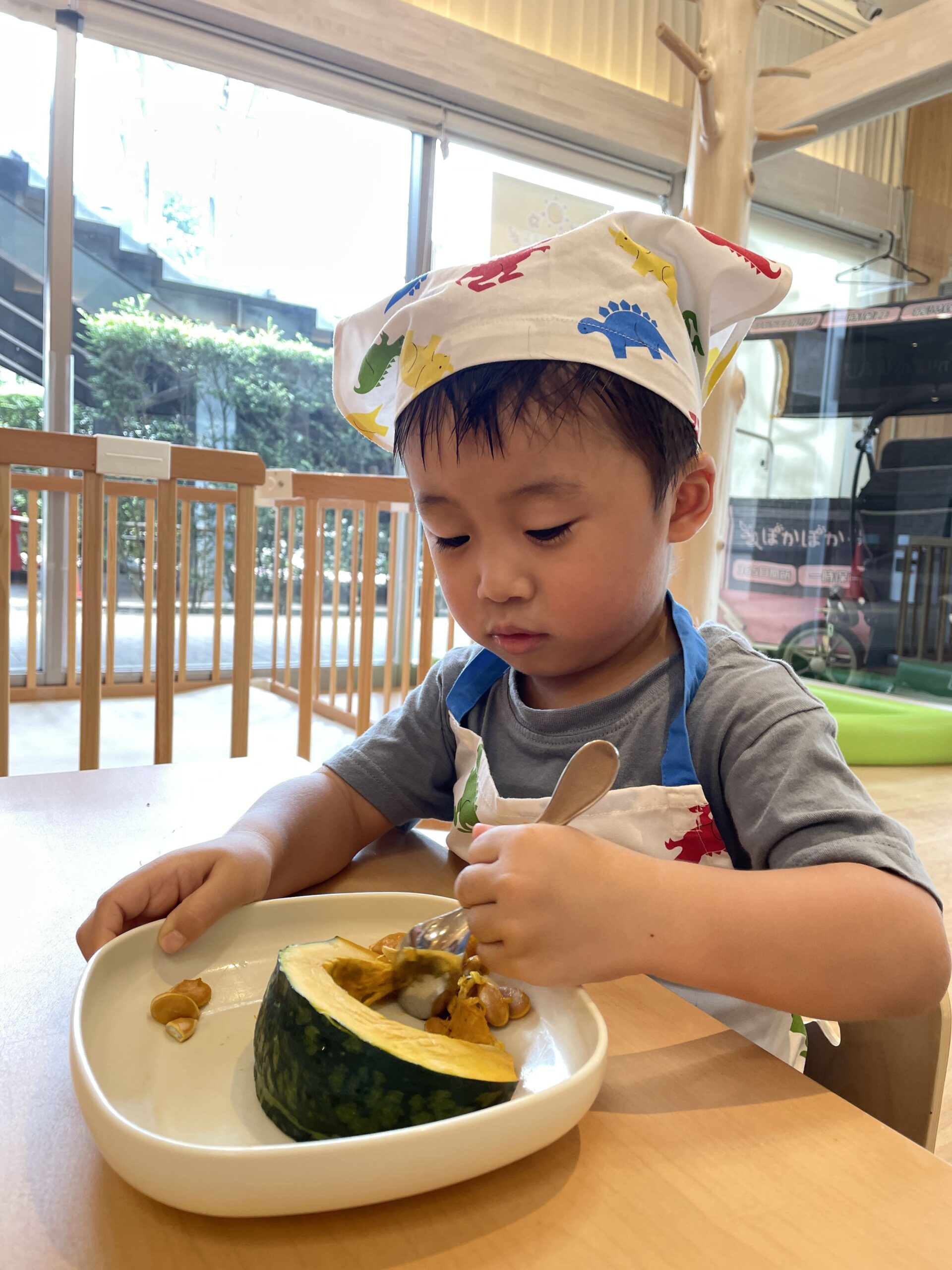 今日のねらいは、かぼちゃを素材のまま体感し、スプーンで種を取りながら食への好奇心を育むこと。生のかぼちゃを見て触れて、「カチカチだね」「種がぷにぷにだ!」と子どもたちも興味津々でした。