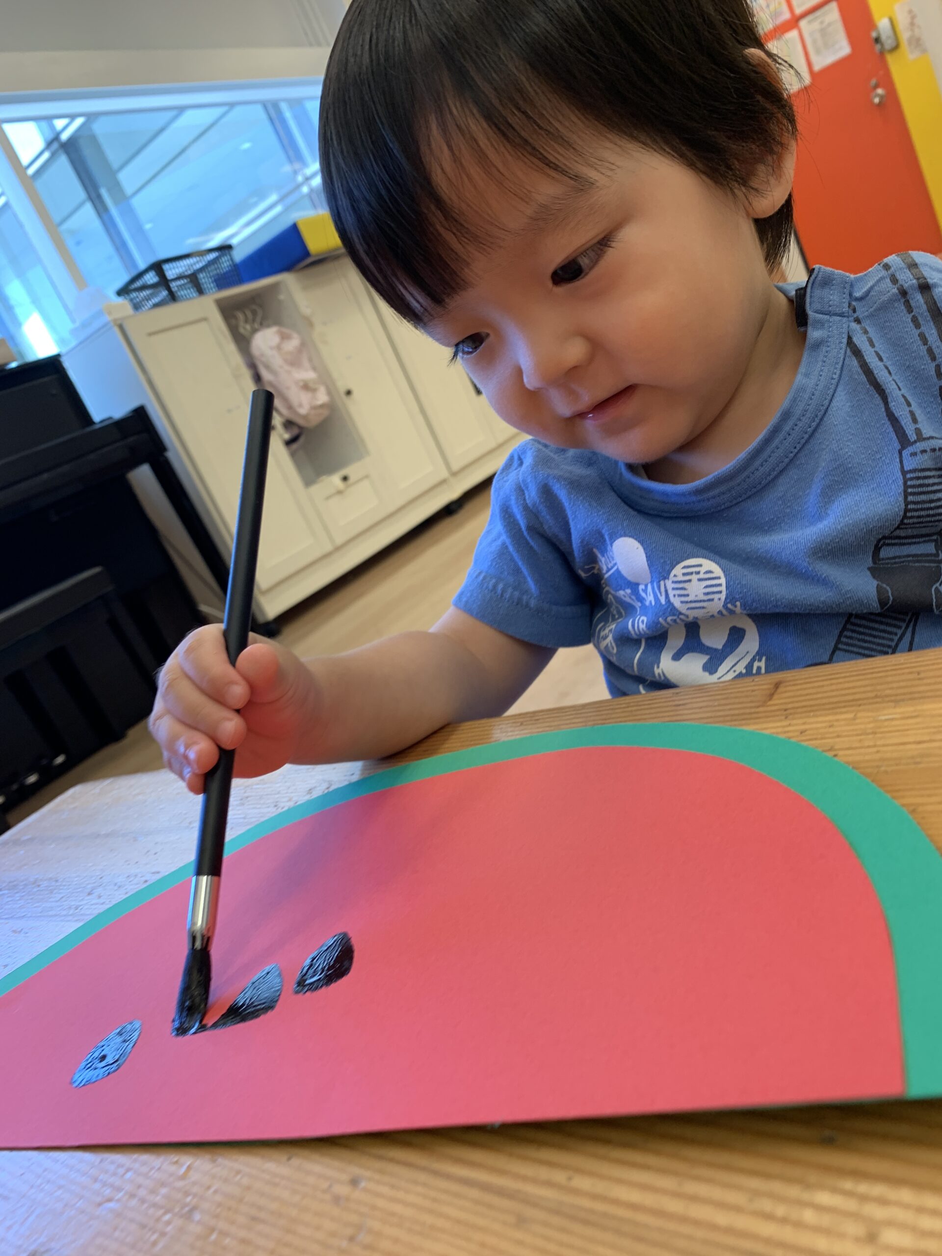 1歳さんは自分で「トントン」となる音に夢中になりながらスイカの種を描いていました!
