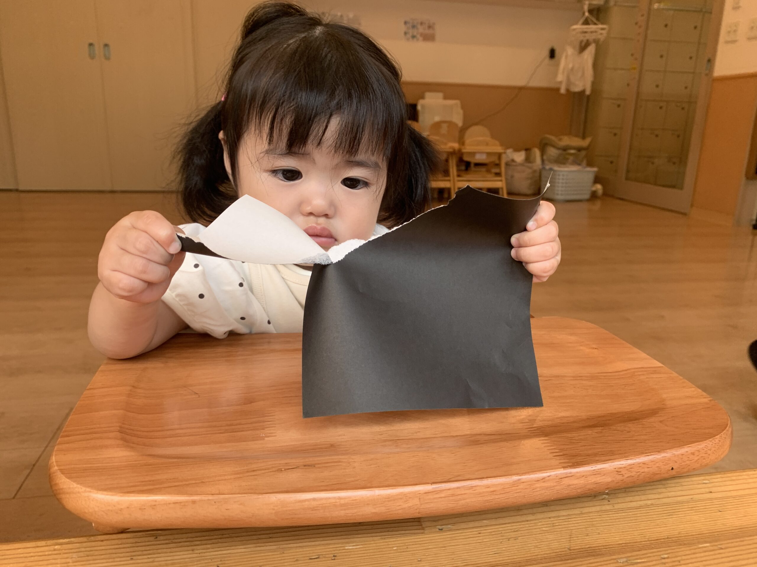 2歳さんは慣れてきたのか自分たちで黒色の折り紙を破いてまん丸のすいかを作りました!