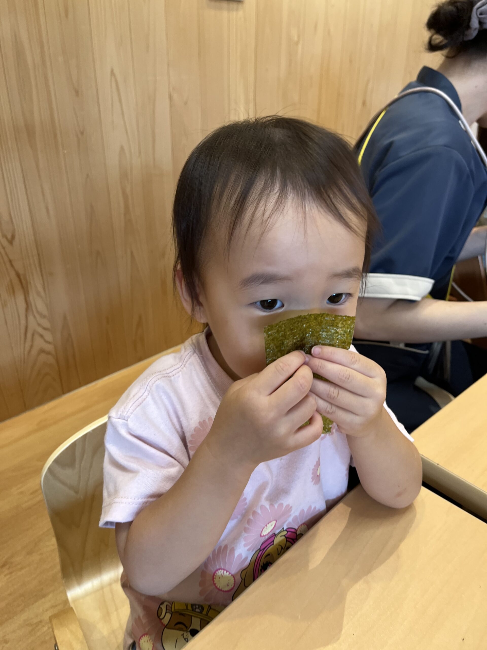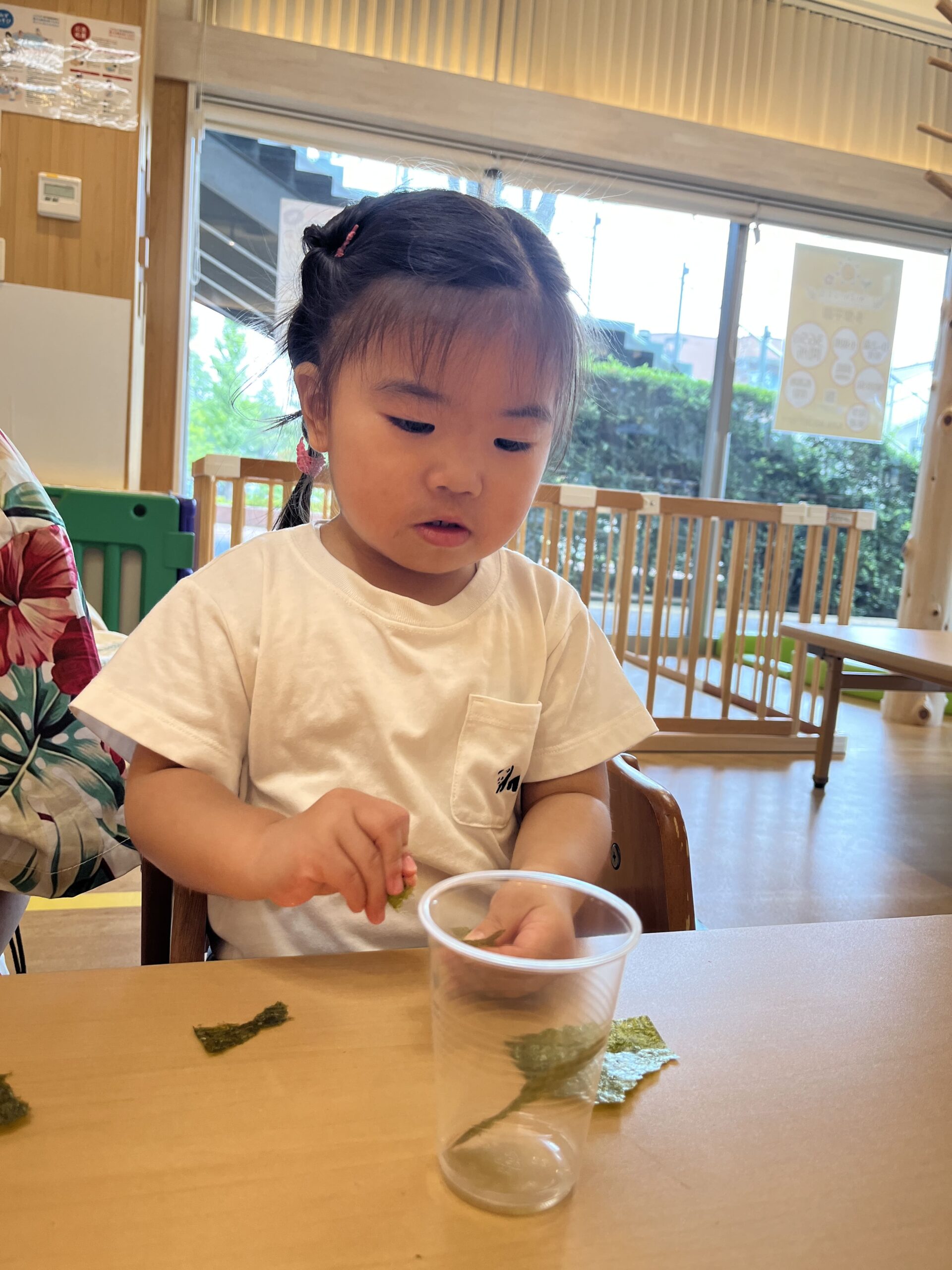 まずは一人ひとりが海苔を1枚ずつ手に取り、じっくりと匂いを嗅いだり、指先でそっと触ってみたり。海の香りやざらざらした感触に「パリパリする!」「おにぎりの匂い?」と目を輝かせる子どもたちの姿が印象的でした。