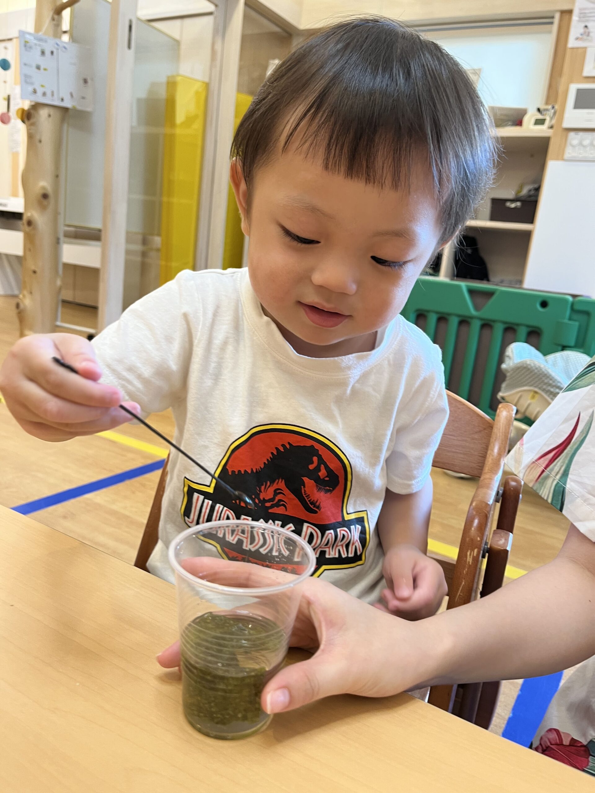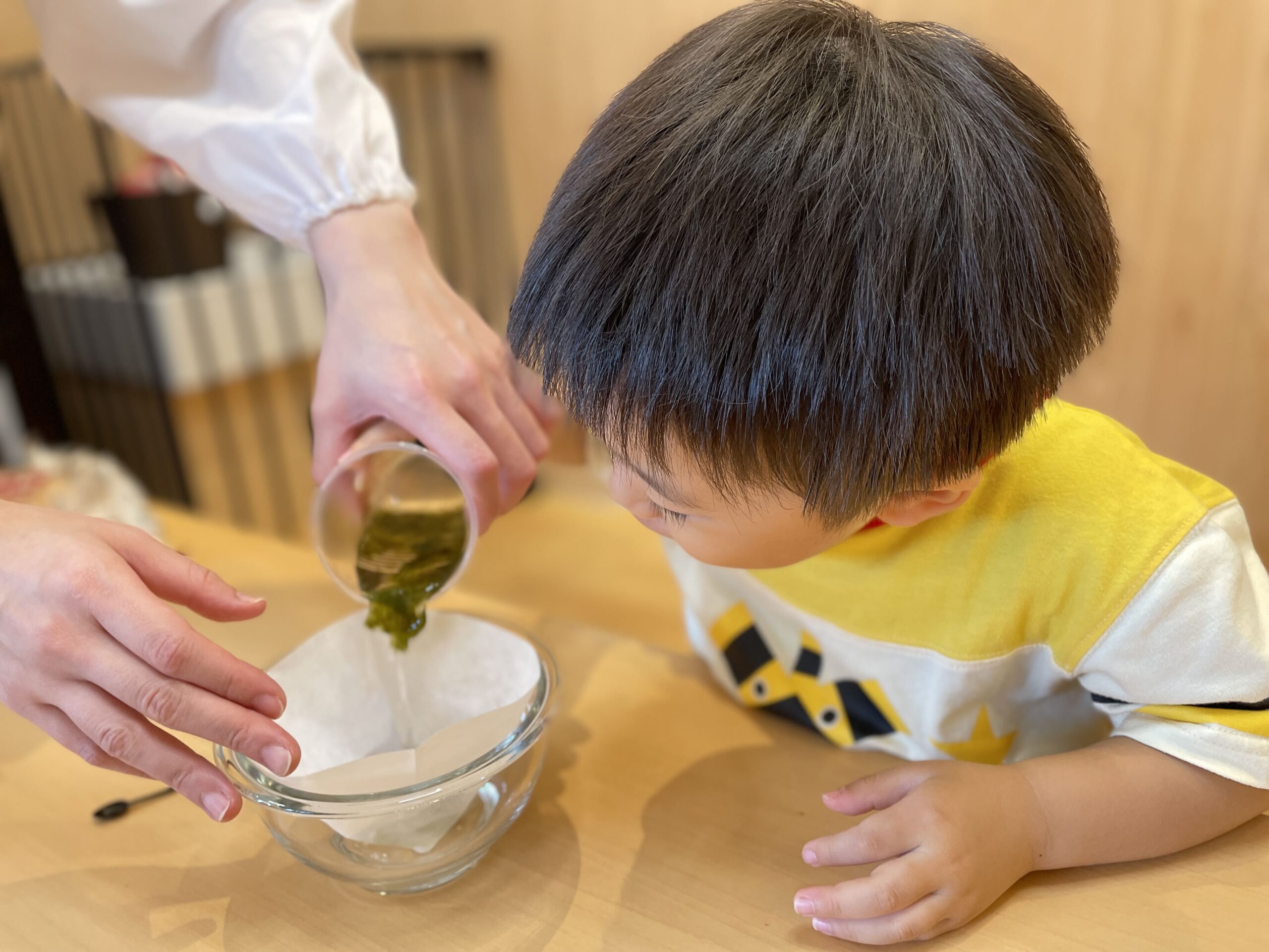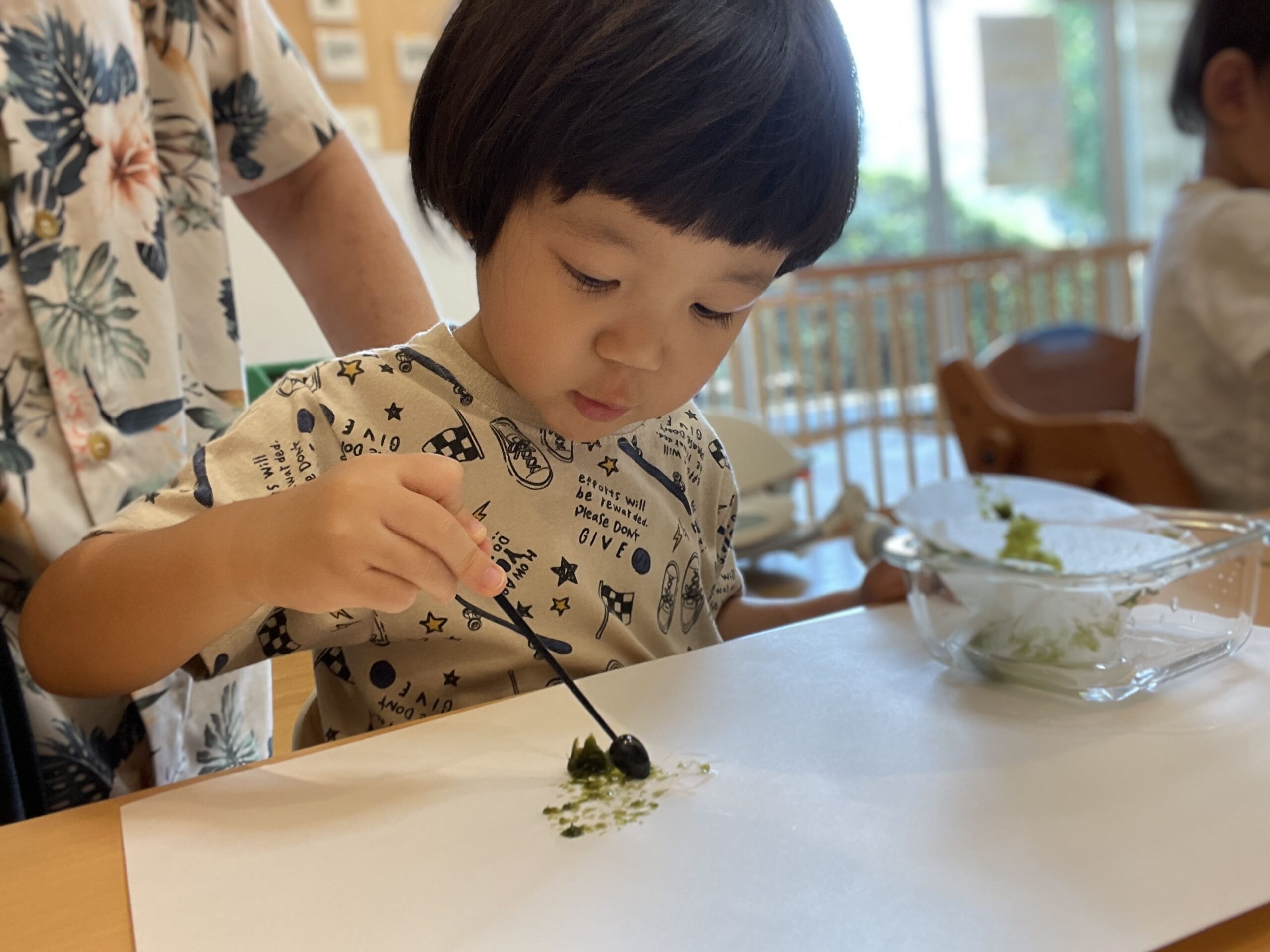 最後は、この“海苔エキス”を使ったお絵描きタイムです。画用紙にとろとろになった海苔をスプーンで塗ってみました!乾いたあとは優しい深緑色の模様が浮かび上がり、「葉っぱみたい」「木の模様みたいだね」とクリエイティブな発想がどんどん広がっていきます!実験からアートまで一連の流れを体験することで、子どもたちは集中力と探究心を同時に伸ばすことができました。