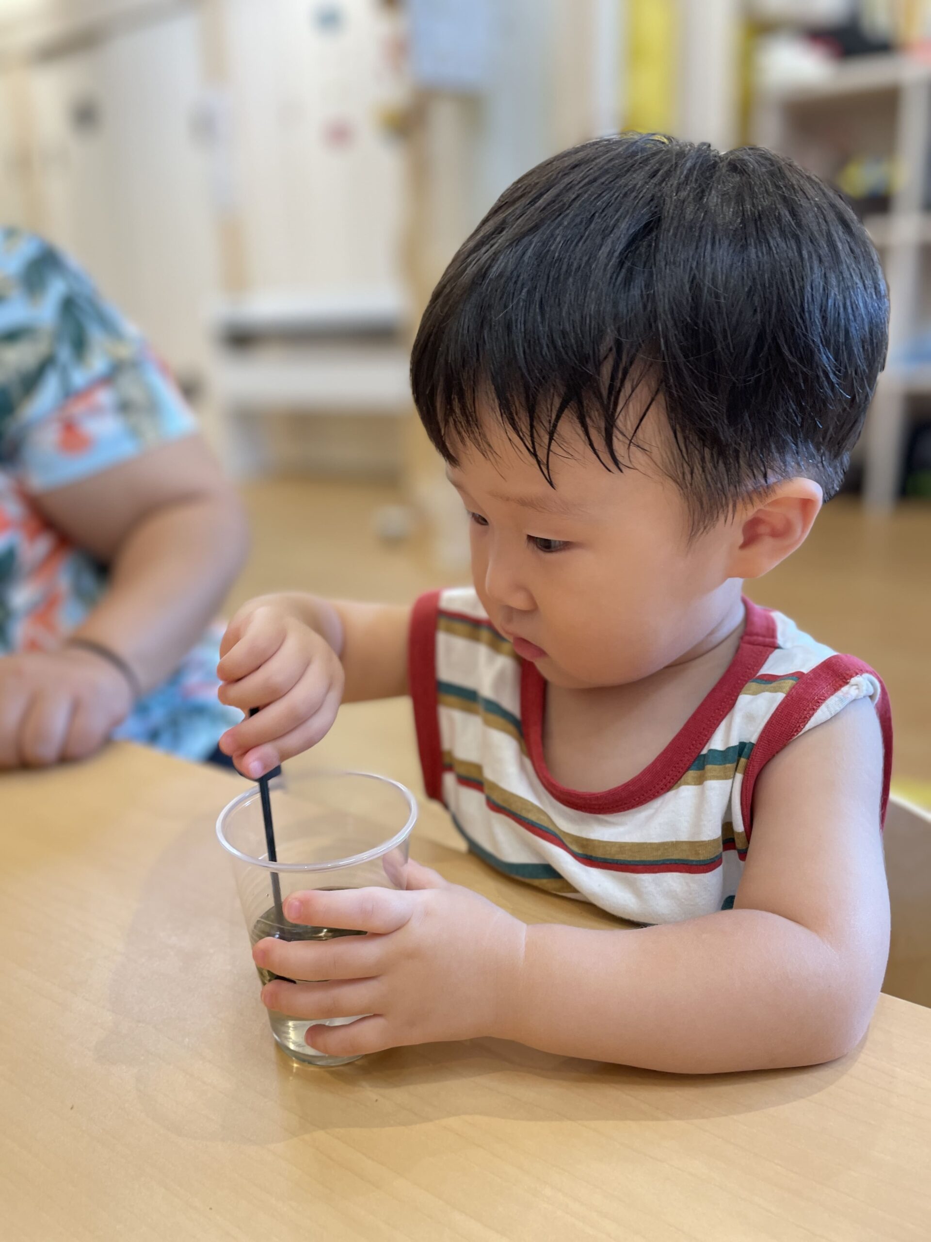 スプーンでゆっくりかき回すと、だんだんと茶色い水に変化。「これ、海の色みたい!」「お茶みたいな色だね」と話しながら、化学の不思議に夢中です。