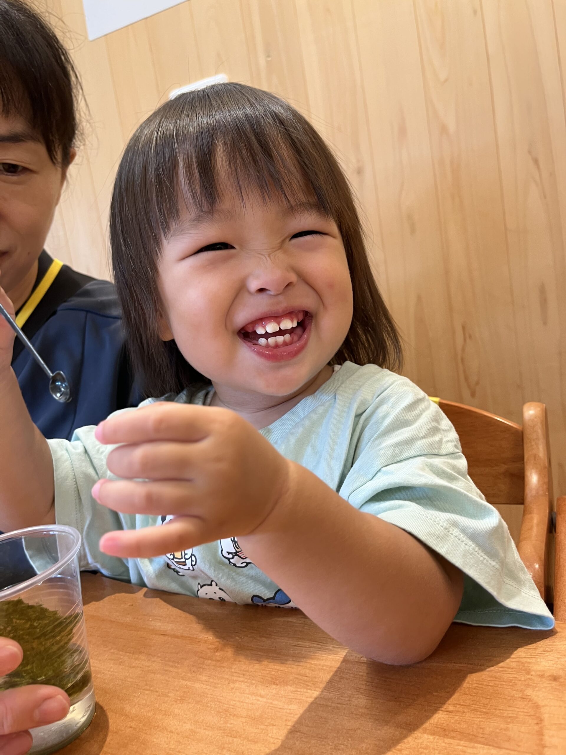 最後は、この“海苔エキス”を使ったお絵描きタイムです。画用紙にとろとろになった海苔をスプーンで塗ってみました!乾いたあとは優しい深緑色の模様が浮かび上がり、「葉っぱみたい」「木の模様みたいだね」とクリエイティブな発想がどんどん広がっていきます!実験からアートまで一連の流れを体験することで、子どもたちは集中力と探究心を同時に伸ばすことができました。