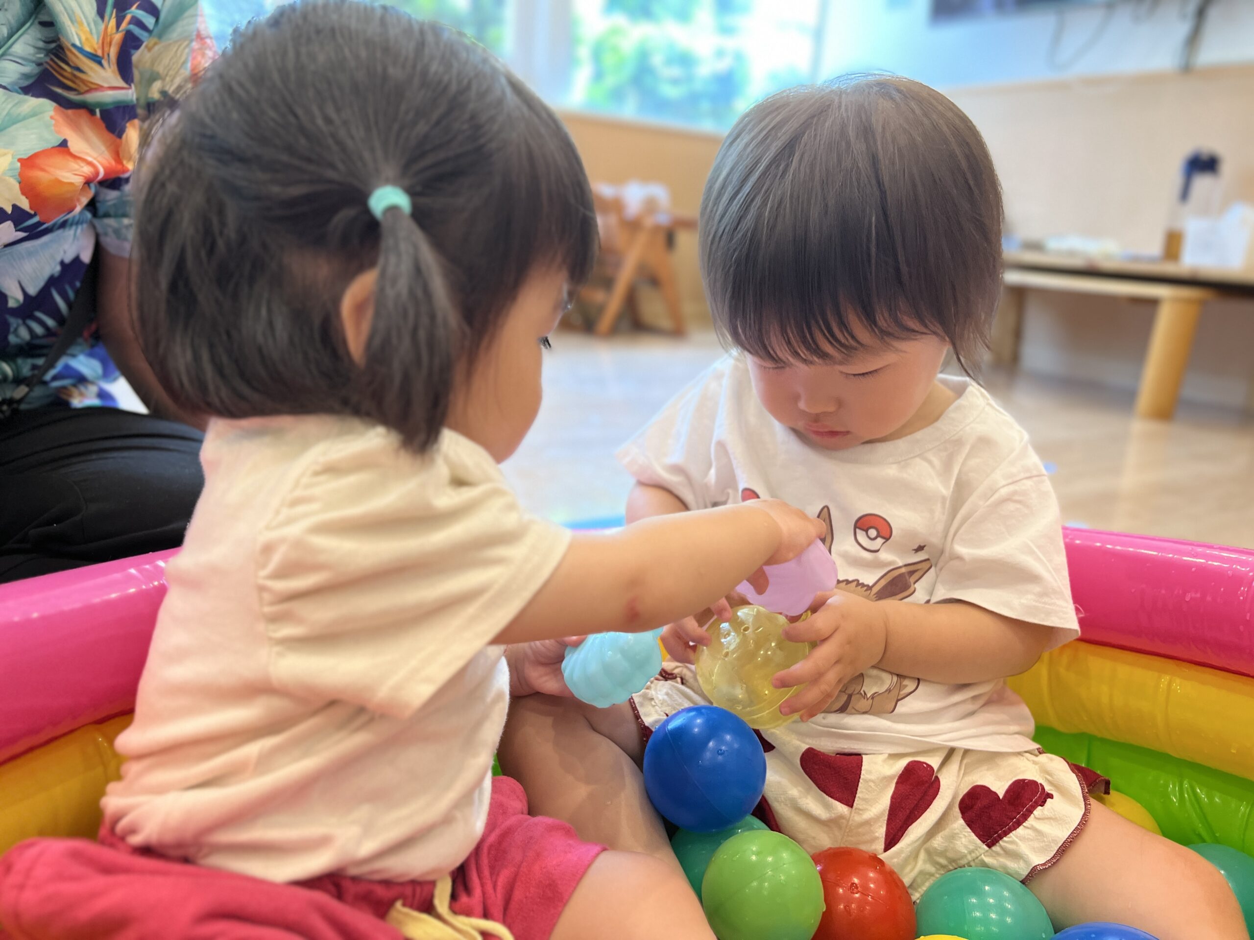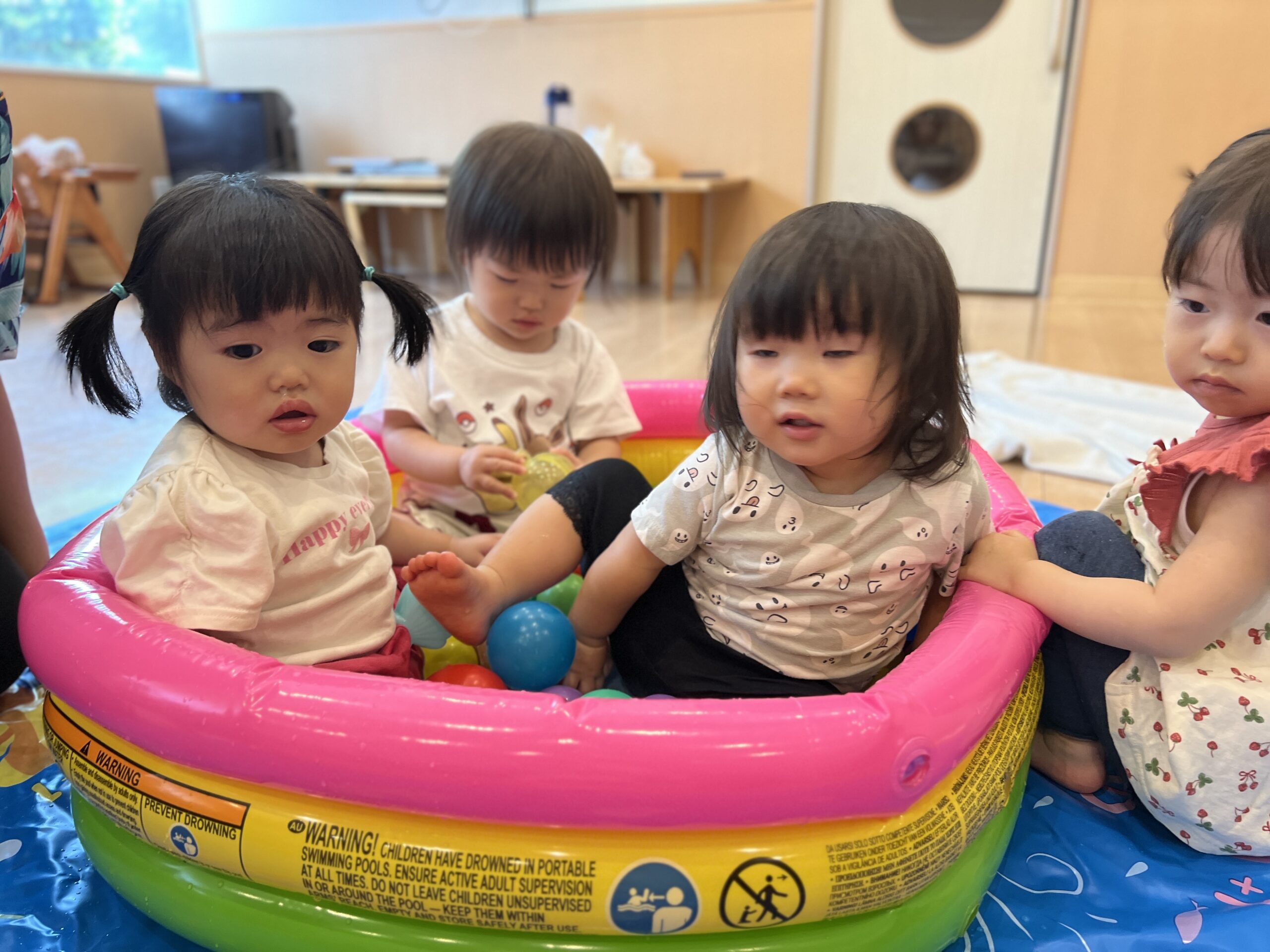 まず、小さなお友達(0・1歳児クラス)は、お部屋に登場した特製カラーボールプールに大興奮!