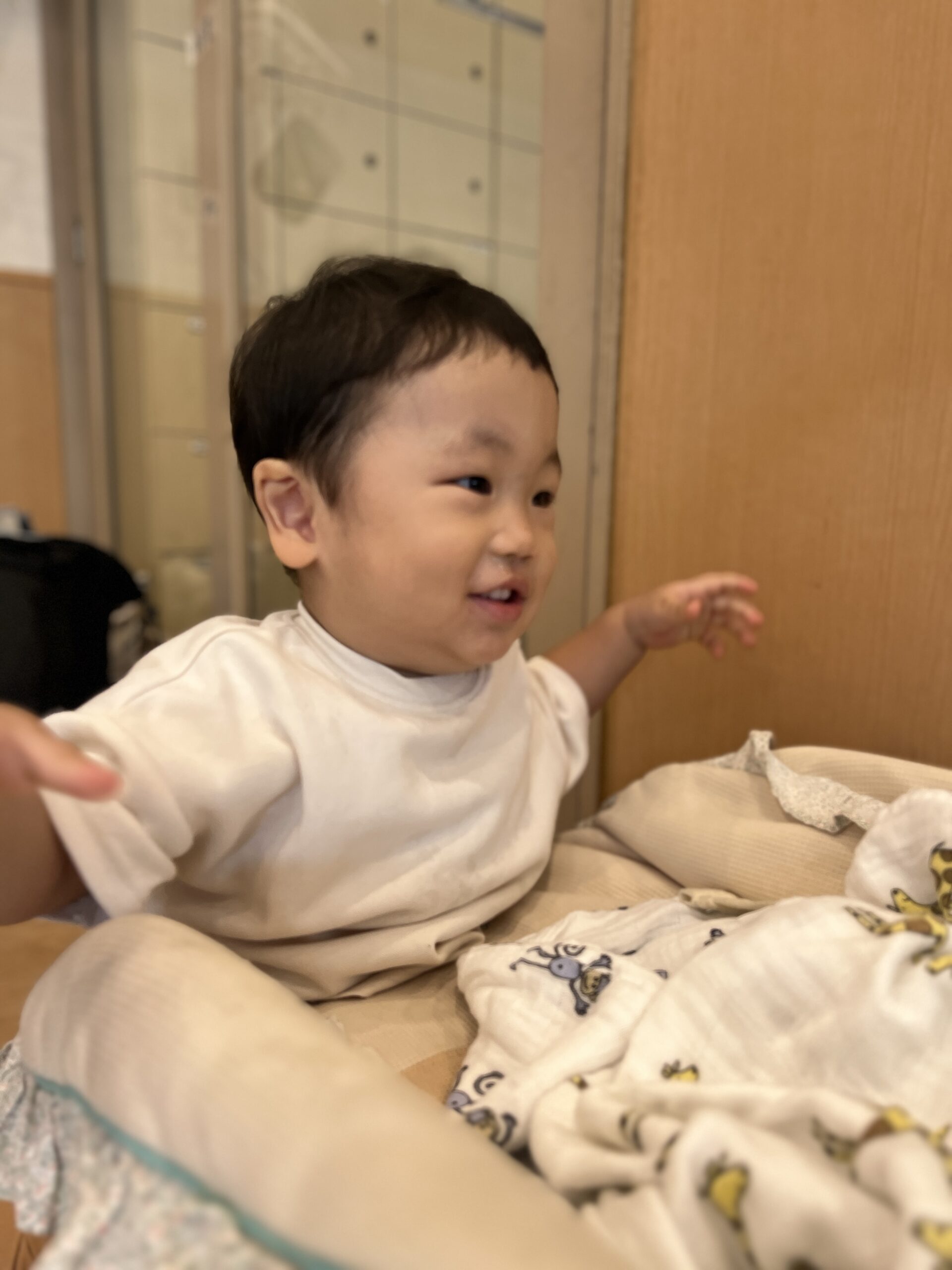 「気持ちいいね!フワフワだね」と先生が声をかけると、にっこり「笑顔」で答えてくれました。