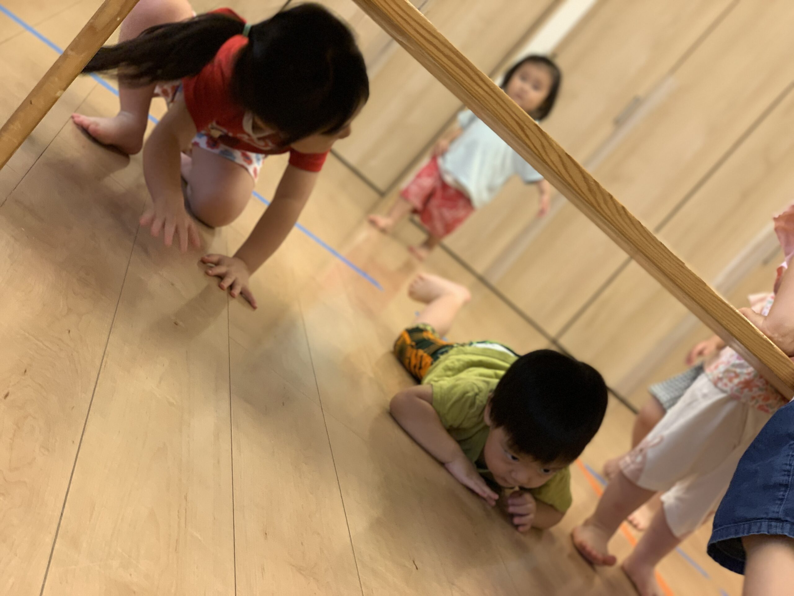 一方、大きなお友達(1・2歳児クラス)は、室内で体育遊びに挑戦!