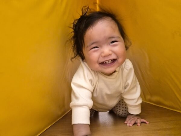 お留守番の0歳さんは黄色マットのトンネルに挑戦。とっても嬉しそうにくぐっていました。