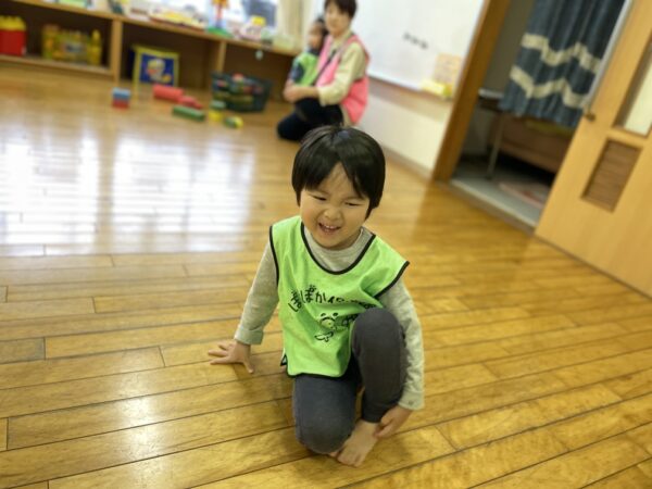 今日は雨のなか、バスに乗って児童館へ。先生が「バスではお口はお休み、手はおひざね」と伝えると、「はーい!」と元気なお返事。窓のしずくを見ながら「ぽたぽた」「つー」と言葉が広がり、「次の停留所で降りるよ」の合図で立つ練習も。到着したら「傘はたたんで、しっかり歩こう」と声をかけ、足元の水たまりに「きらきら!」。雨の日ならではの発見を楽しみつつ、ゆっくり児童館に入りました。