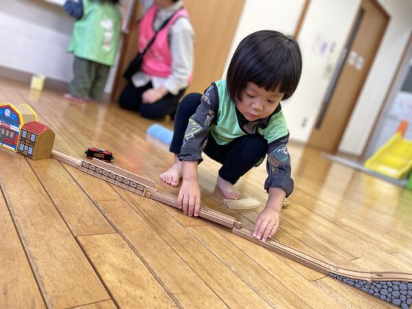 木の線路では、2歳さんが「つながった!」と満足の表情。先生が「カーブはどうする?」に「こう!」とパーツを回して形を調整。1歳さんは「でんしゃ、しゅっぱつ!」と走らせ、交差で「こんにちは」。先生が「順番で通るよ」と伝えると、「どうぞ」「ありがとう」のやりとりが自然に出てきました。つなぐ・走らせる・止めるを繰り返すなかで、見通しとルールが育っていきます。