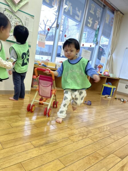 赤ちゃん人形のベビーカーコーナーでは、「ベビーちゃん、いくよー」とお世話モード。先生が「段差はゆっくり、タイヤはまっすぐね」と伝えると、「まっすぐ!」と意識して押す姿。