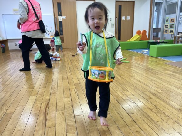 太鼓のおもちゃでは、1歳さんが「トン、トン」と歩きながら上手にリズム。先生が「足はゆっくり、手は元気!」とイメージを伝えると、「ゆっくりトン!」とテンポがそろってきます。