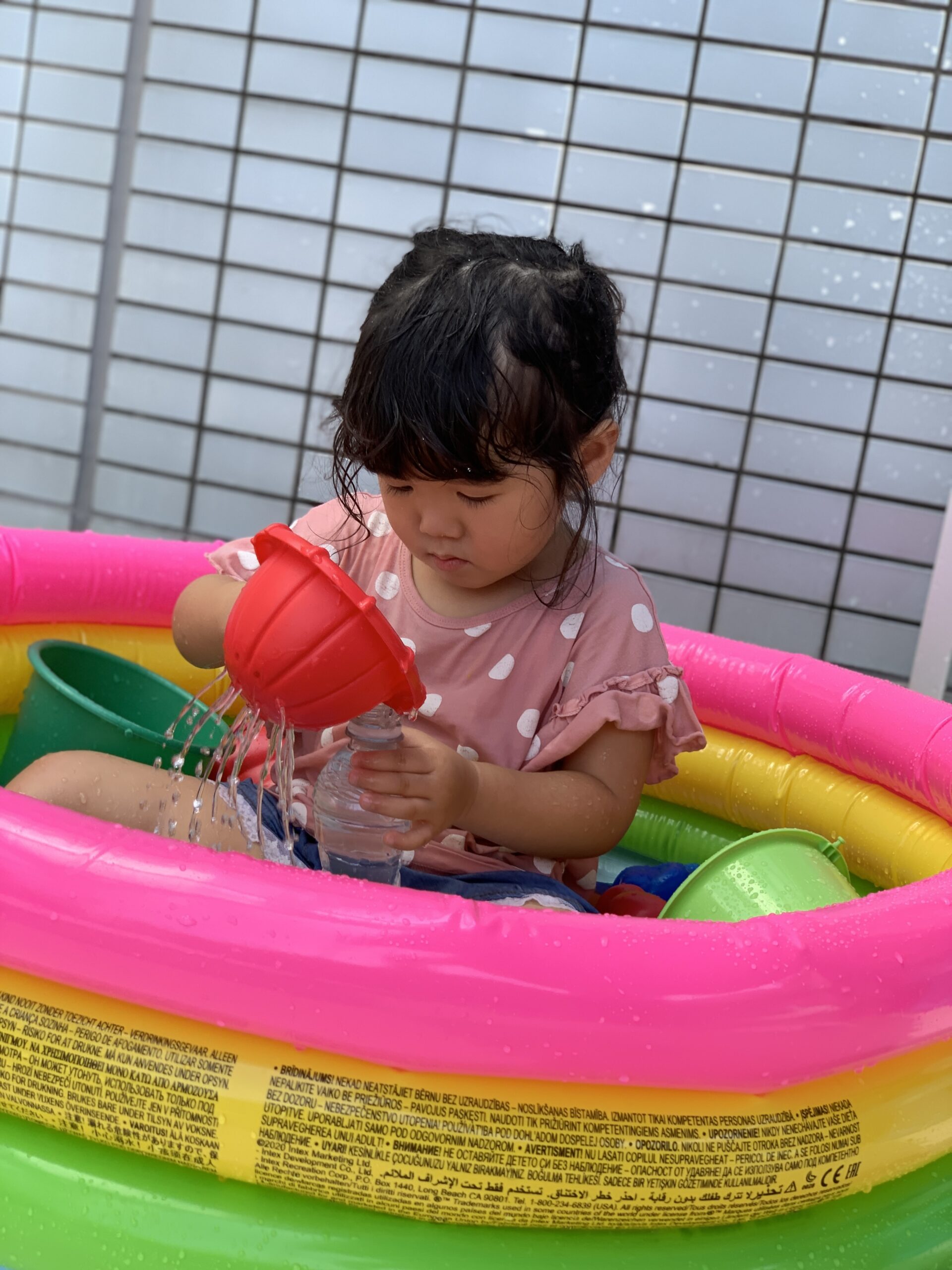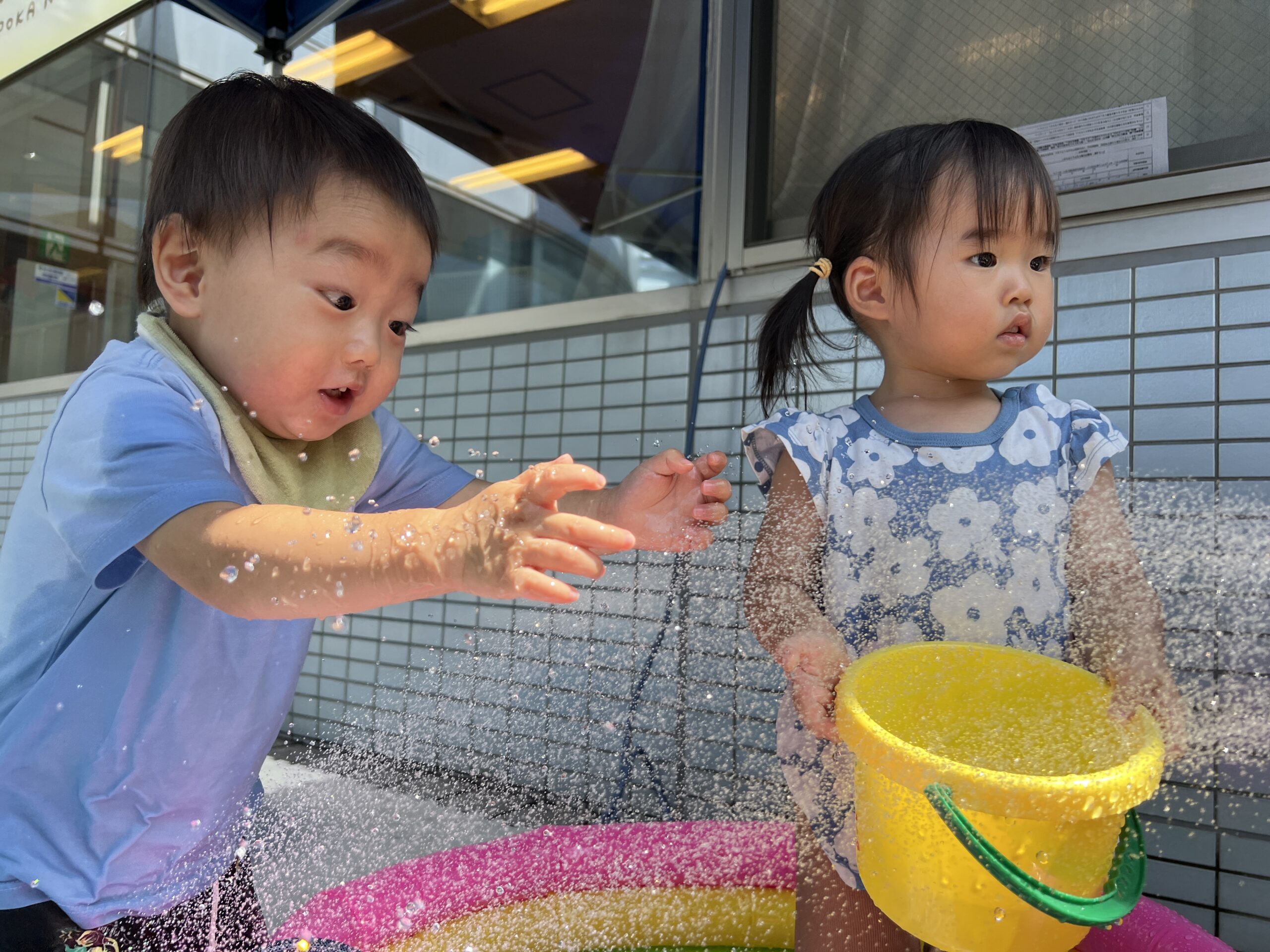 プールやタライに入ると、「つめたーい!」「きもちいい!」と「喜び」の声が響き渡ります。