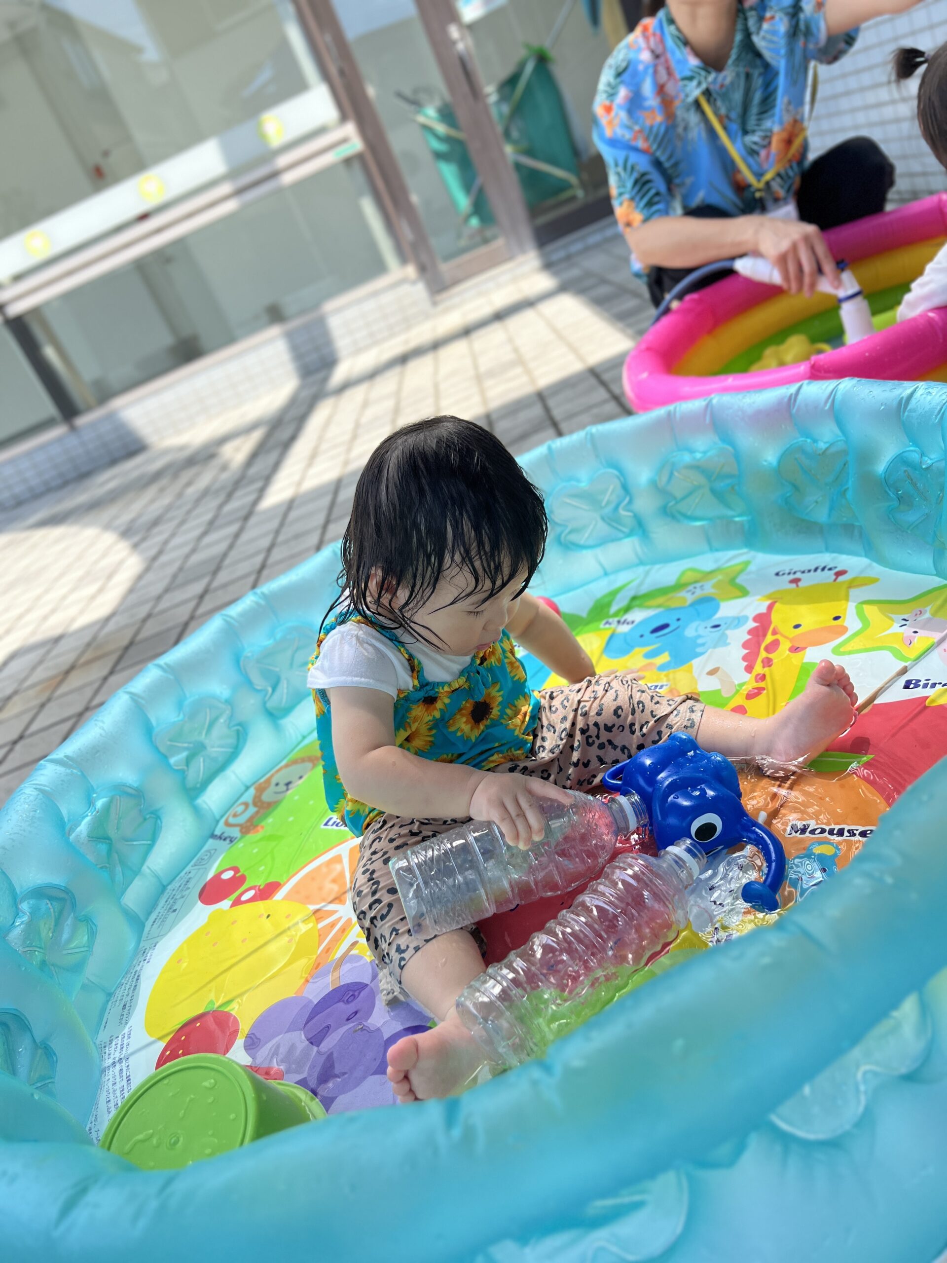 まずは、小さいお友達(0・1歳児クラス)から、テラスでの水遊びがスタート!