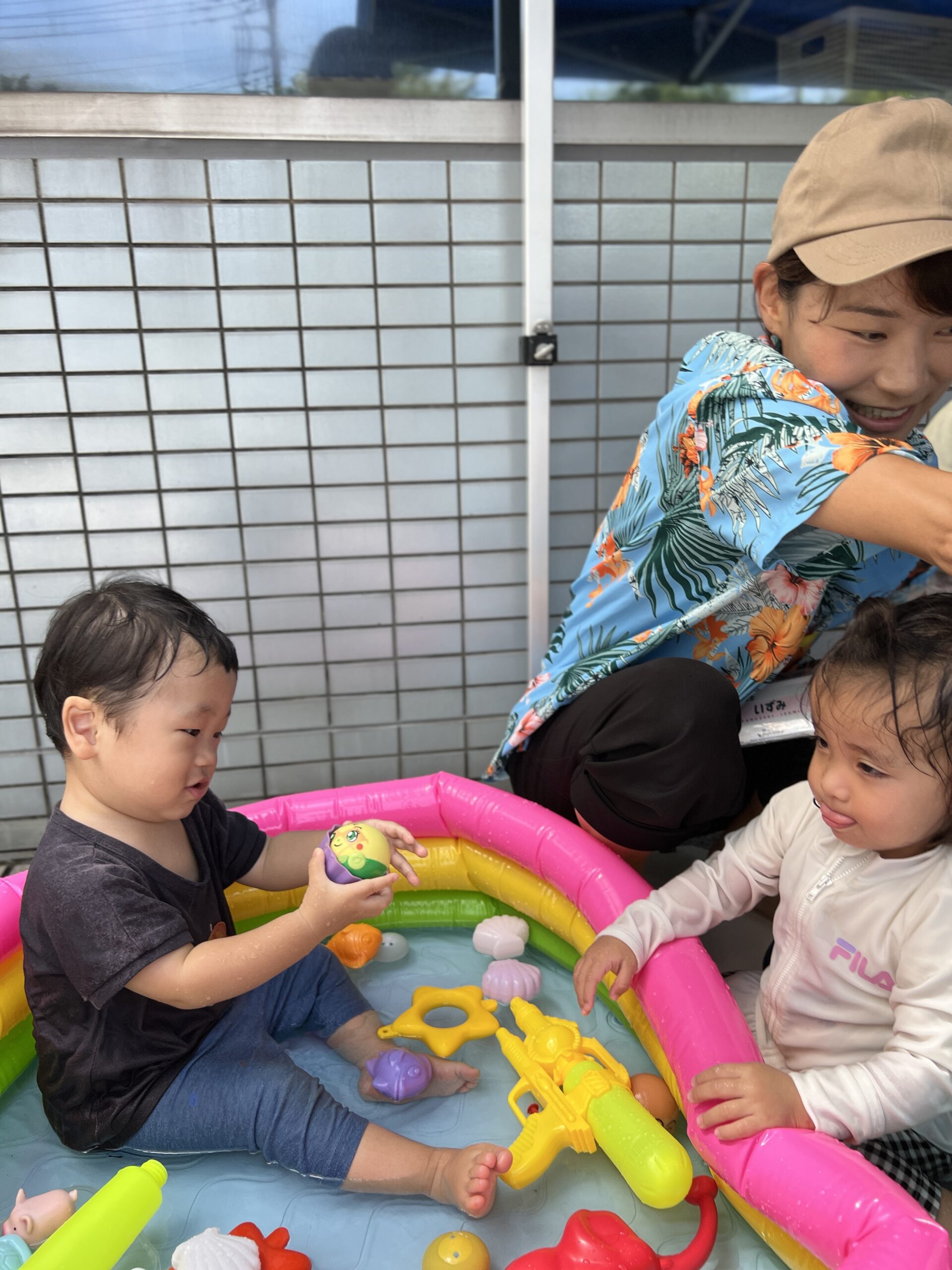 魚のおもちゃをすくってみたり、水鉄砲で遠くまで水を飛ばしてみたり。