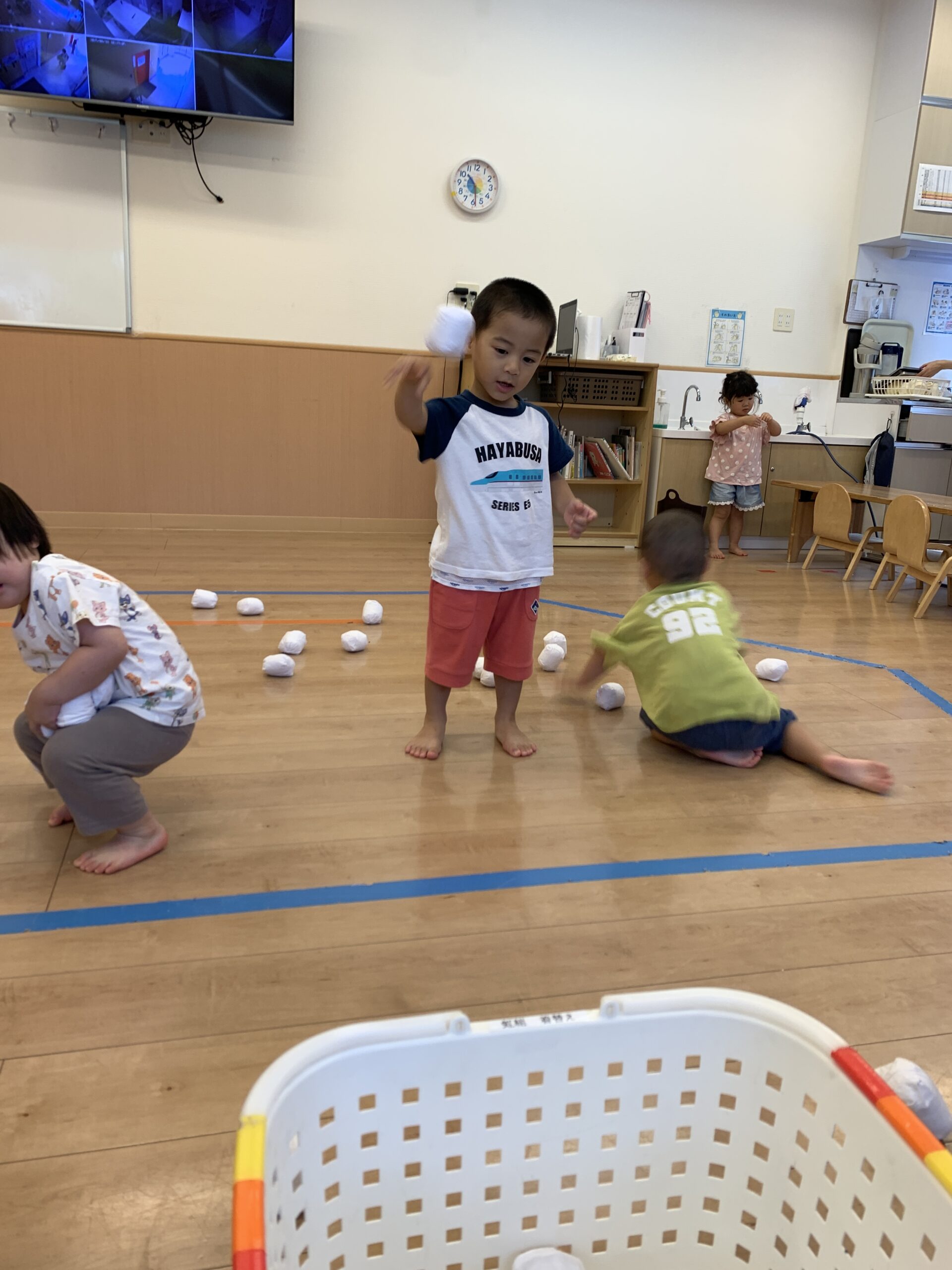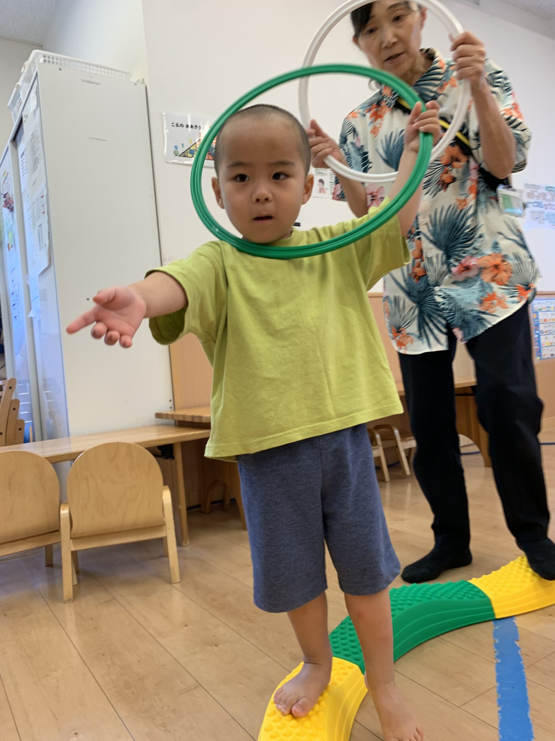 その頃、大きいお友達(2歳児クラス)は、保育室で安田式体育遊びに挑戦!