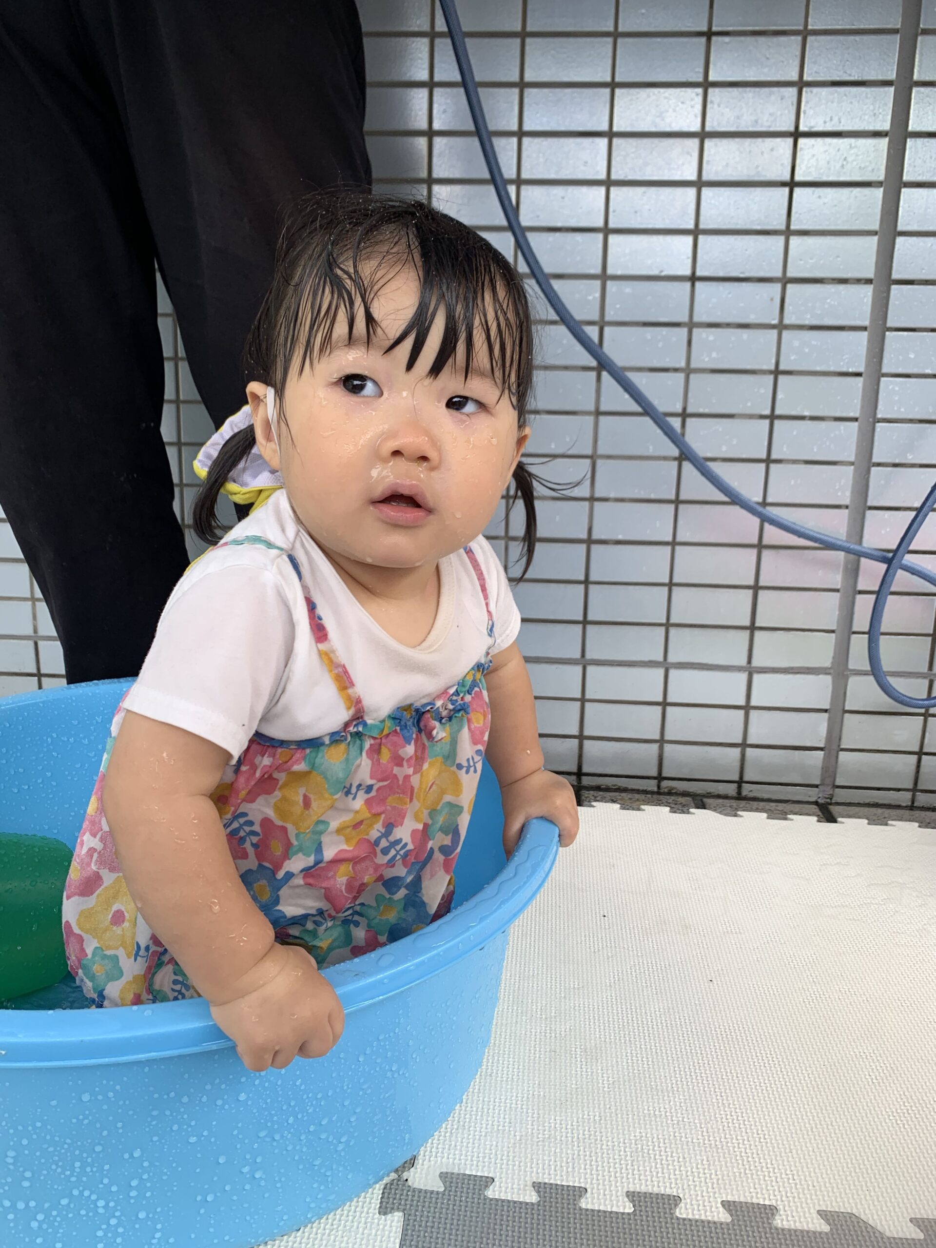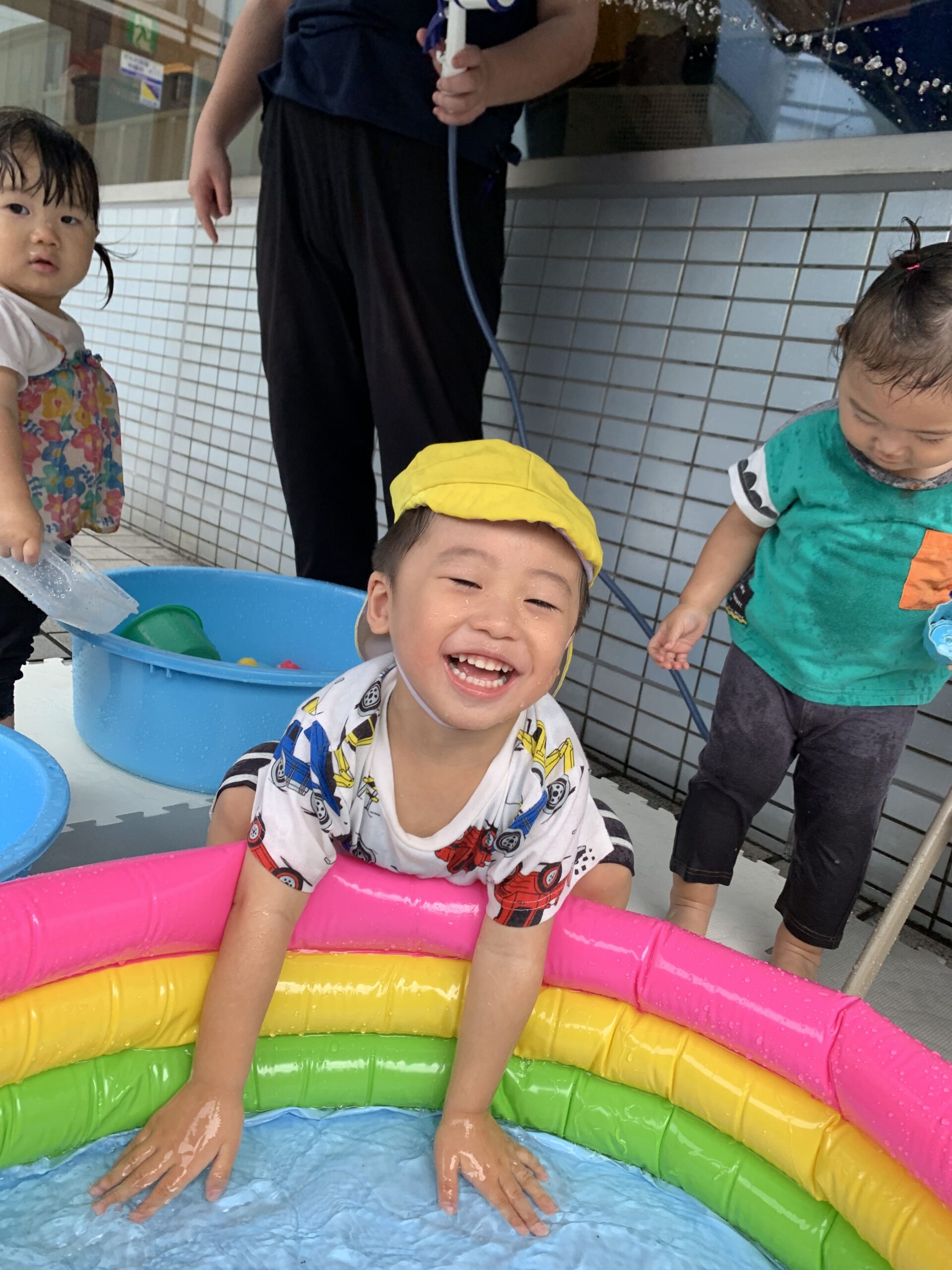 「もっとかけて!」と友だち同士で水をかけ合ったり、バケツリレーの要領で小さな水のトンネルを作ったり。自分からプールに足を入れてバチャバチャと躊躇なく遊ぶ姿に、思い切り体を動かす心地よさや仲間とのやりとりを楽しむ様子が伺えます。水面の光を目で追い、指先で触れる感覚を確かめながら、五感をフル活用したダイナミックな遊びになりました。